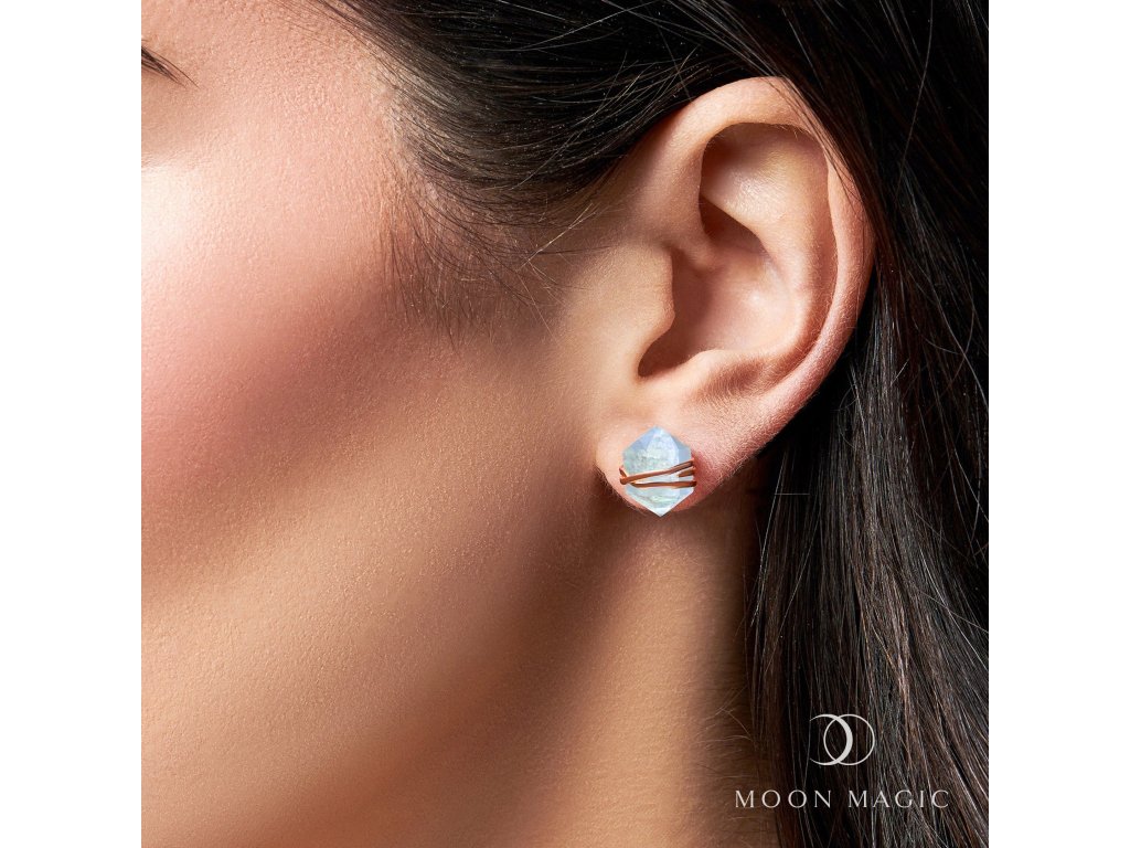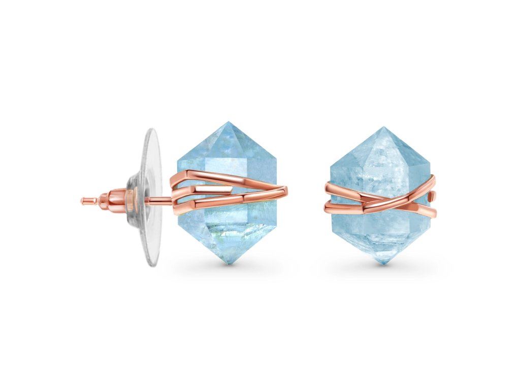- Kôstkové náušnice v dizajne neopracovaného drahokamu akvamarín zdobené 14k ružovým zlatom Vermeil. Originálny dizajn náušníc, kvalitné spracovanie a materiál, ručne dokončené.