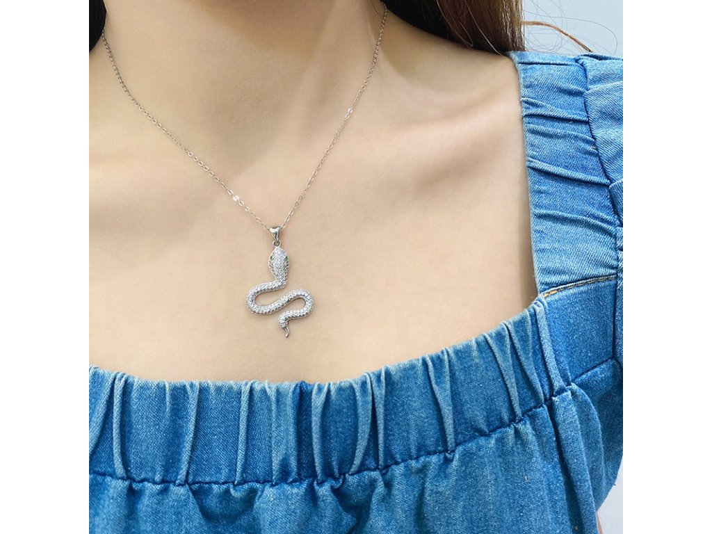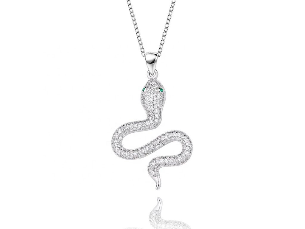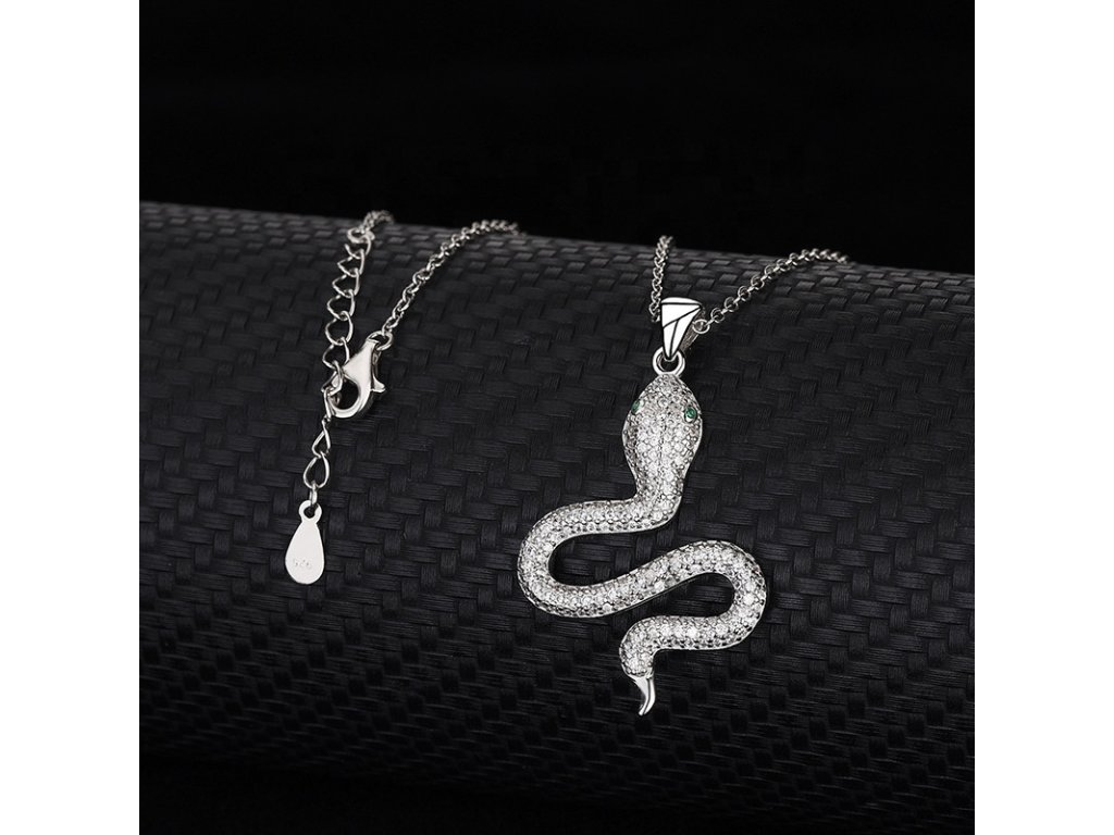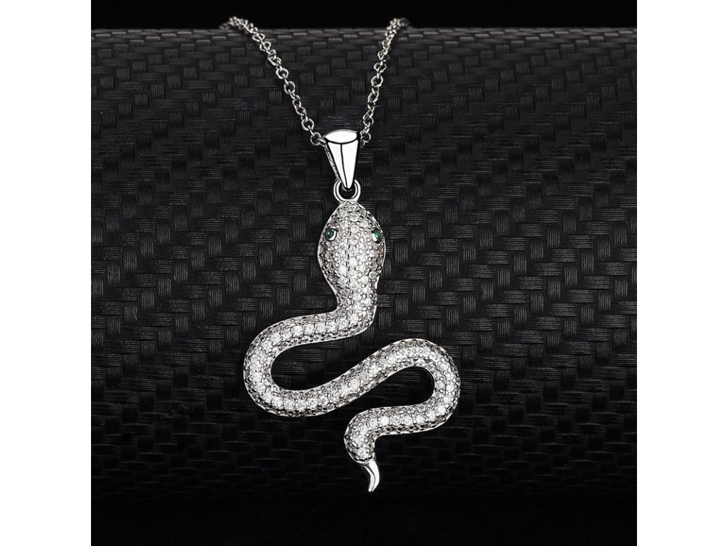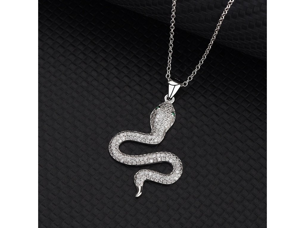 - Strieborný rhodiovaný náhrdelník v dizajne hada zdobeného ručne posádzanými zelenými a čírymi trblietavými zirkónmi. Originálny dizajn náhrdelníka, kvalitné spracovanie a materiál, ručne dohotovené.