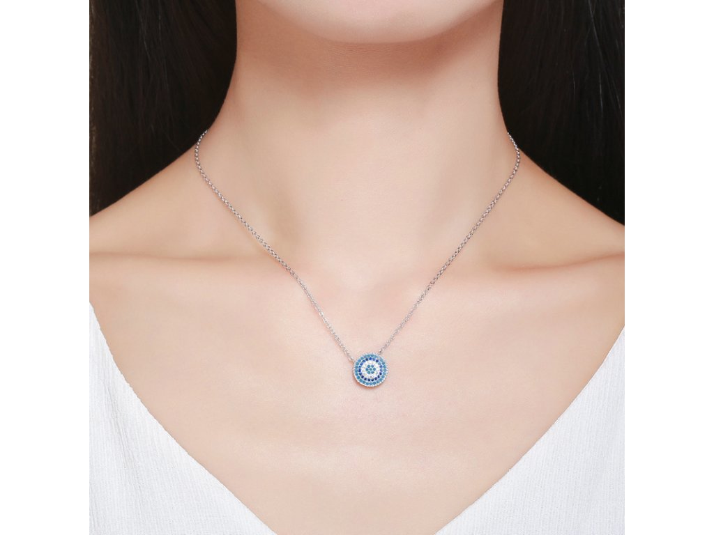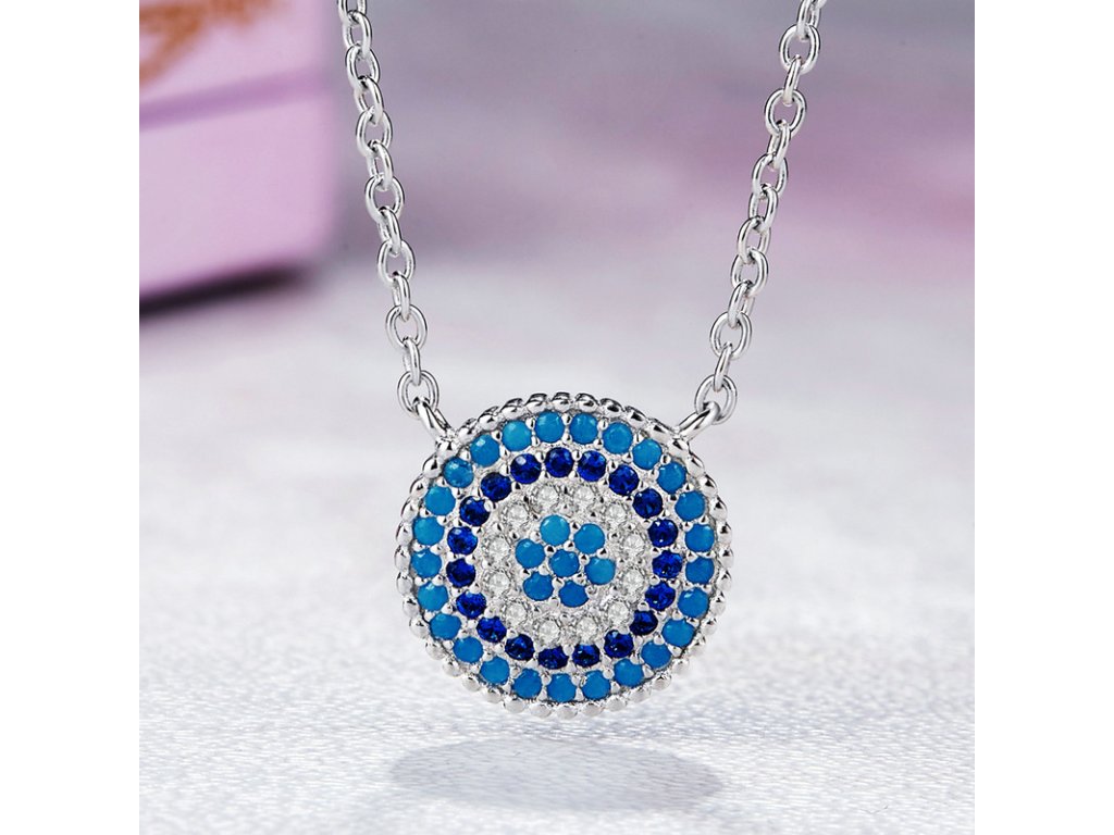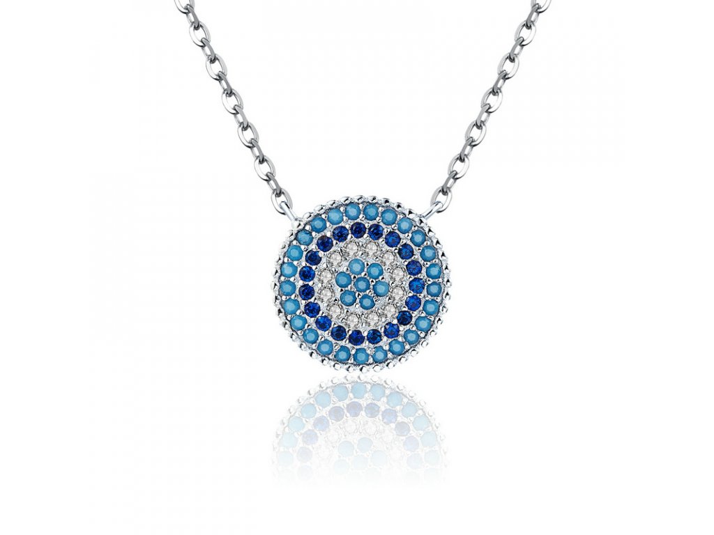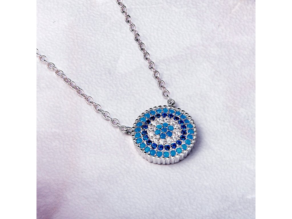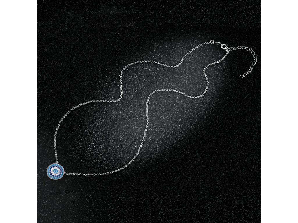 - Strieborný náhrdelník v dizajne Symbolu ochrany zdobeného modrými a čírymi trblietavými zirkónmi. Originálny dizajn náhrdelníka, kvalitné spracovanie a materiál, ručne dohotovené.