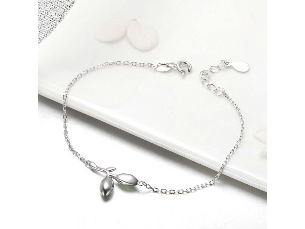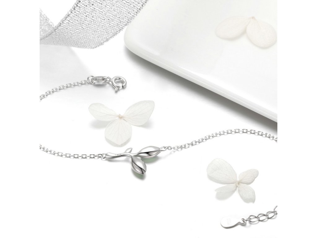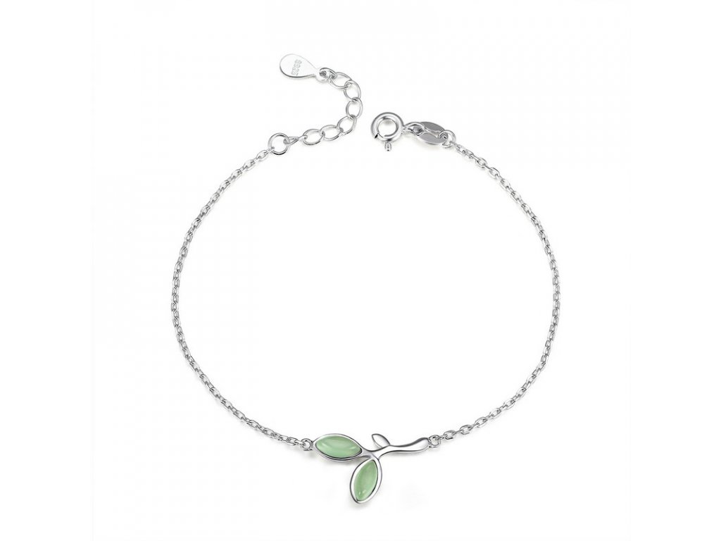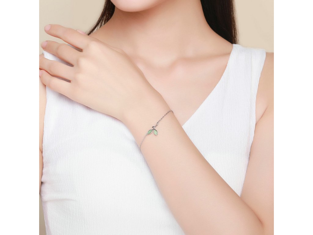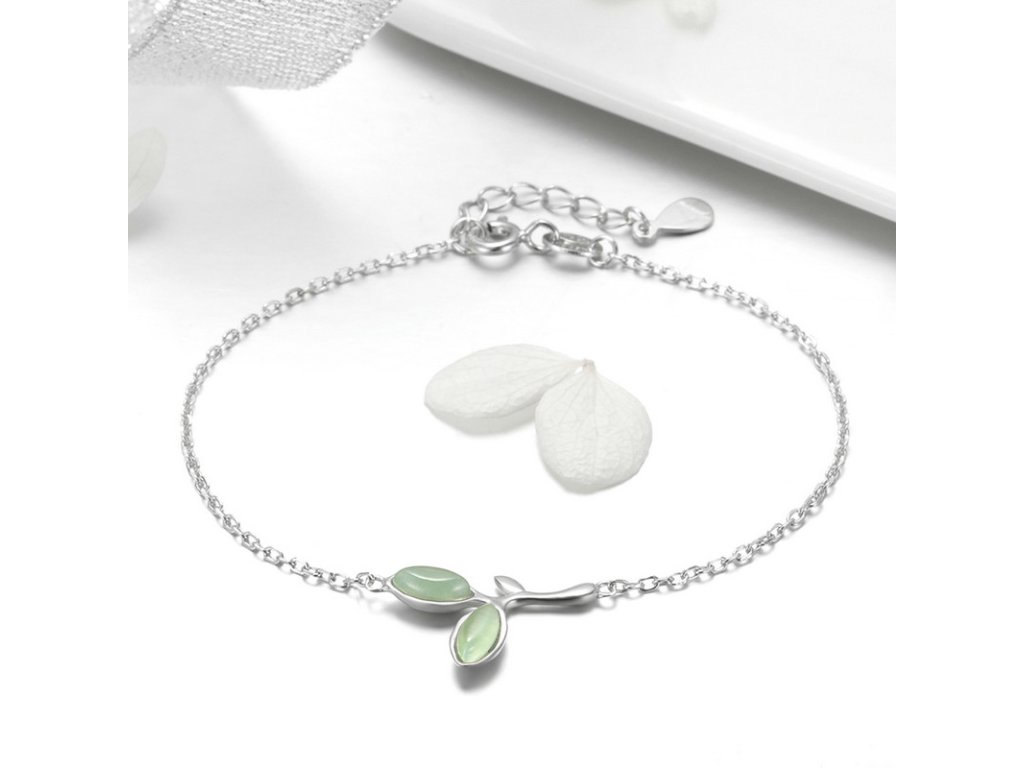 - Jemný strieborný náramok v dizajne nádychu prírody doplnený lístky s ručne posiatym opál zelenej farby.