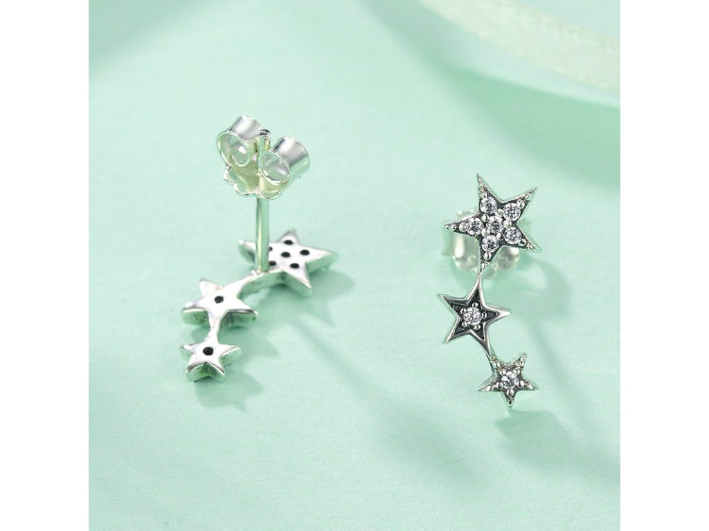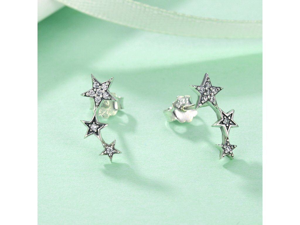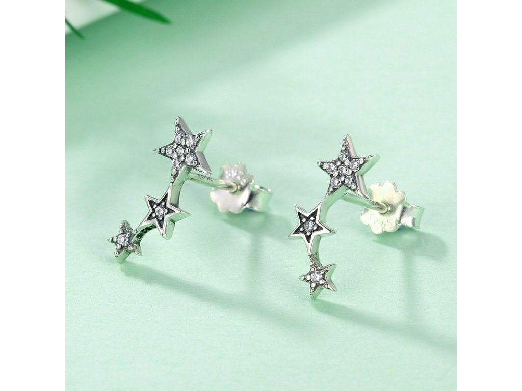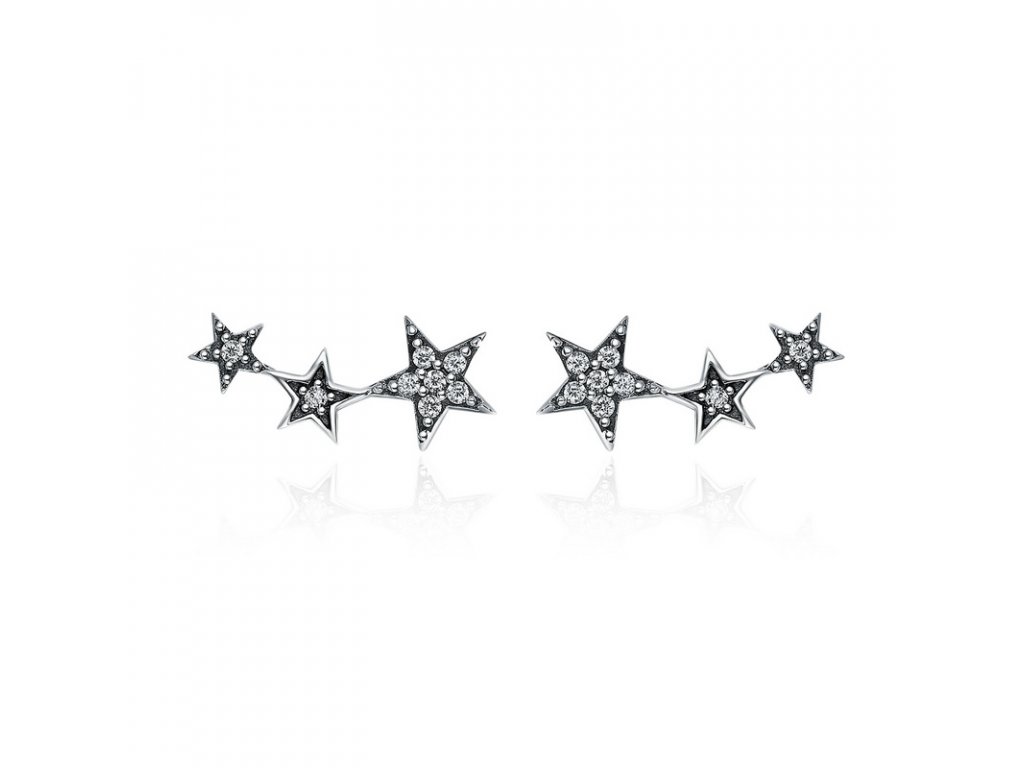 - Luxusné a módne náušnice zo striebra v dizajne hviezd posádzaných trblietavými kameňmi v podobe zirkónov.