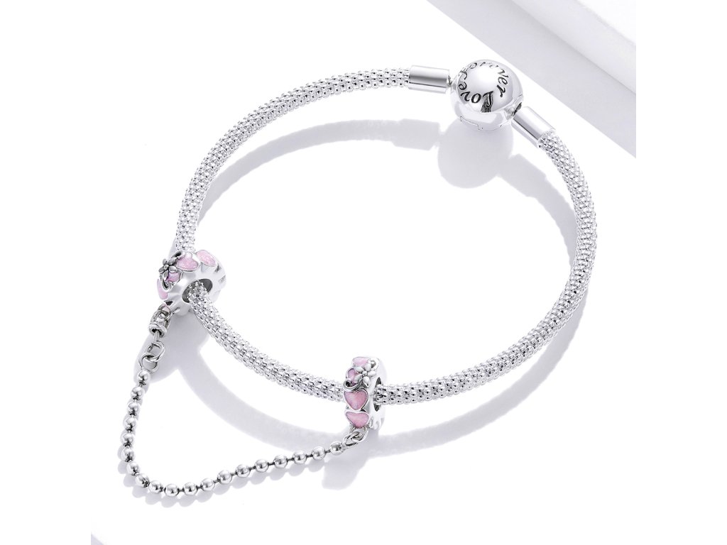 - Strieborný prívesok alebo bezpečnostný retiazka na náramok v dizajne Pole milovaných ružových sŕdc zdobených kvetmi a ručne nanášanou lesklo ružovou glazúrou. Retiazka je riešená neobvykle jemnými a elegantnými striebornými guličkami. Originálny design prívesku, kvalitné spracovanie a materiál, ručne dohotovené.