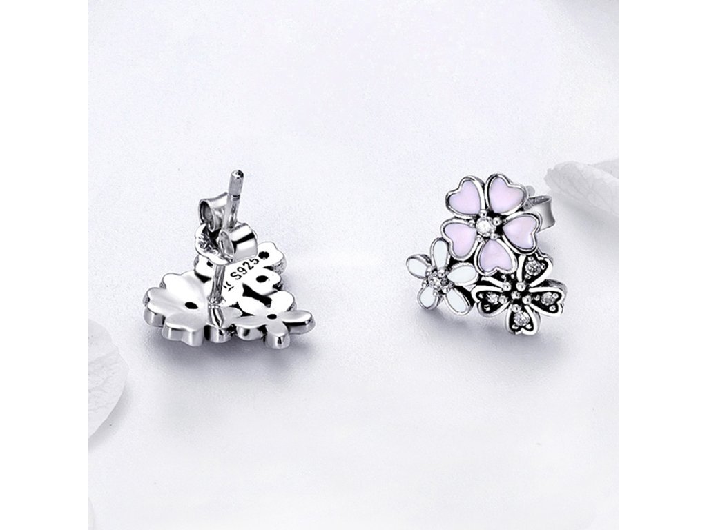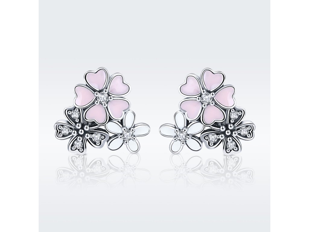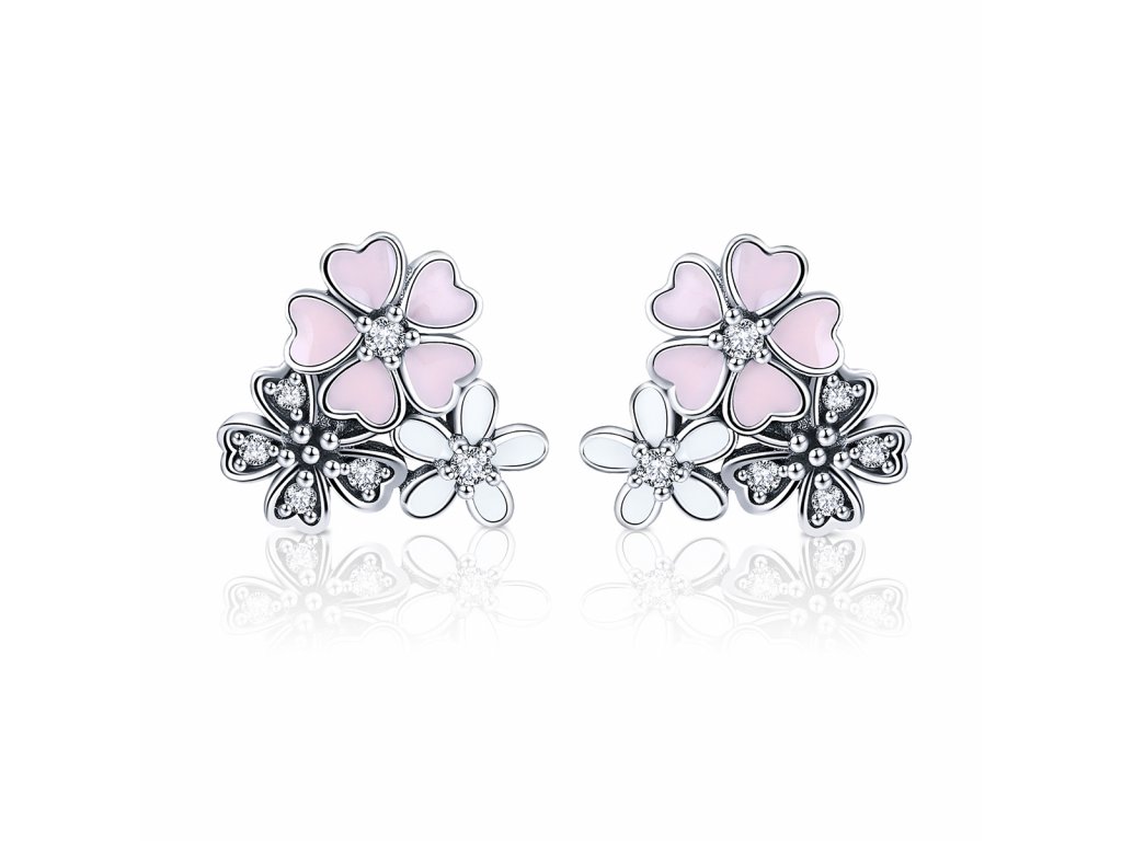 - Strieborné prepracované kôstkové náušnice zdobené čírymi trblietavými zirkónmi a ručne nanášanou ružovou a bielou glazúrou. Originálny dizajn náušníc, kvalitné spracovanie a materiál, ručne dokončené.