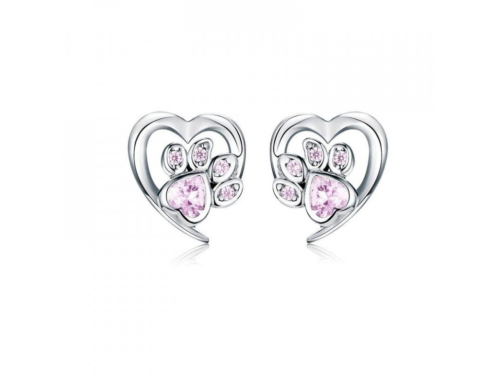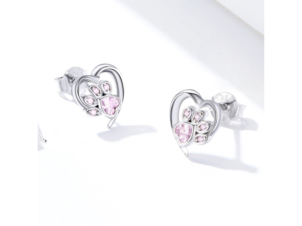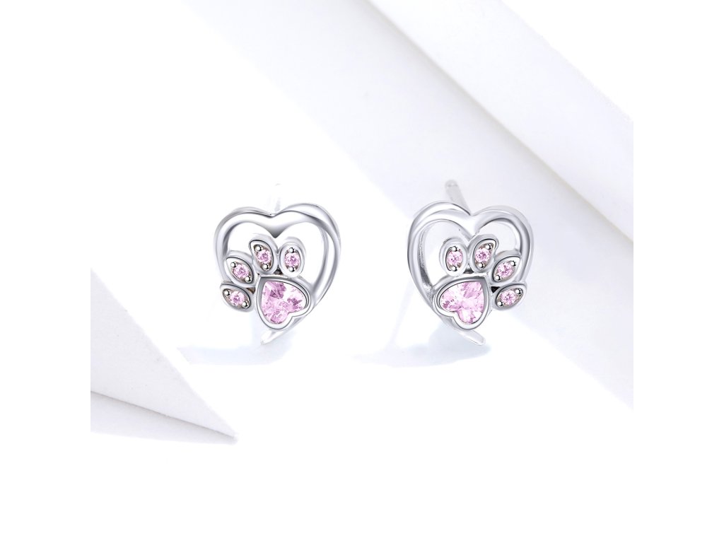 - Strieborné kôstkové náušnice v dizajne milovanej packy / labky zdobené svetlo ružovými trblietavými zirkónmi. Originálny dizajn náušníc, kvalitné spracovanie a materiál, ručne dokončené.