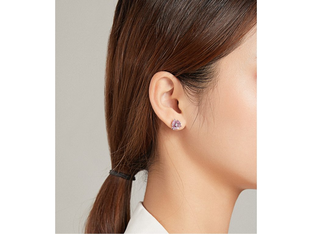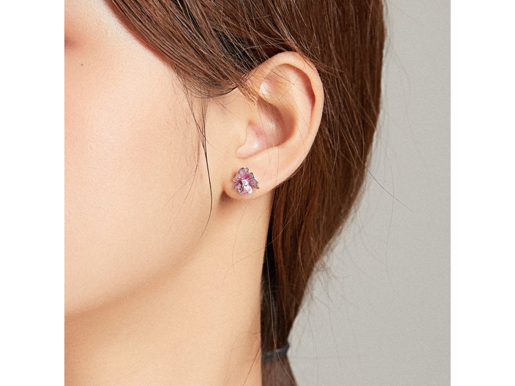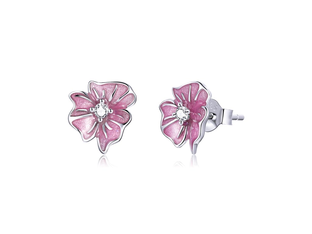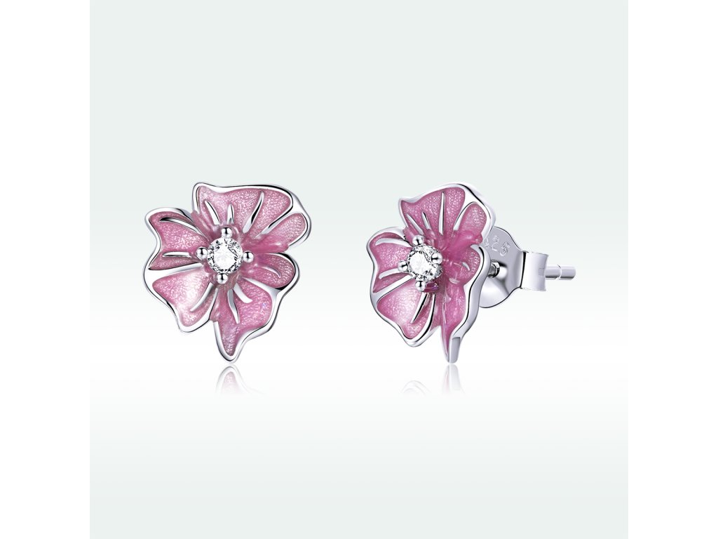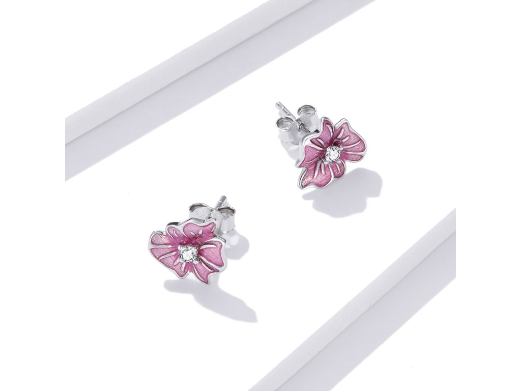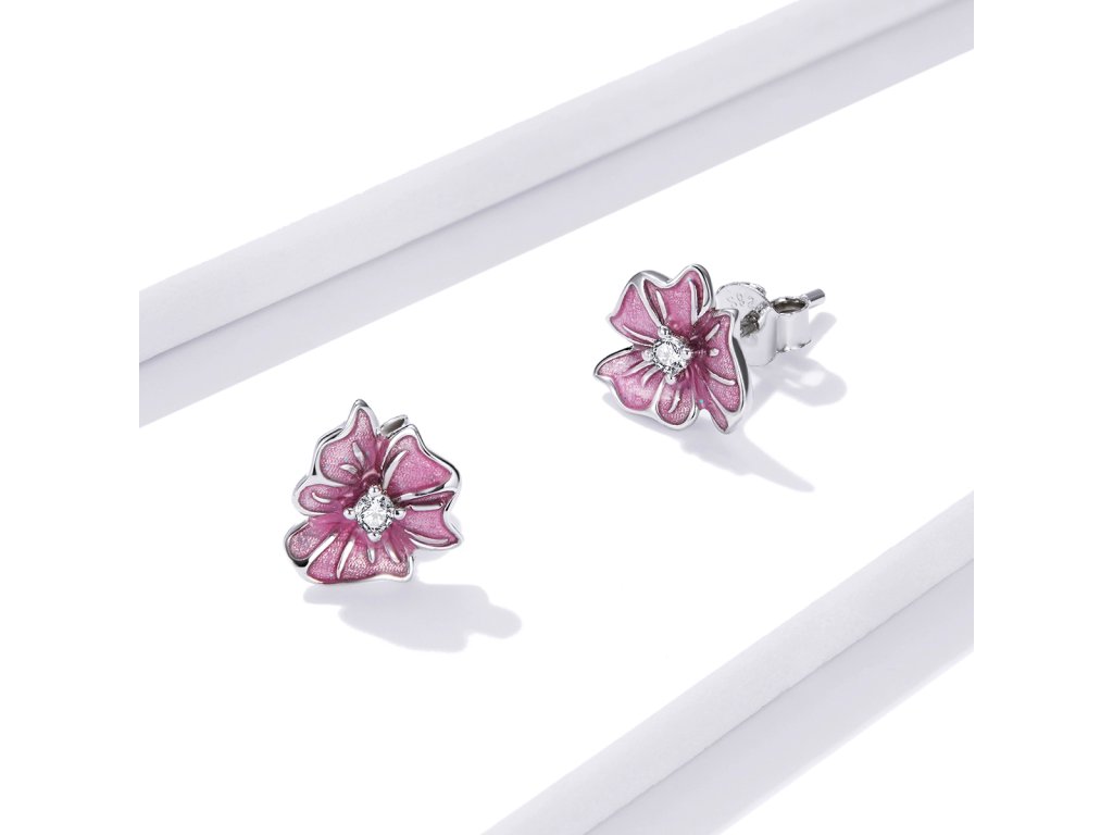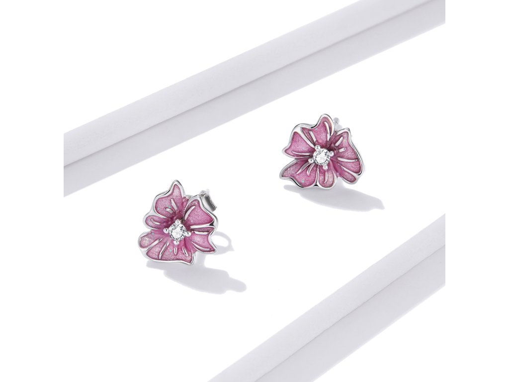 - Strieborné kôstkové náušnice v dizajne Rozkvitnutých kvetov zdobených čírymi trblietavými zirkónmi a ručne nanášanou lesklo ružovou glazúrou. Originálny design náušníc, kvalitné spracovanie a materiál, ručne dohotovené.