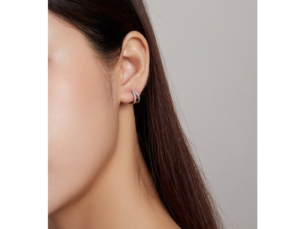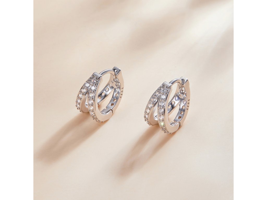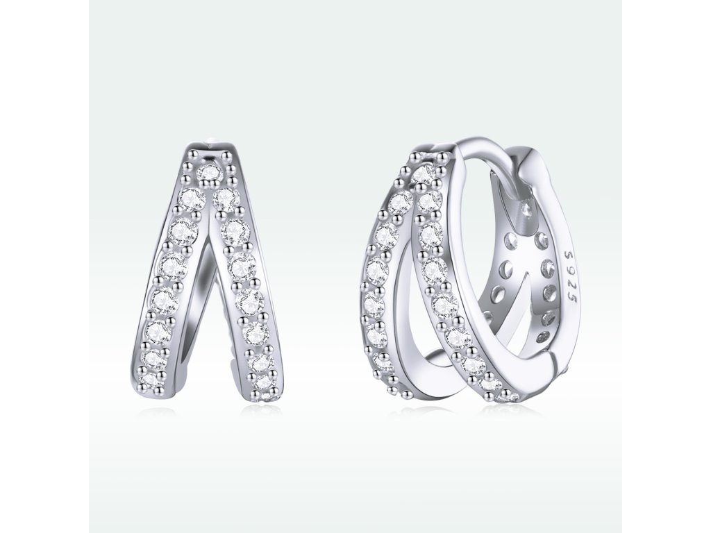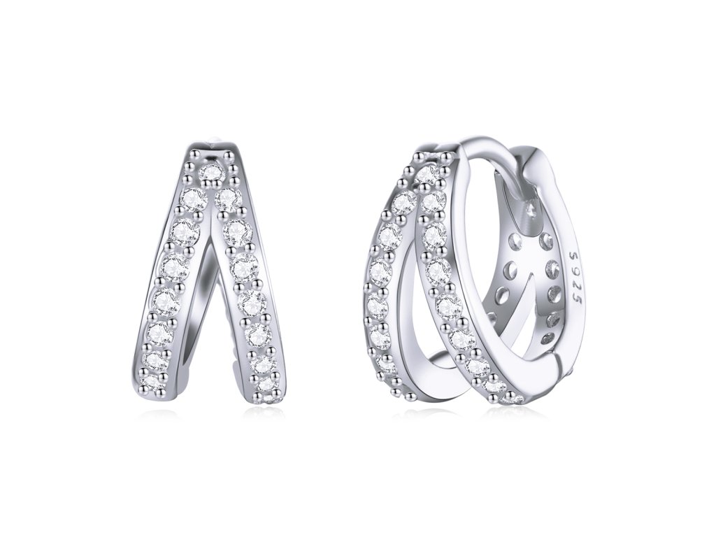 - Strieborné elegantné kruhové náušnice zdobené trblietavými kameňmi v podobe čírych zirkónov. Originálny design náušníc, kvalitné spracovanie a materiál, ručne dohotovené.