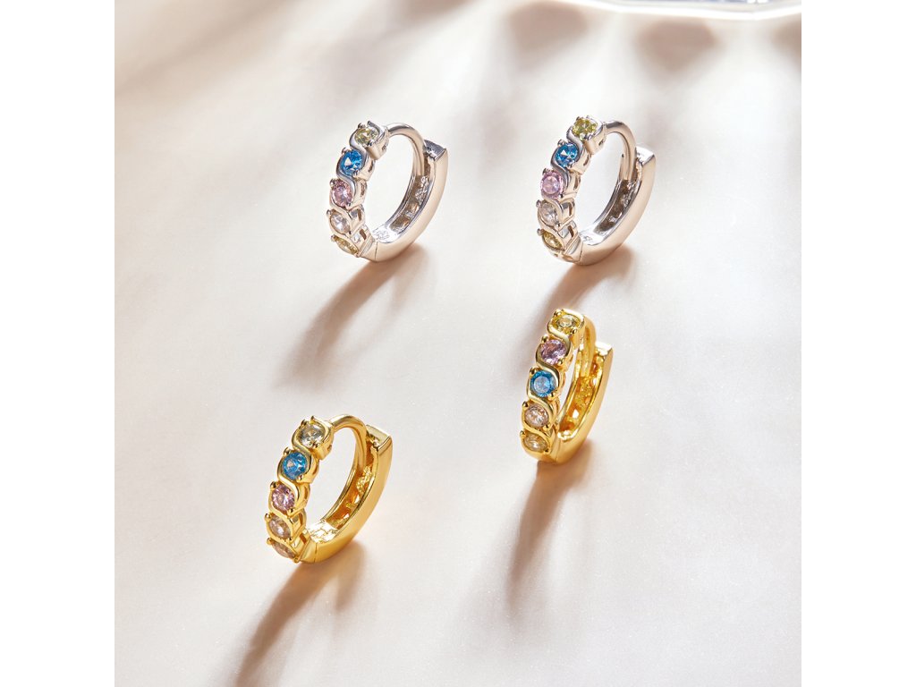- Strieborné kruhové náušnice zdobené blýskavými farebnými zirkónmi. Originálny design náušníc, kvalitné spracovanie a materiál, ručne dohotovené.