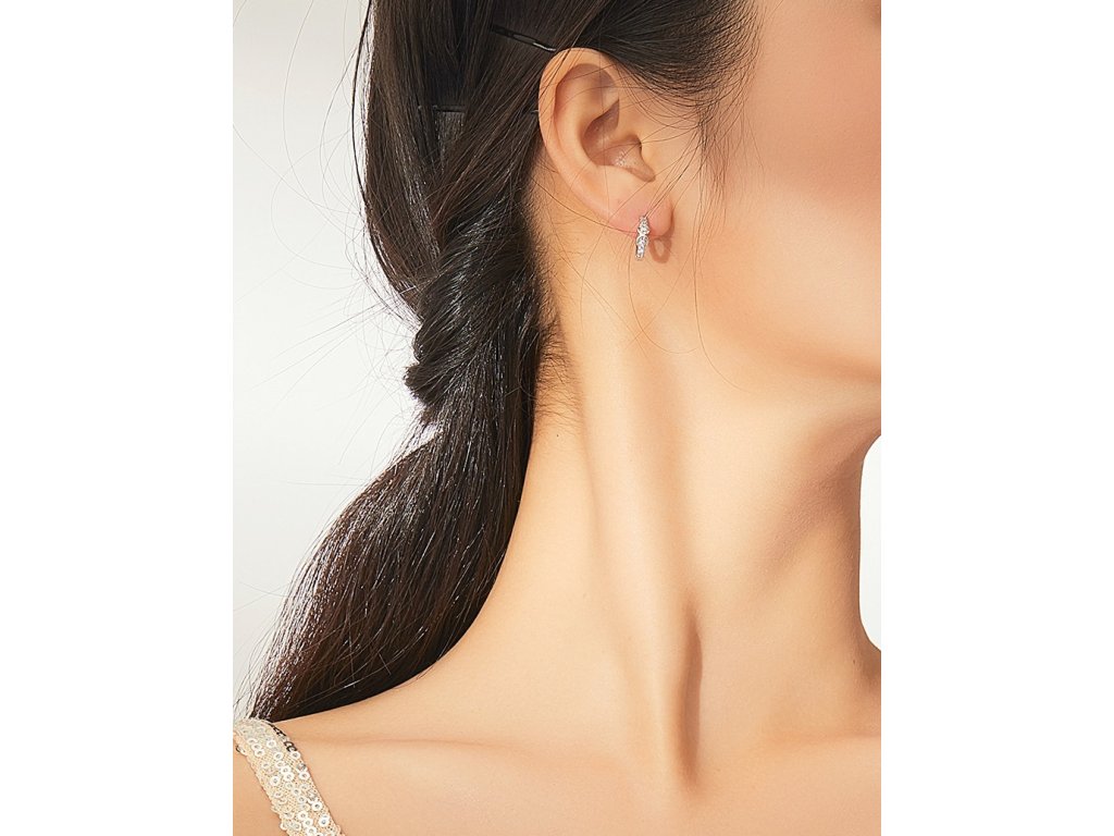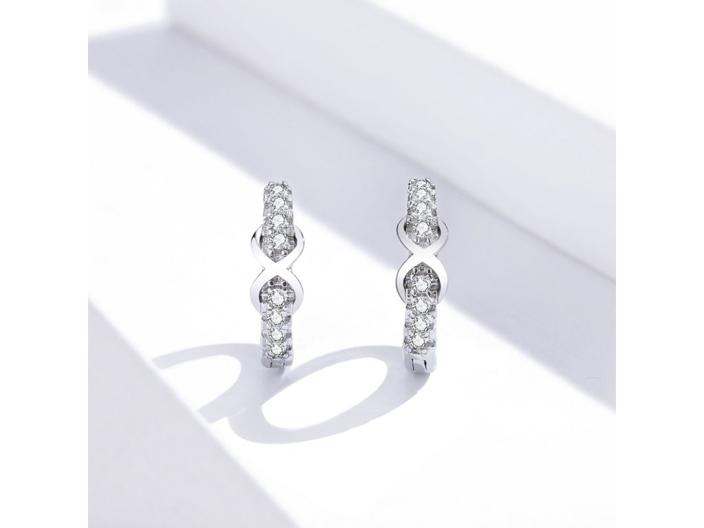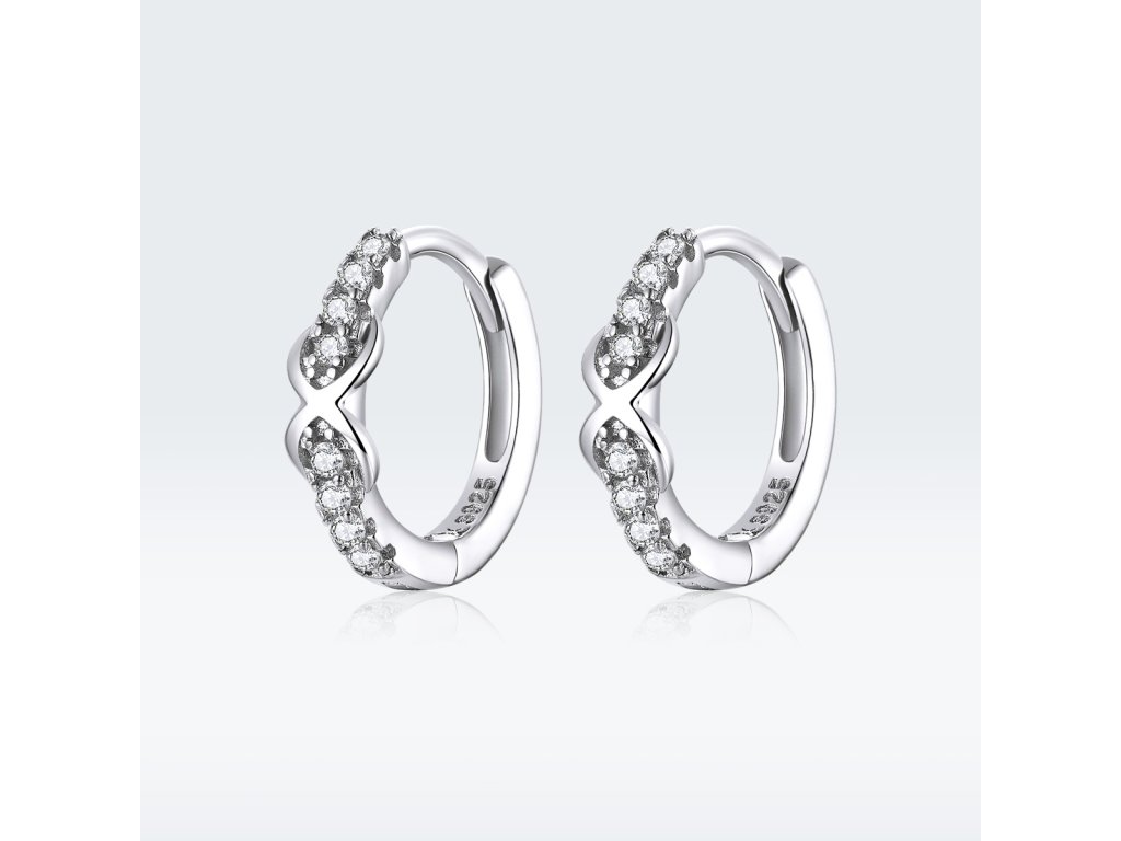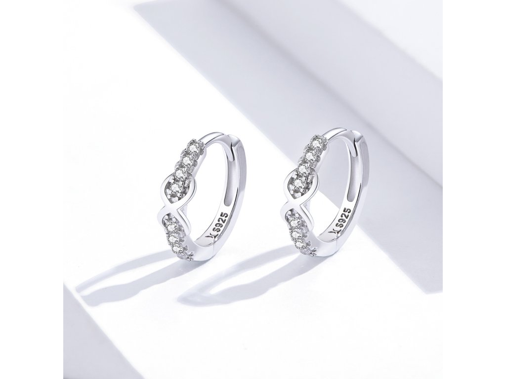 - Strieborné náušnice malé krúžky v dizajne Symbolu nekonečnej lásky posázené trblietavými kameňmi v podobe čírych zirkónov. Originálny dizajn náušníc, kvalitné spracovanie a materiál, ručne dokončené.