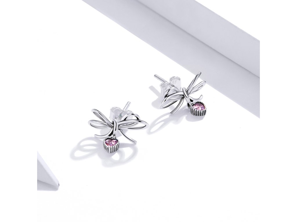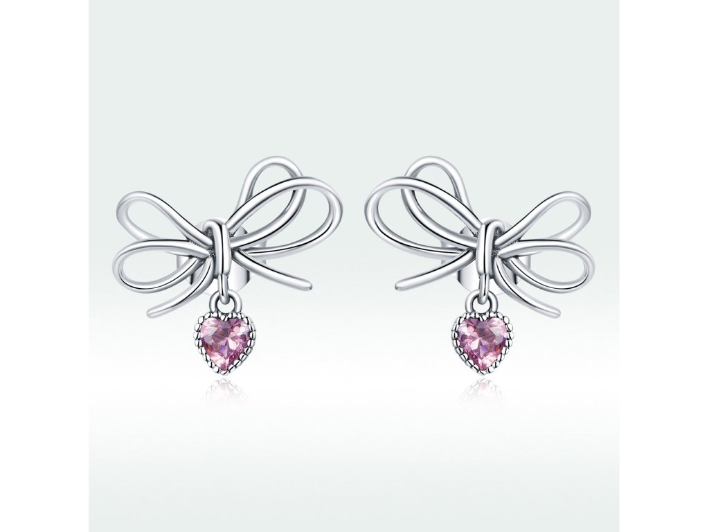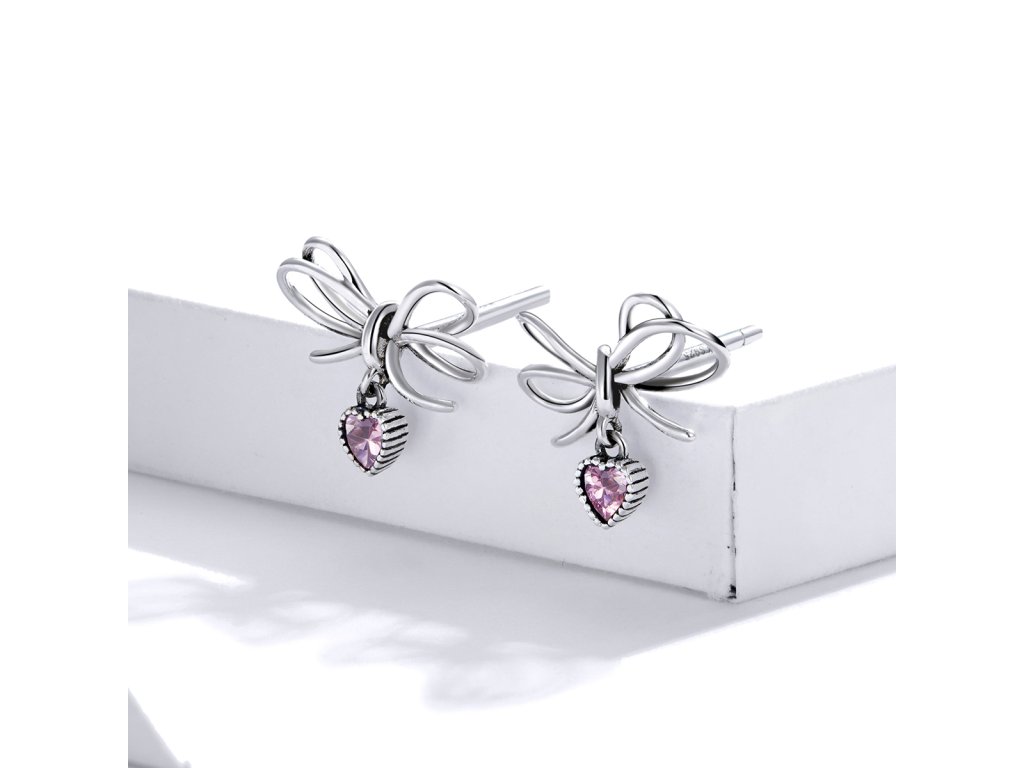 - Strieborné kôstkové náušnice v dizajne krásnych mašličiek z lásky zdobené srdcovými príveskami s blyštivými ružovými zirkónmi.