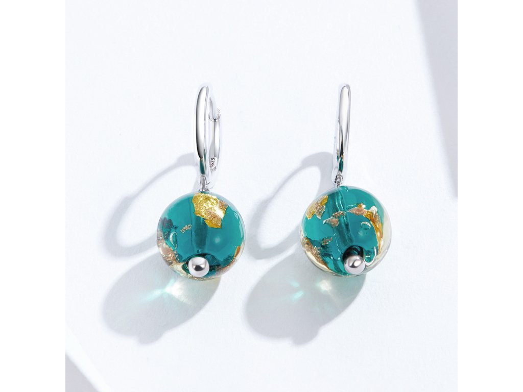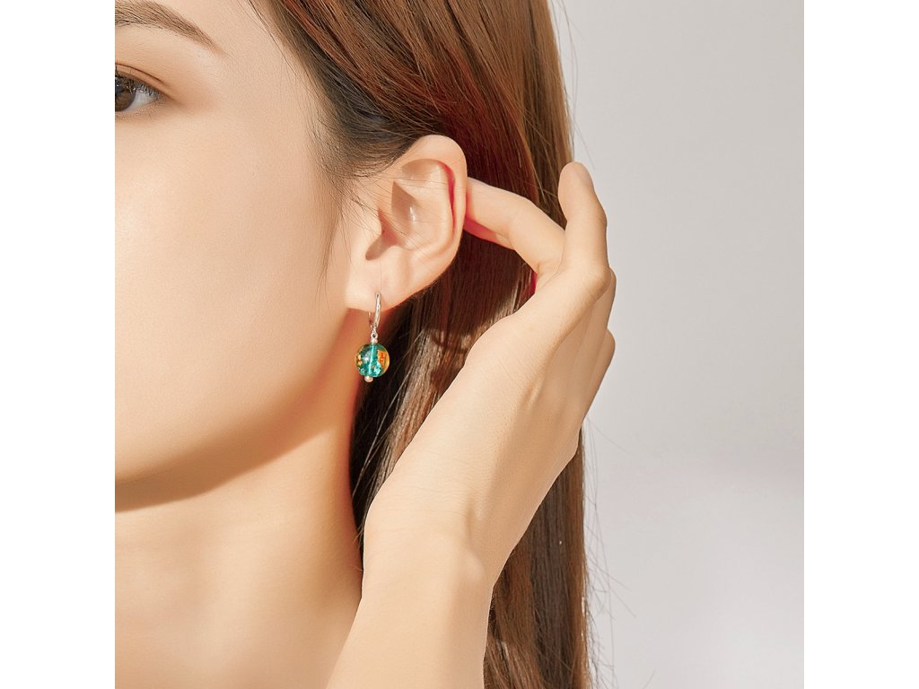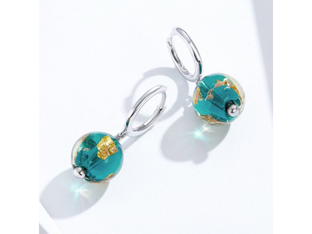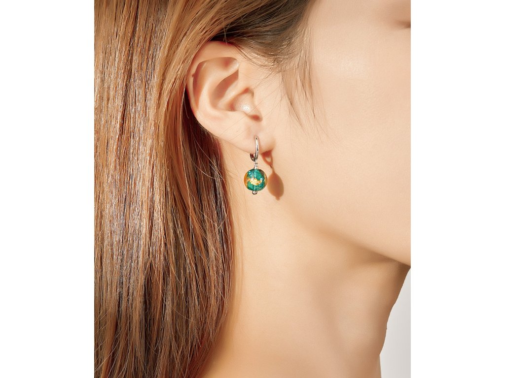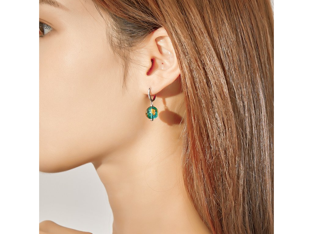 - Stříbrné náušnice zdobené zářivými zeleno-zlatými korálky.