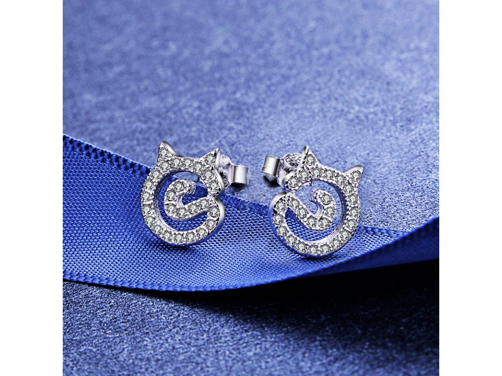 - Strieborné kôstkové a elegantné náušnice v dizajne milovaných mačičiek zdobených čírymi trblietavými zirkónmi. Originálny dizajn náušníc, kvalitné spracovanie a materiál, ručne dokončené.