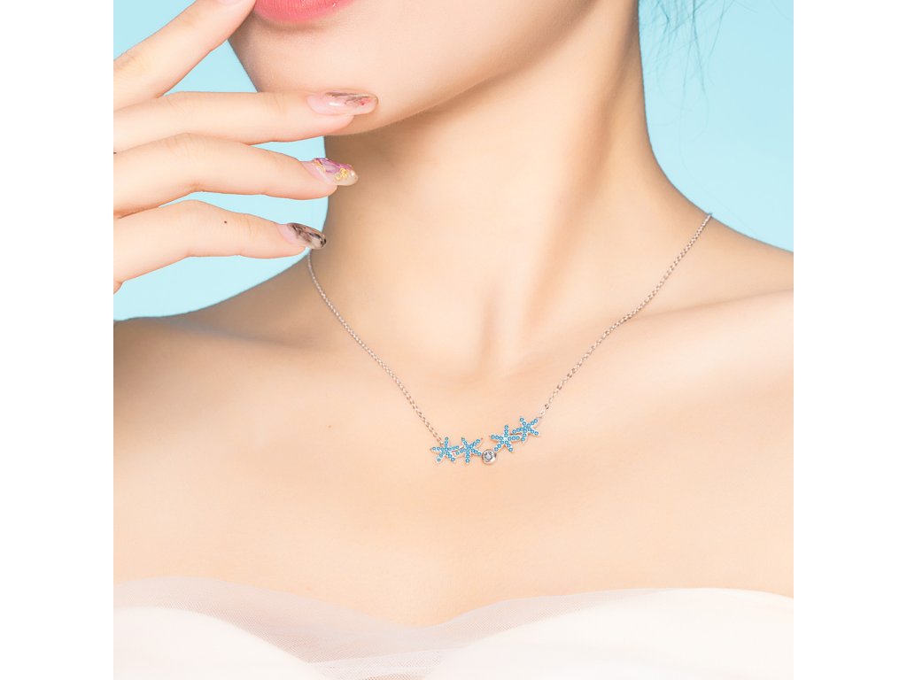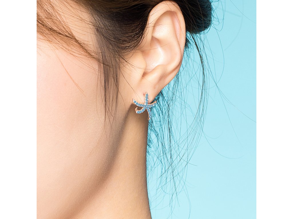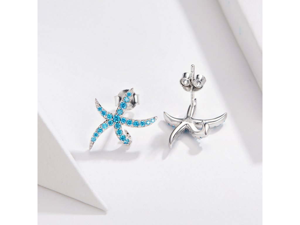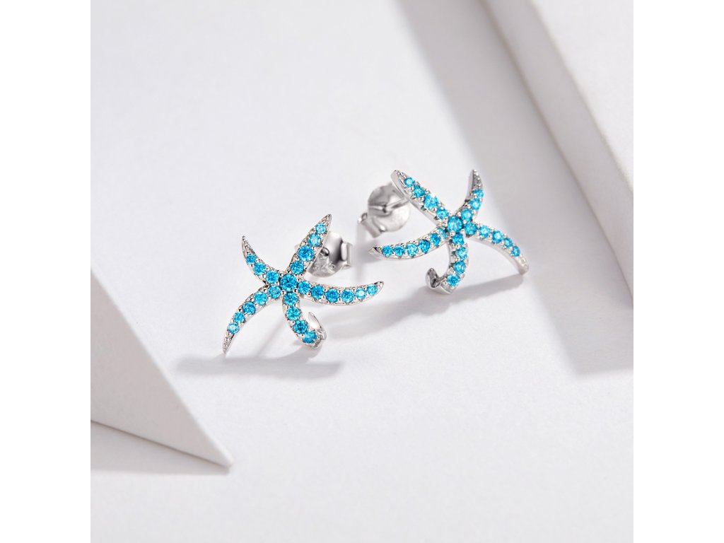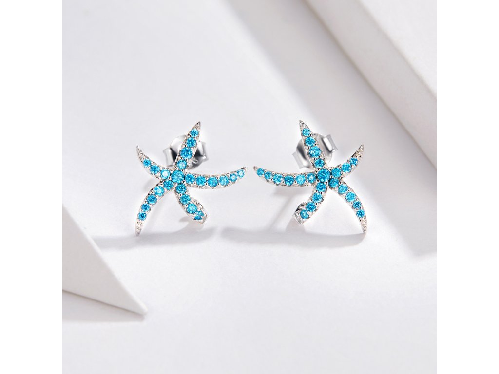 - Strieborné náušnice v dizajne Trblietavých morských hviezdic zdobených tyrkysovými zirkónmi.