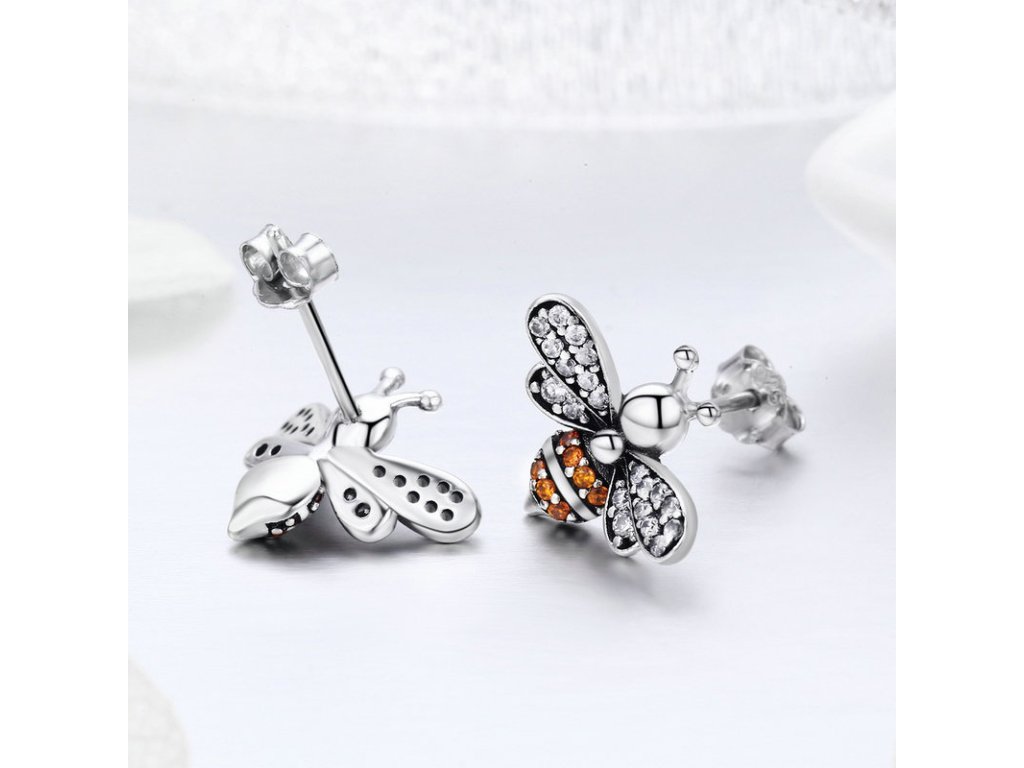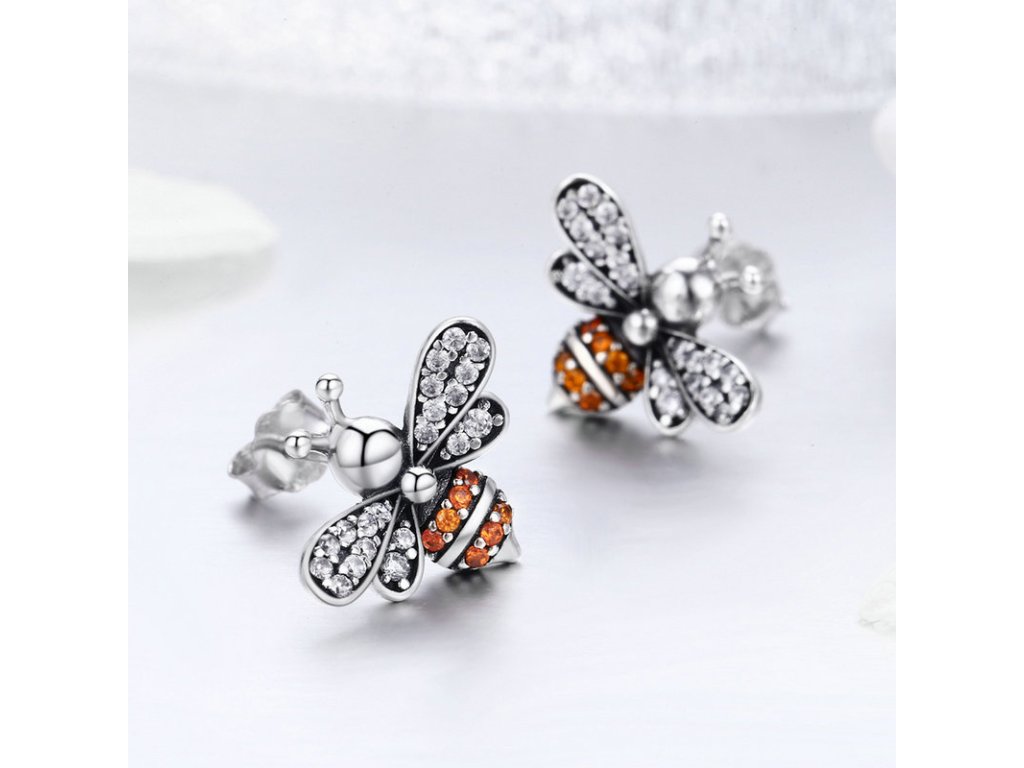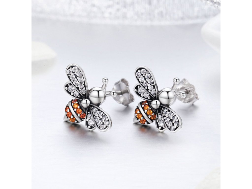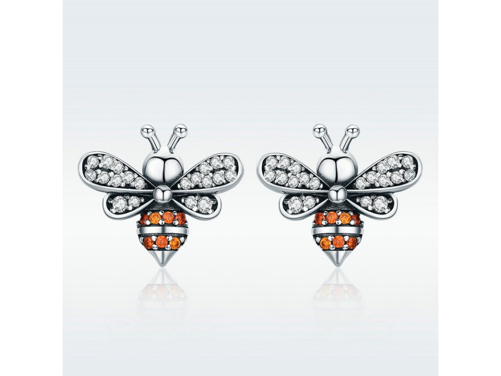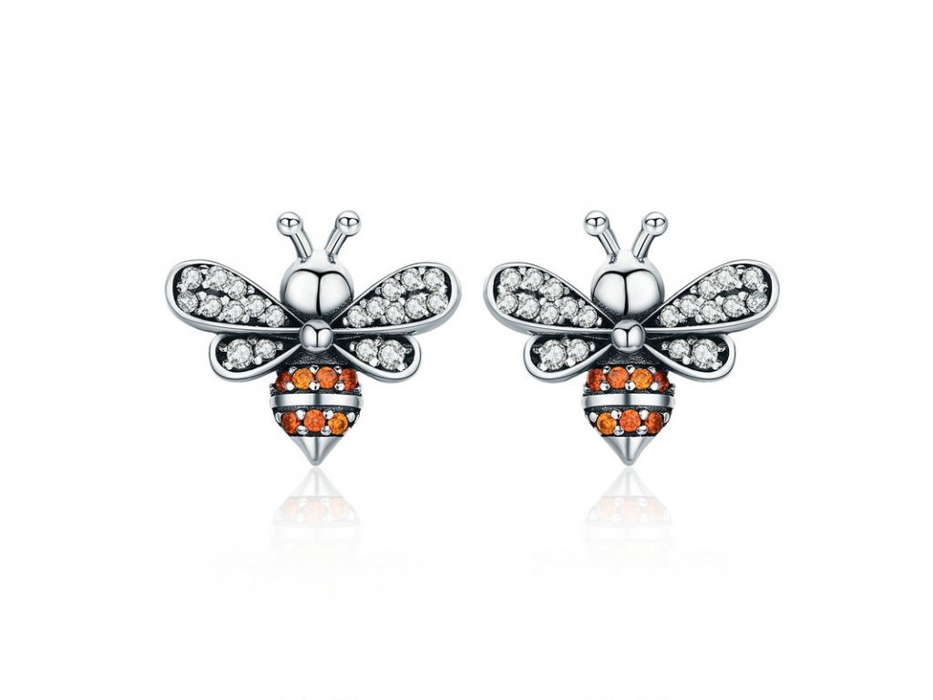 - Luxusné a prepracované strieborné kôstkové náušnice v dizajne trblietavej včelej kráľovnej zdobenej zirkónmi.