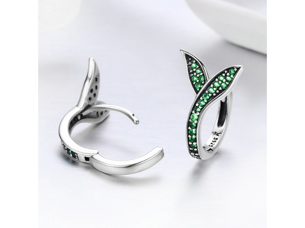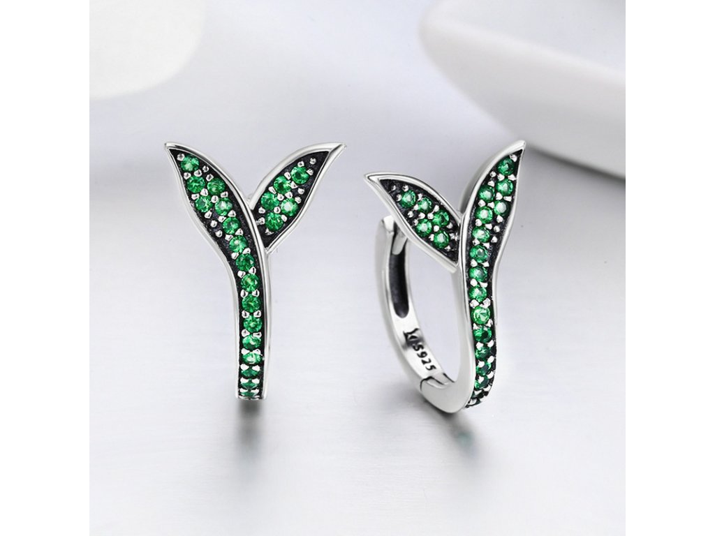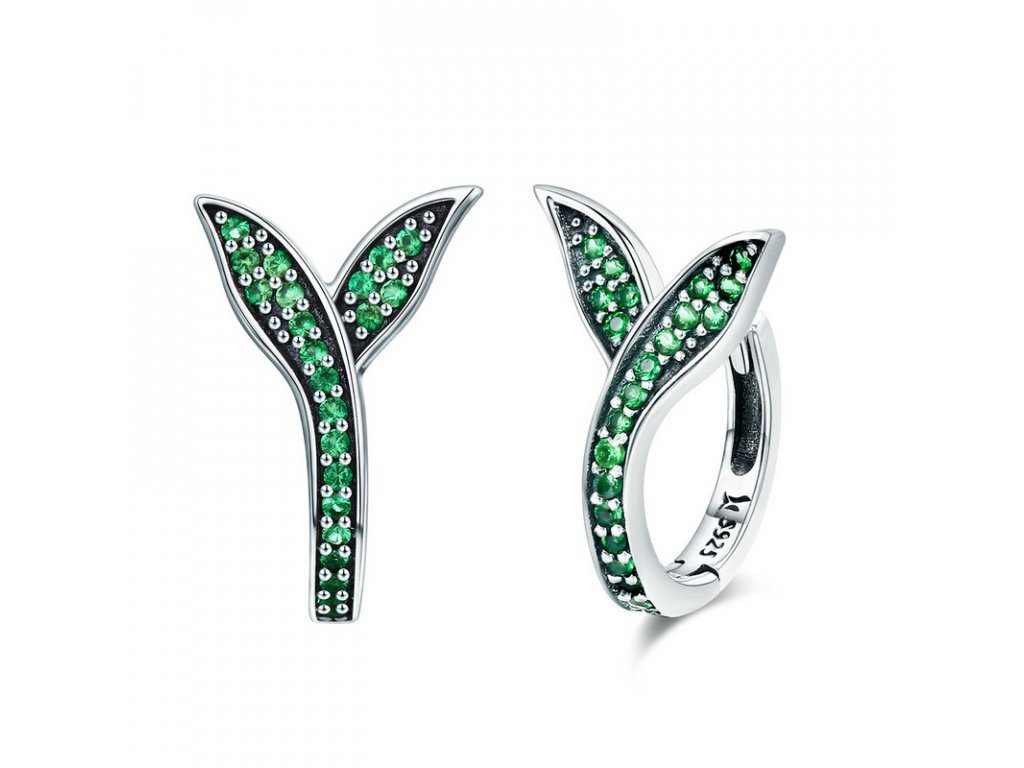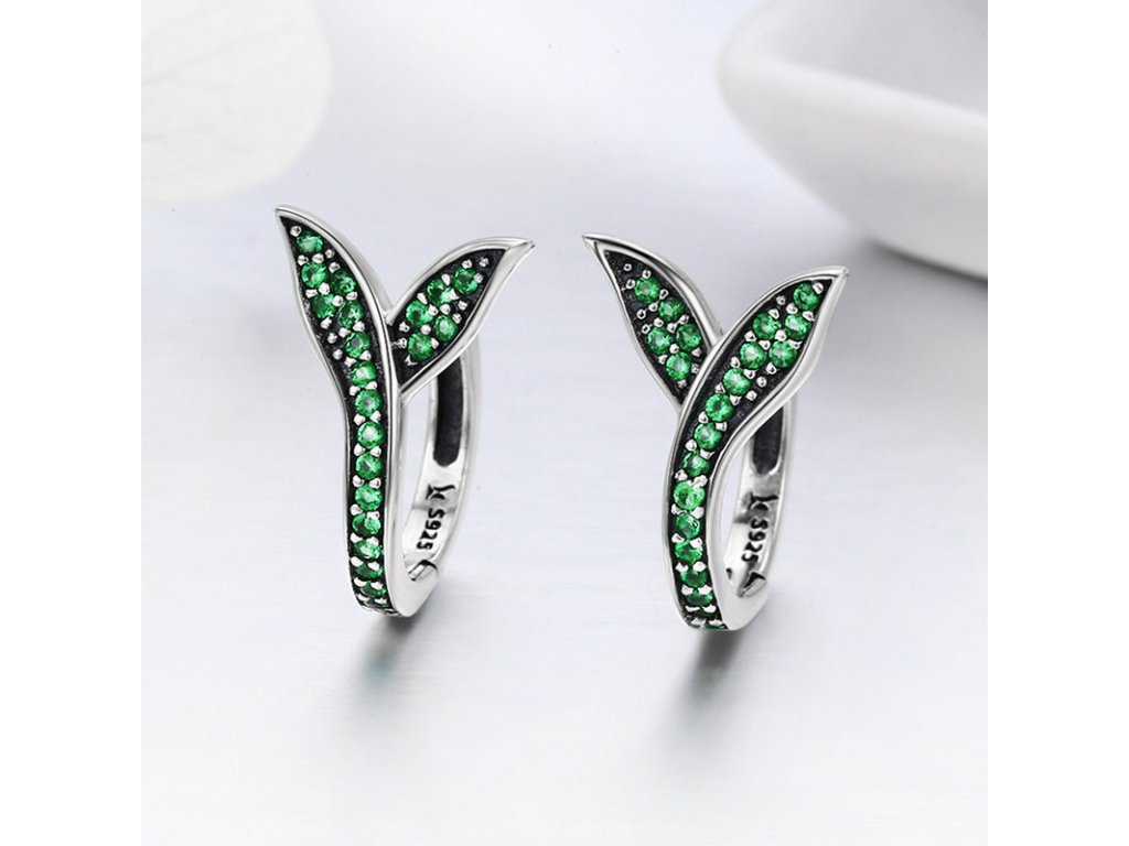 - Strieborné prepracované kruhové náušnice v dizajne lístkov zdobených trblietavými kameňmi v podobe zelenkavých zirkónov. Originálny dizajn náušníc, kvalitné spracovanie a materiál, ručne dokončené.