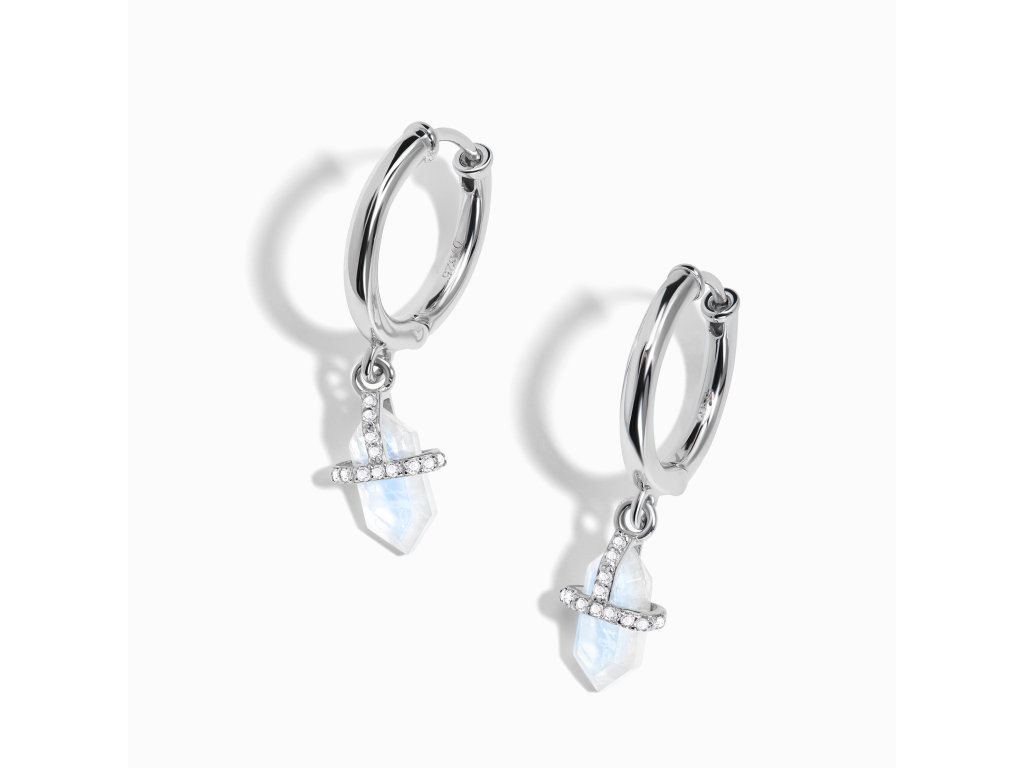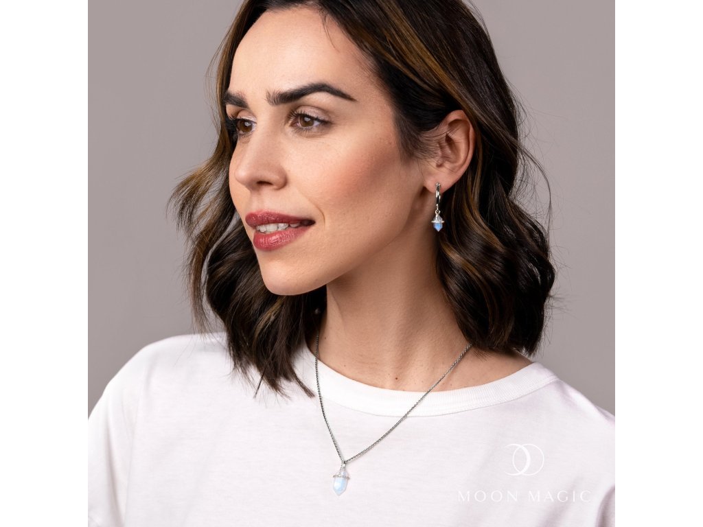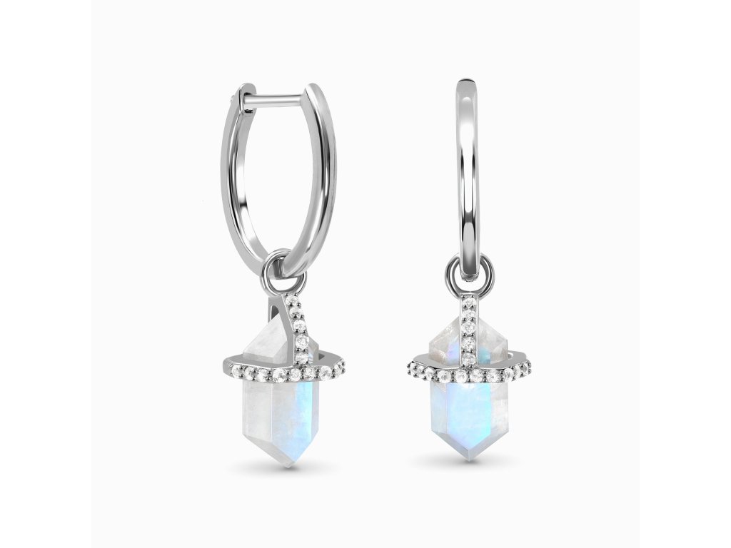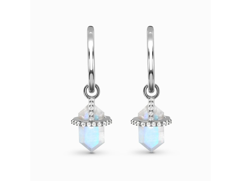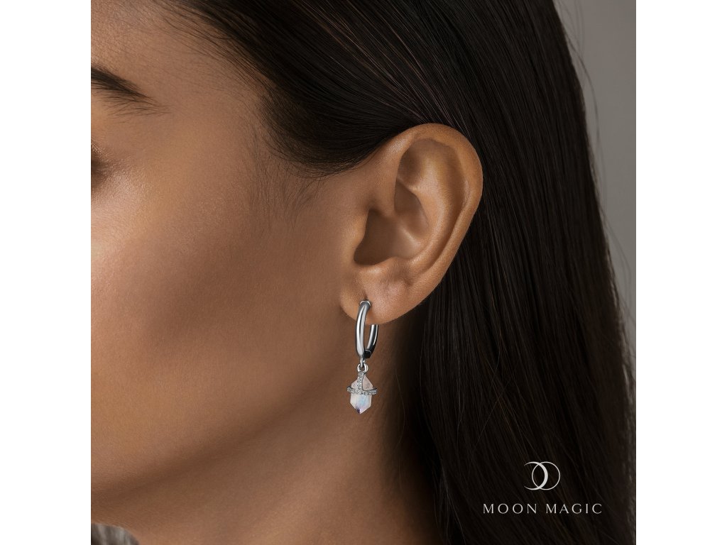 - Visiace strieborné rhodiované náušnice obohatené dúhovým mesačným kameňom Moonstone a čírymi trblietavými zirkónmi. Originálny design náušníc, kvalitné spracovanie a materiál, ručne dohotovené.