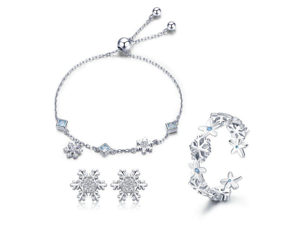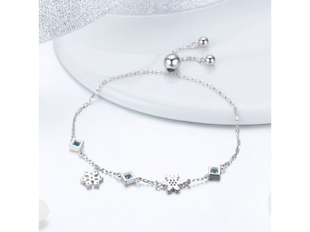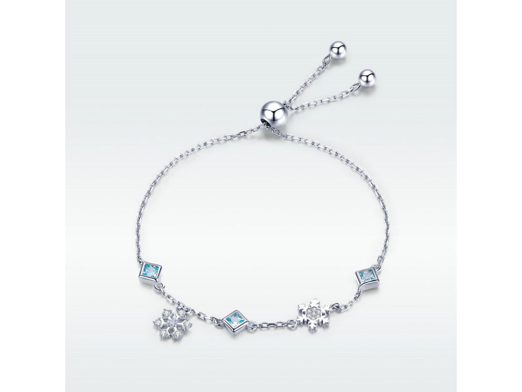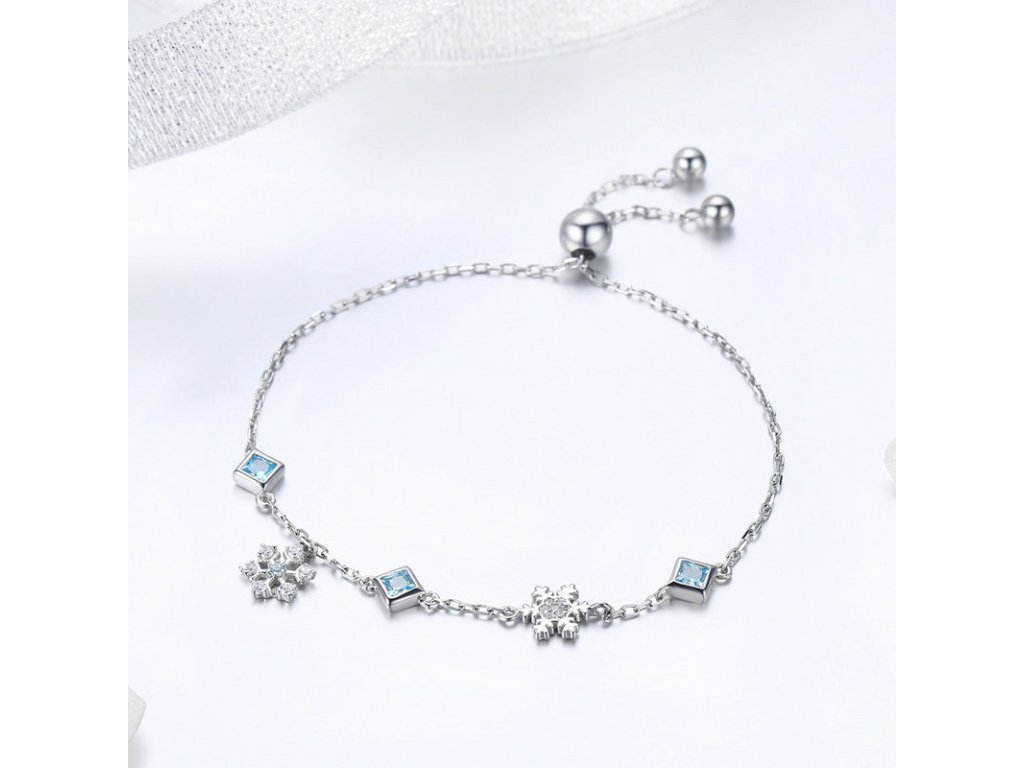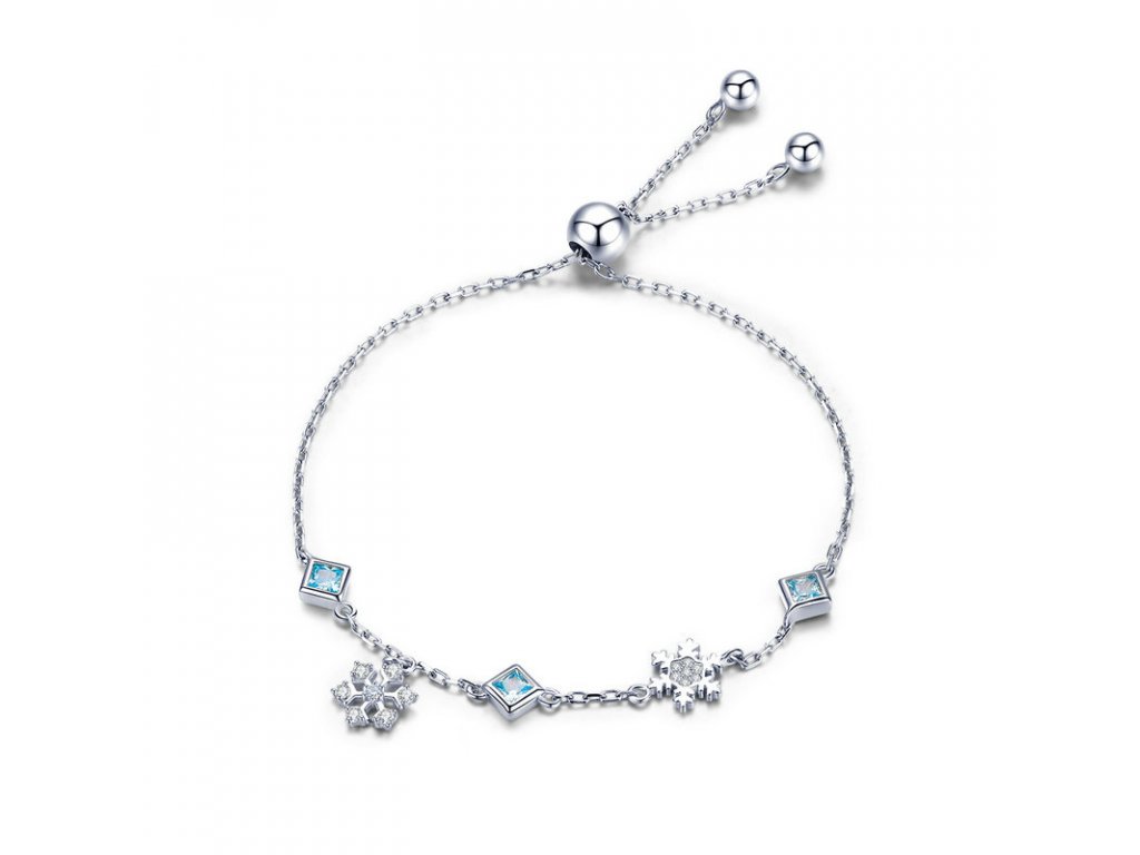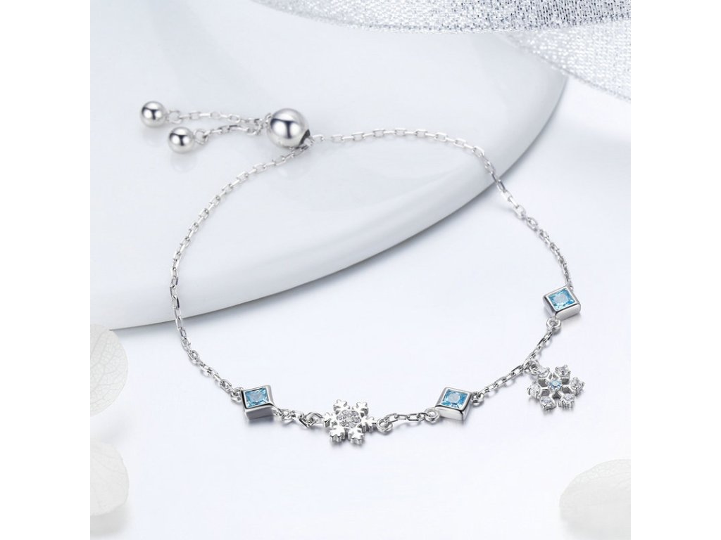 - Luxusný strieborný retiazkový náramok s prívesky snehových vločiek a kosoštvorcov, zdobených modrými zirkónmi.