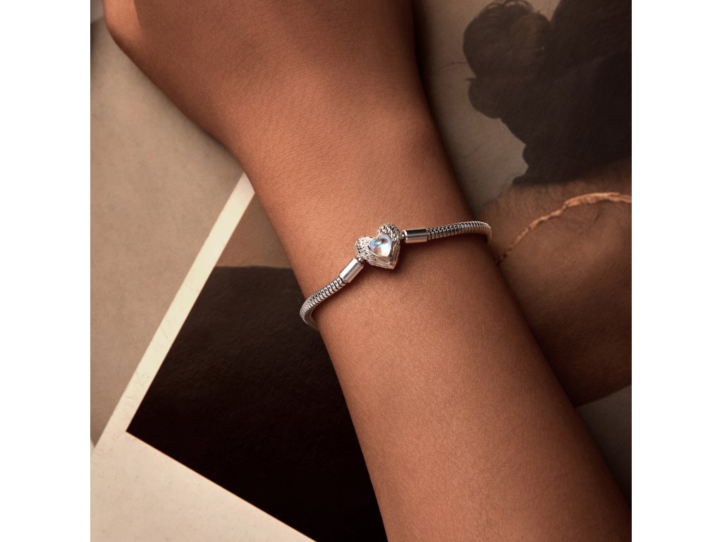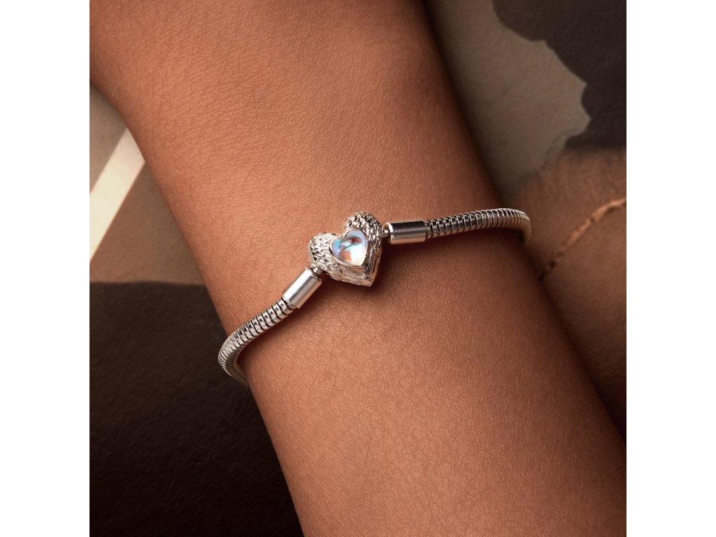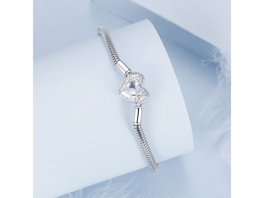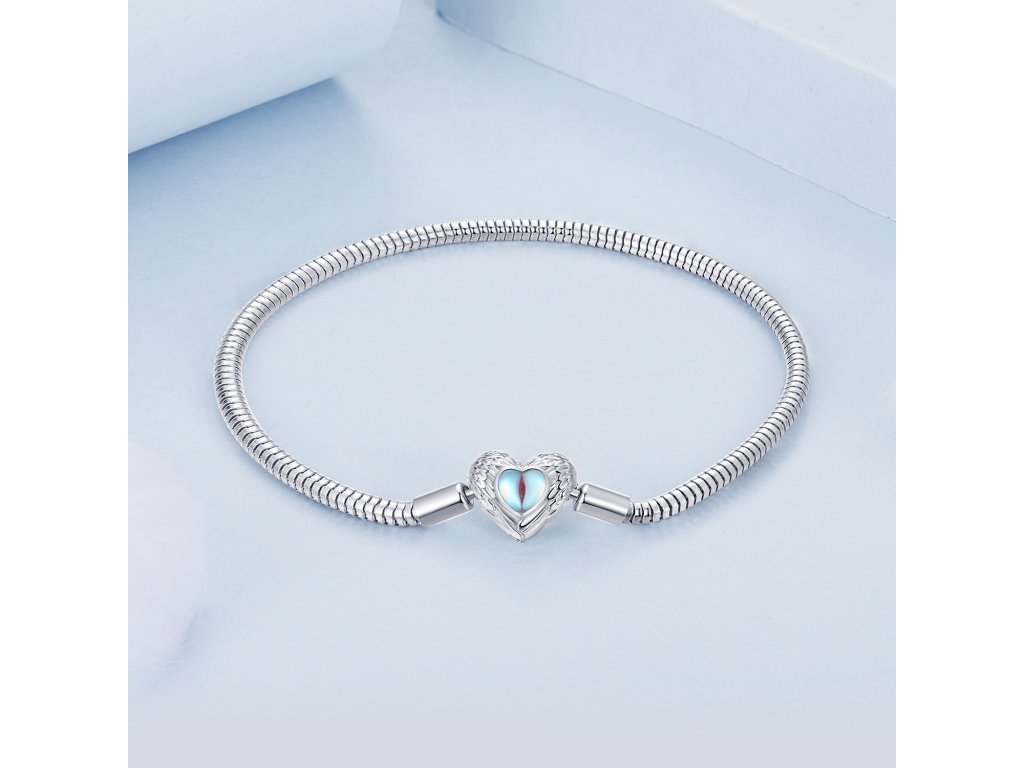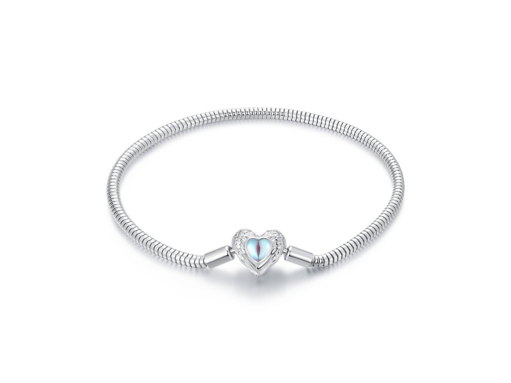 - Luxusný strieborný pružný náramok na prívesky. Stred zapínania tvorí nádherný mesačný kameň Moonstone v tvare srdca, ktorý hádže kúzelné modré a fialové odlesky, keď naň zasvieti slnečný svit. Originálny design náramku, kvalitné spracovanie a materiál, ručne dohotovené.