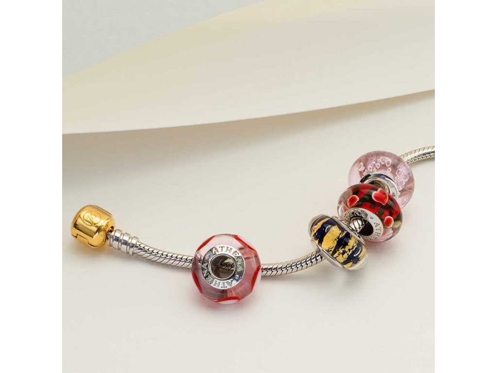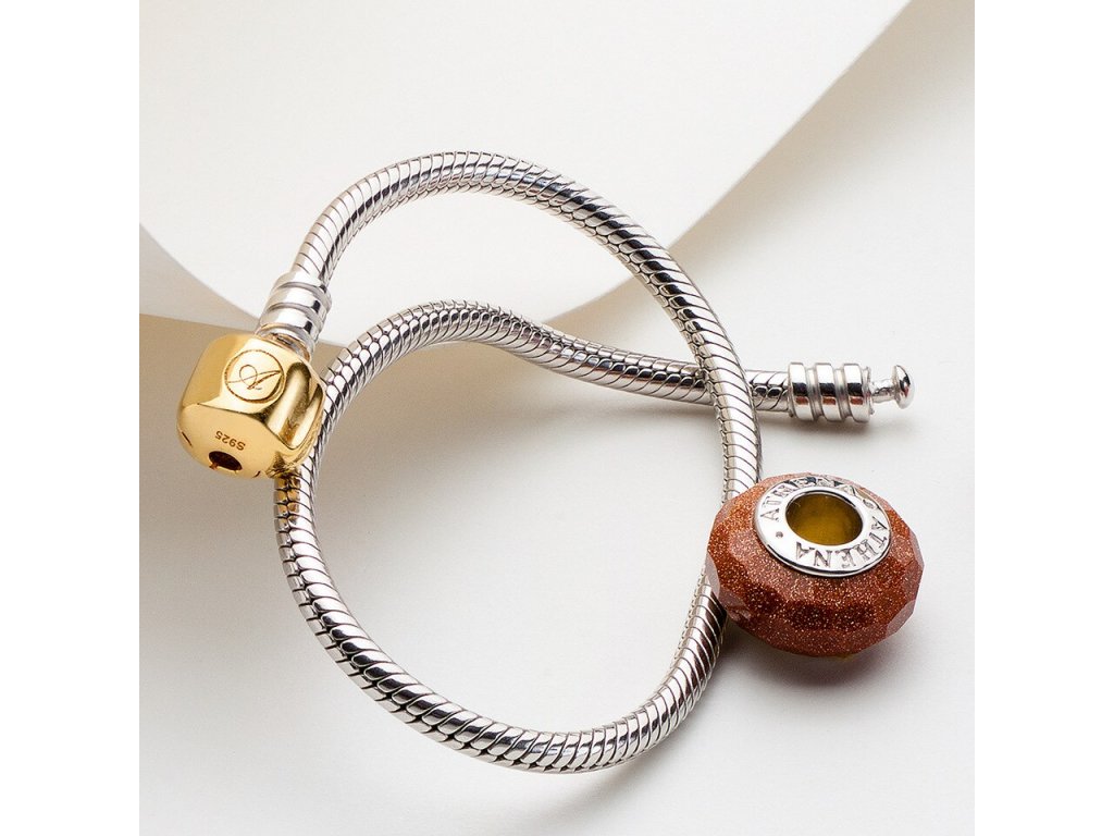 - Luxusný strieborný pružný náramok na prívesky s pozláteným zapínaním 18 karátovým zlatom. Zapínanie náramku je tiež ozdobené ručne vyrytým písmenom "A" ako Aténa, najmocnejší bohyňa múdrosti, spravodlivosti, statočnosti, poznania a umenia.