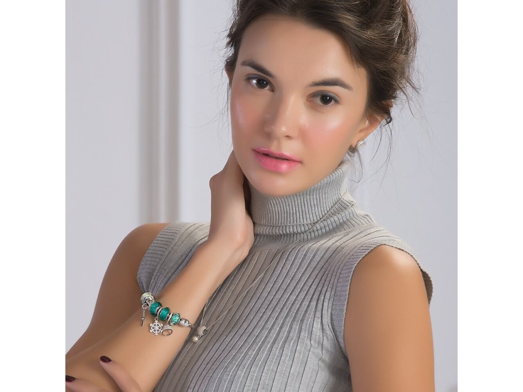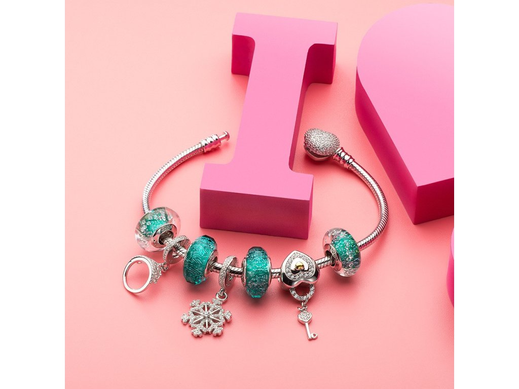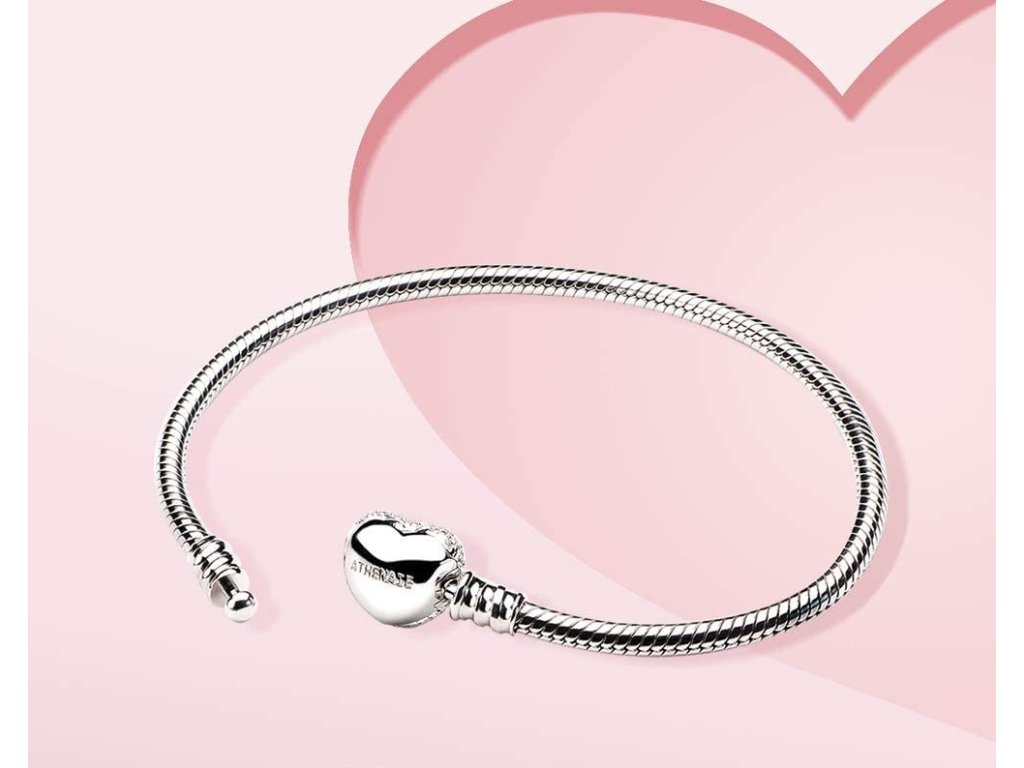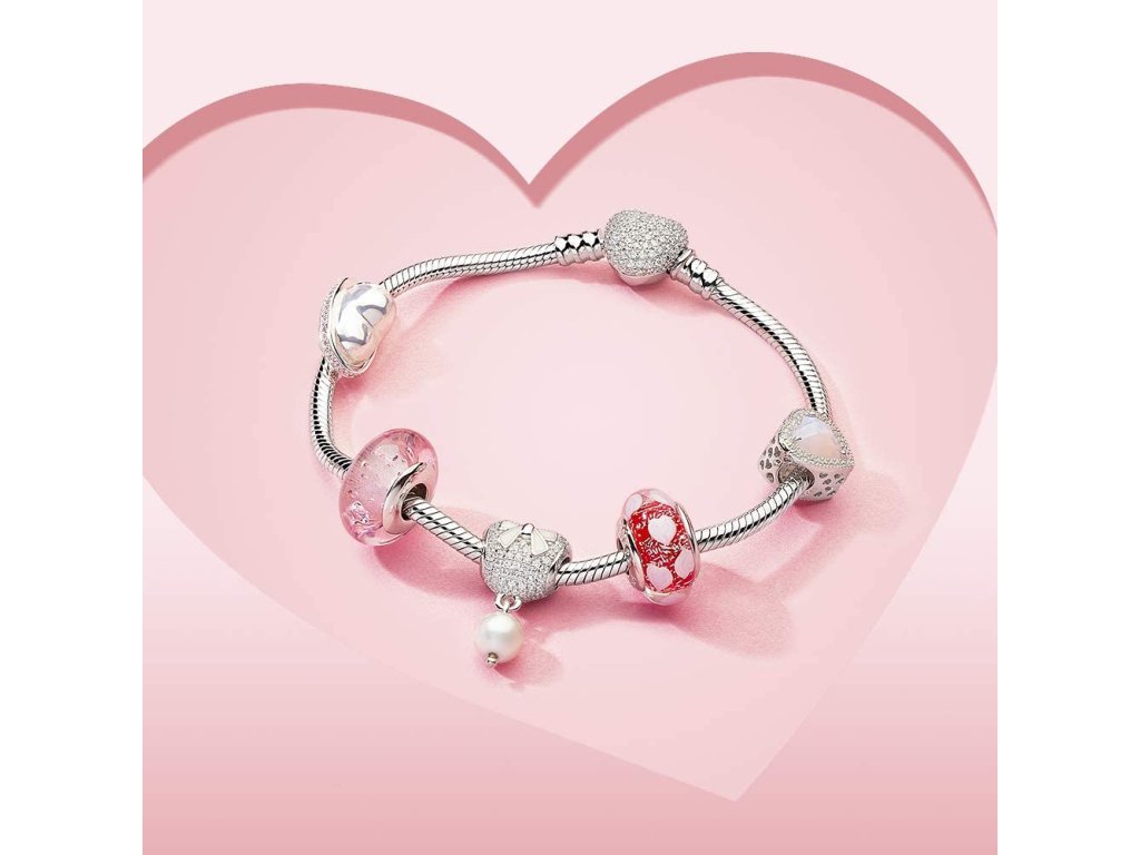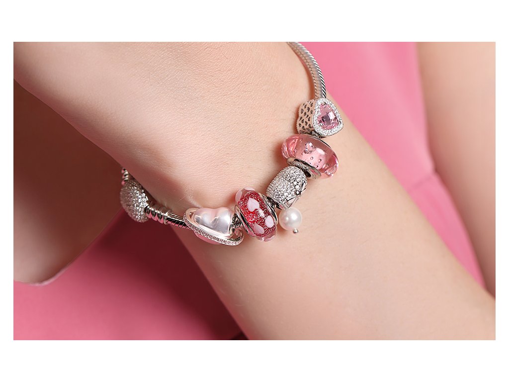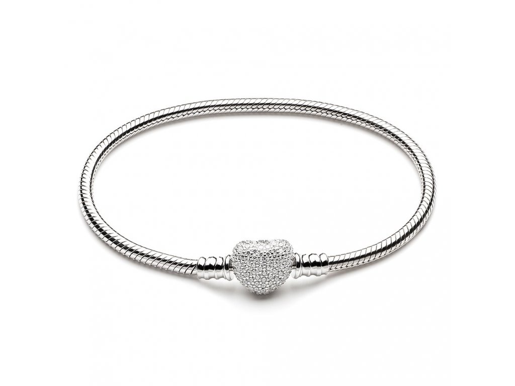 - Luxusný strieborný pružný náramok na prívesky so srdcovým zapínaním zdobeným čírymi trblietavými zirkónmi.