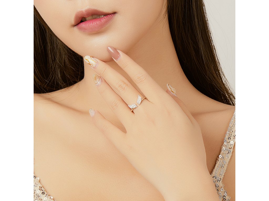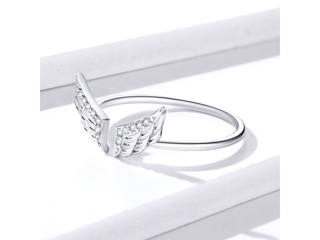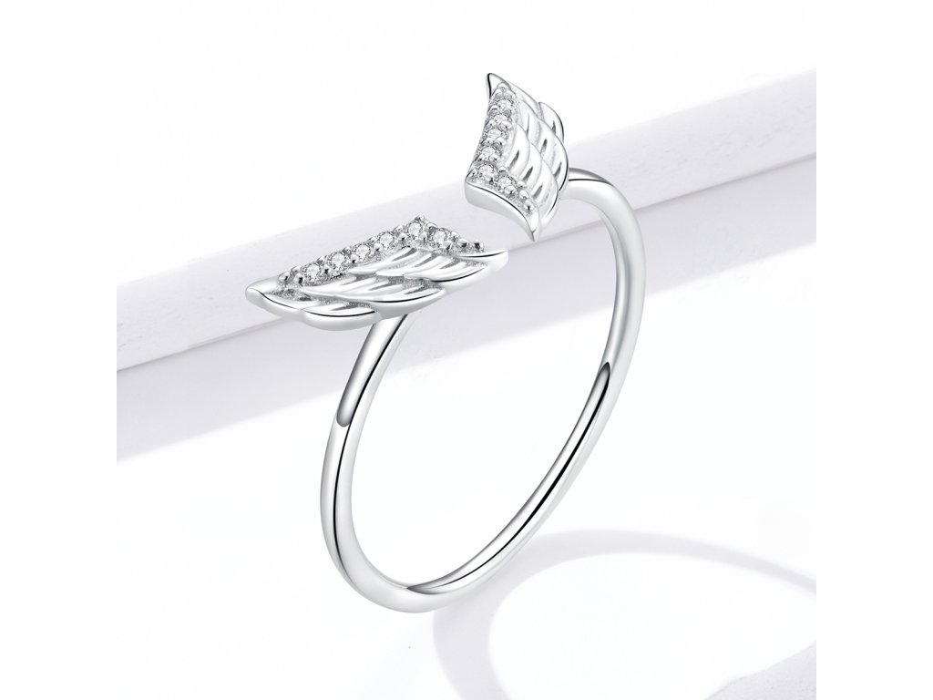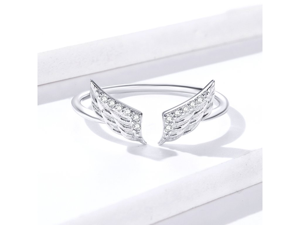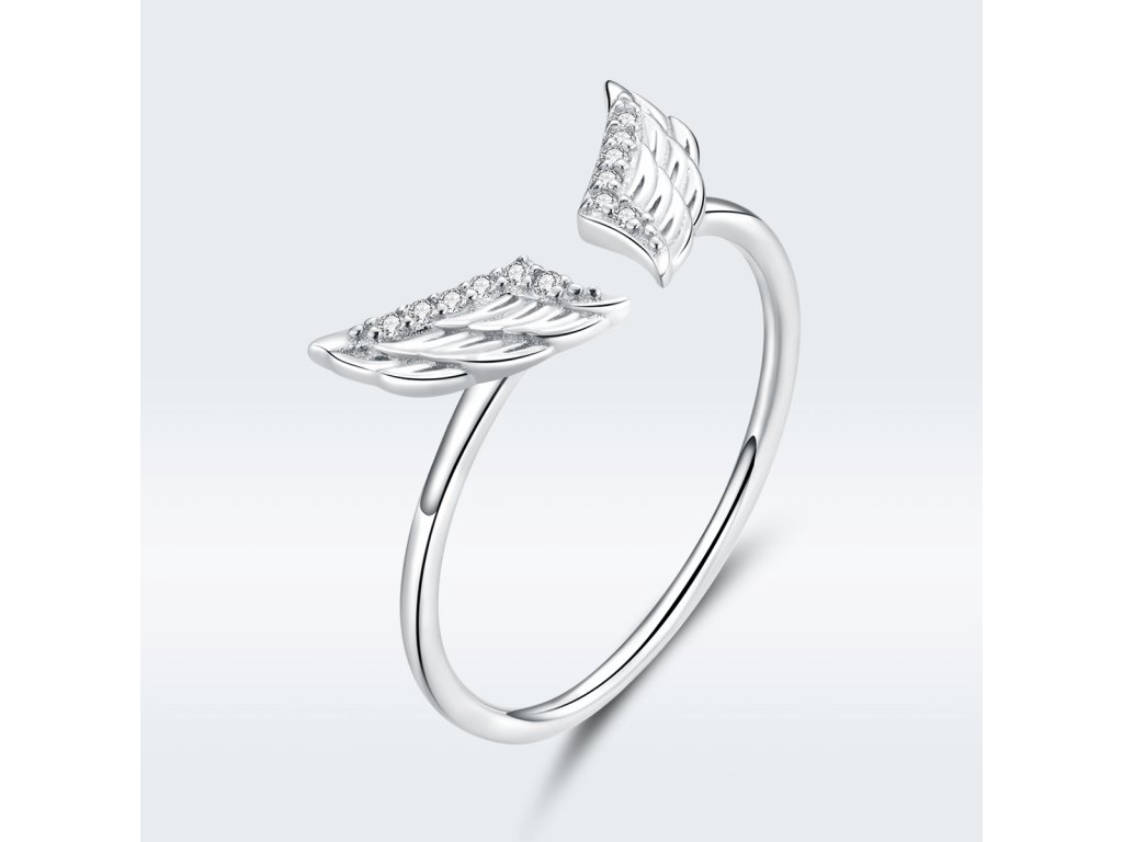 - Strieborný nastaviteľný prsteň v dizajne Anjelských krídiel zdobených čírymi trblietavými zirkónmi.
