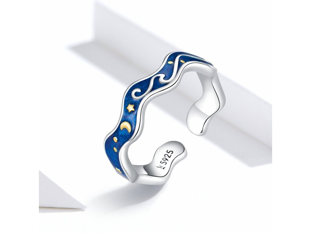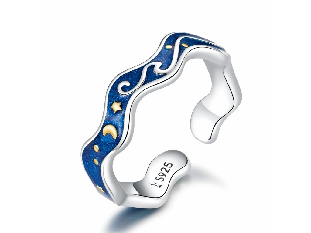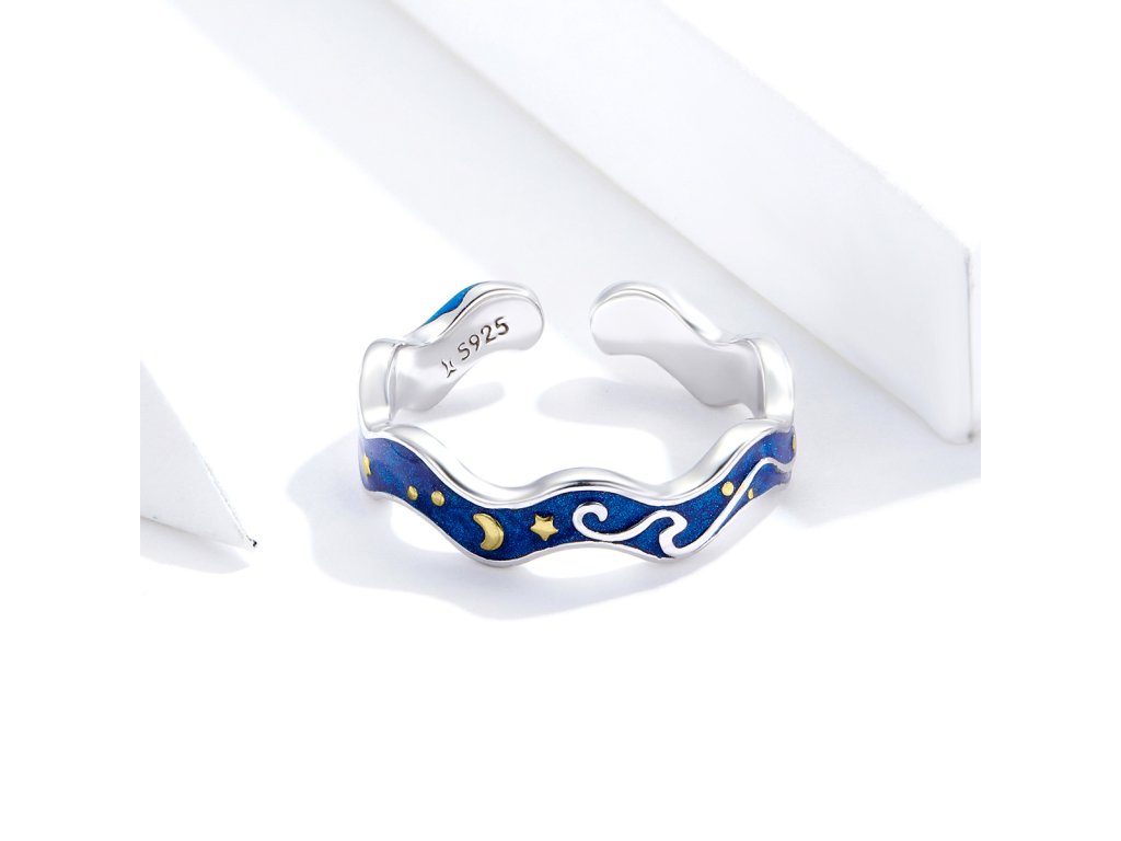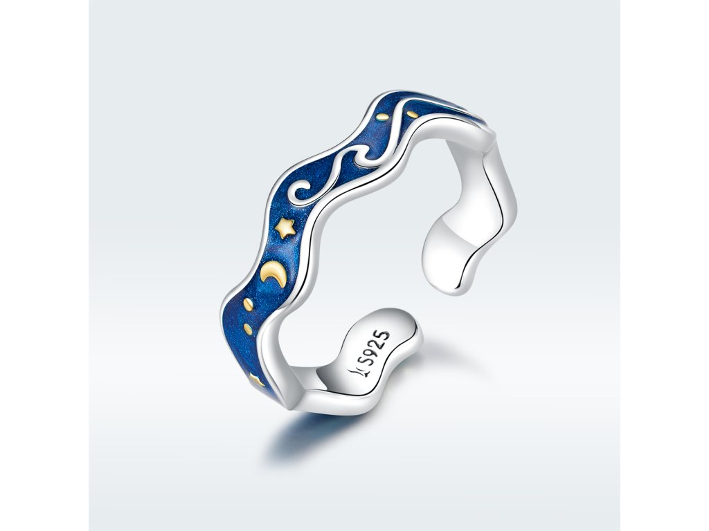 - Strieborný prsteň v dizajne Krásneho vesmíru zdobeného tmavo modrou trblietavou glazúrou.