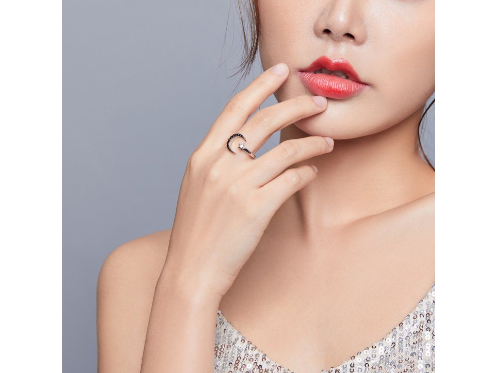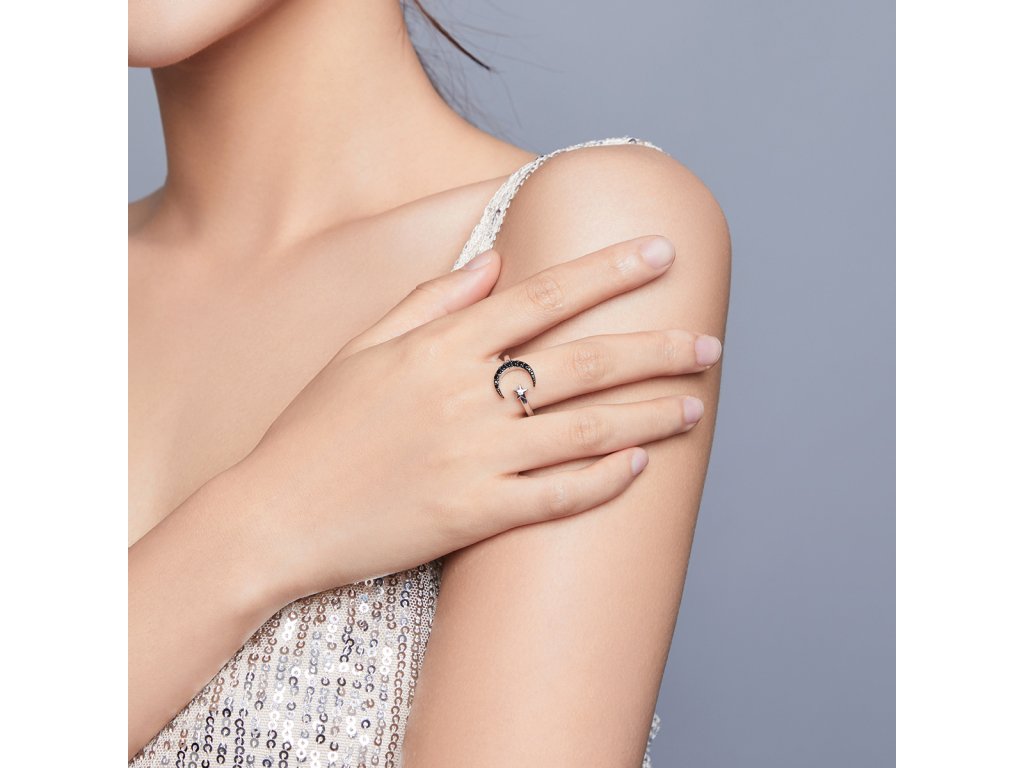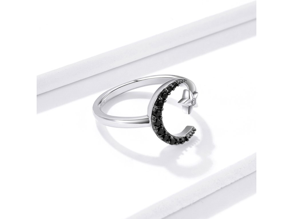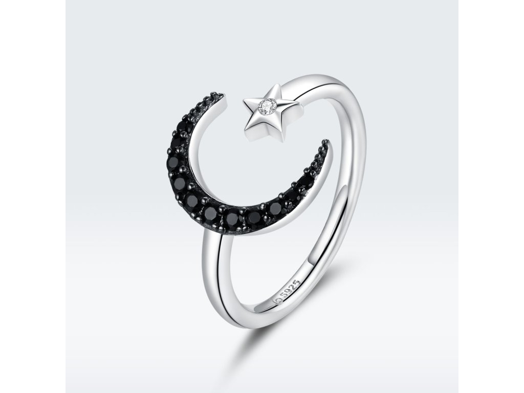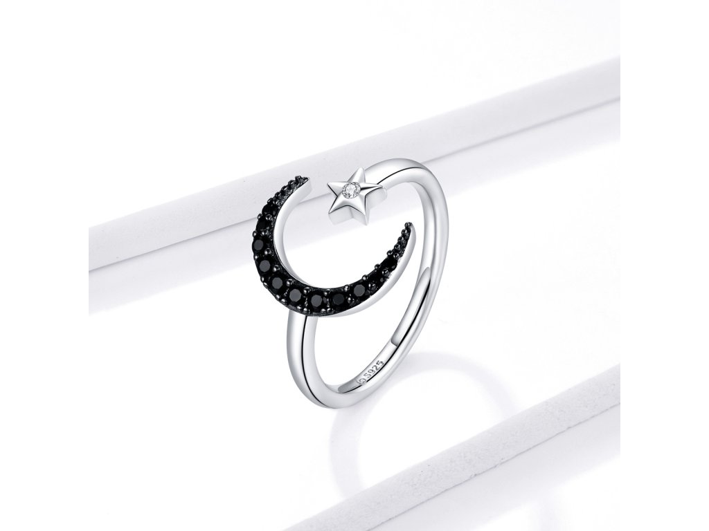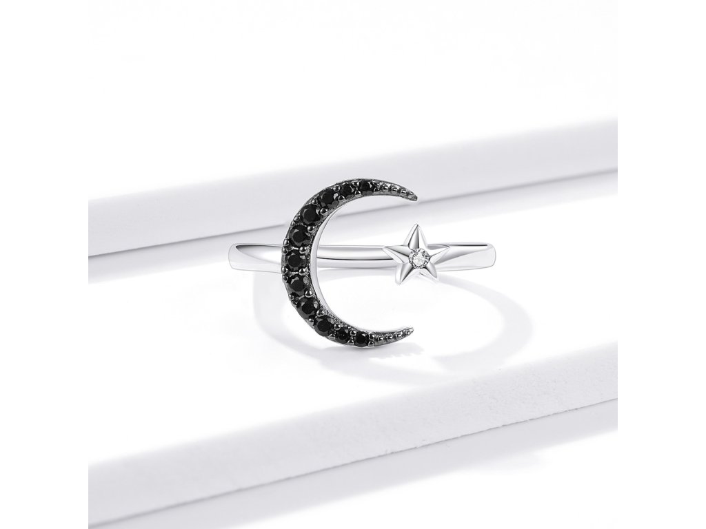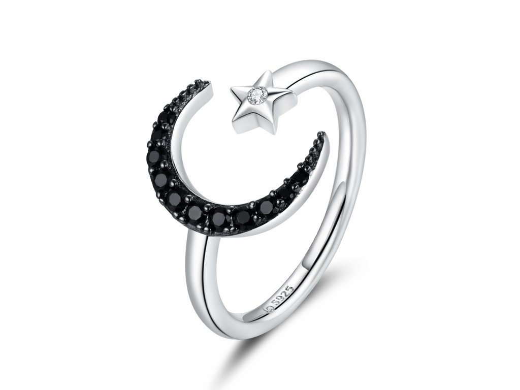 - Strieborný nastaviteľný prsteň v dizajne čírej hviezdy a tajomného mesiaca zdobeného čiernymi kameňmi v podobe trblietavých zirkónov. Originálny dizajn prsteňa, kvalitné spracovanie a materiál, ručne dohotovené.