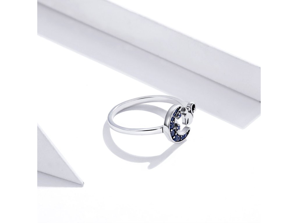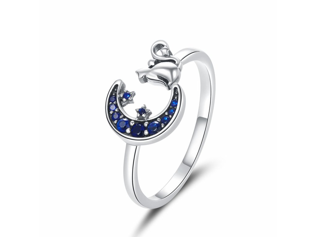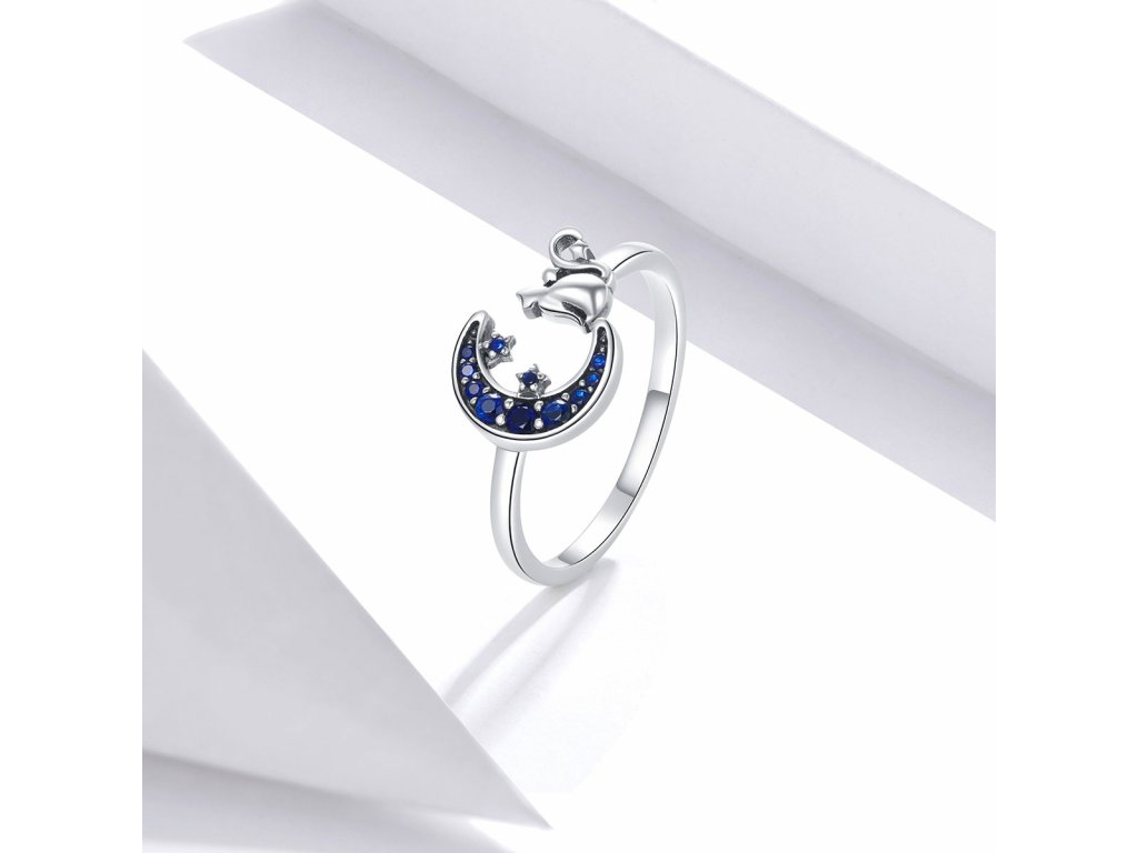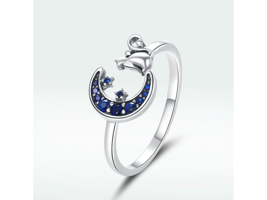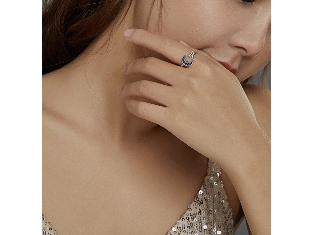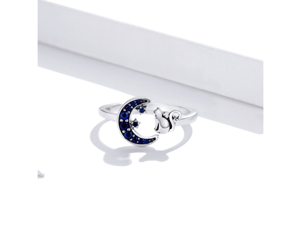 - Strieborný nastaviteľný prsteň Nočný život v dizajne trblietavého tmavo modrého mesiaca s hviezdami a vzhliadajúce mačky k nebu.