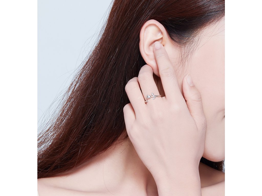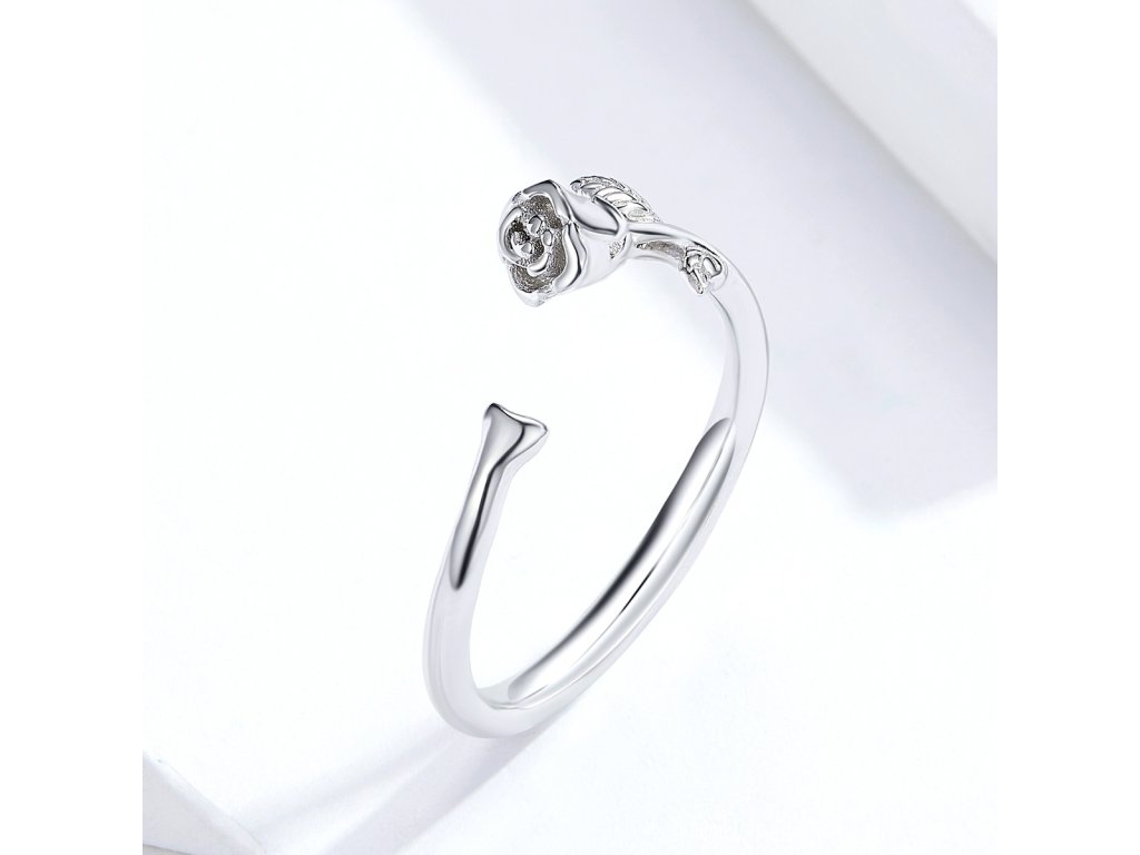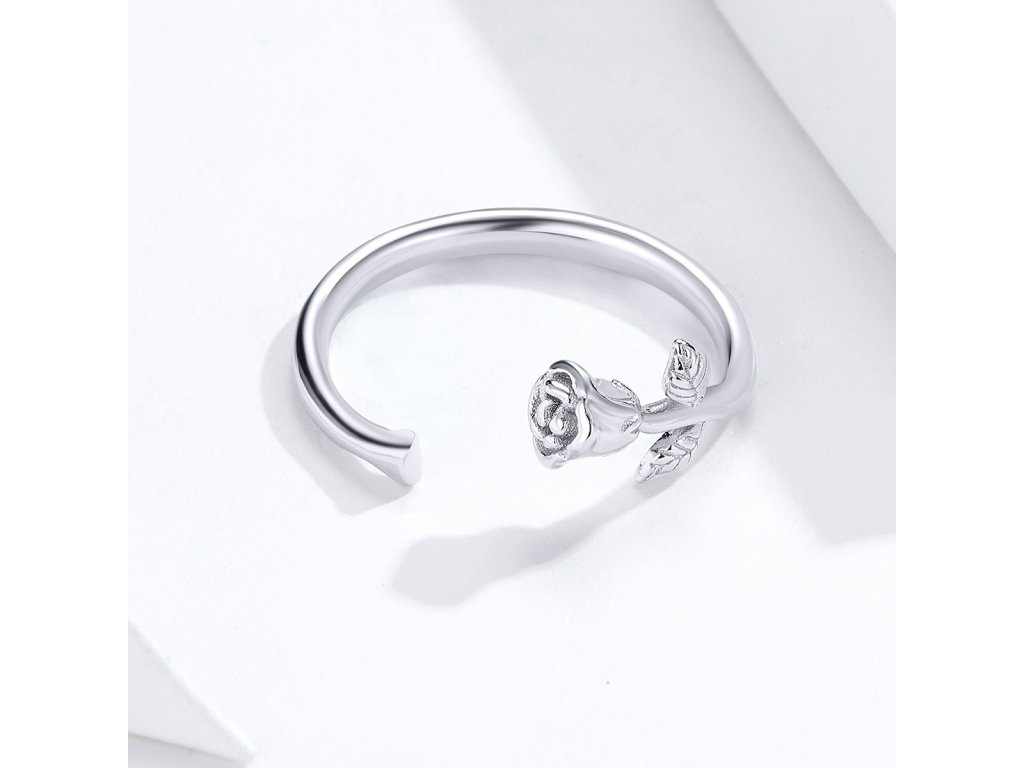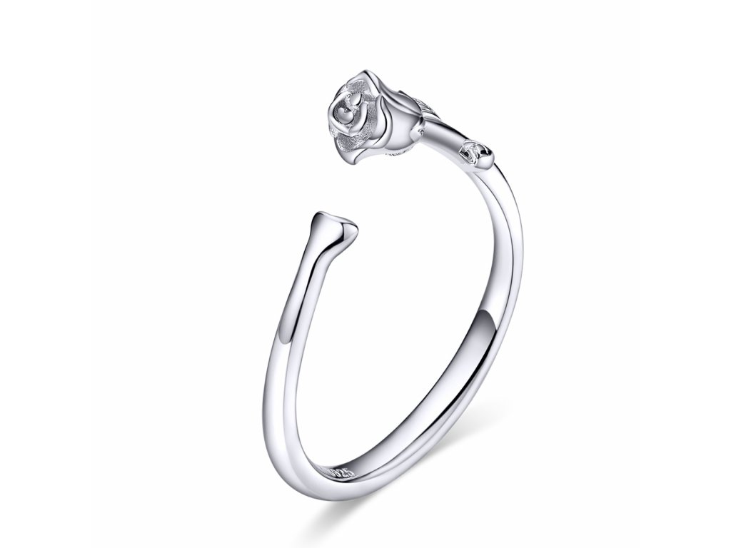 - Strieborný prepracovaný nastaviteľný prsteň v dizajne Rozkvitnutej ruže.
