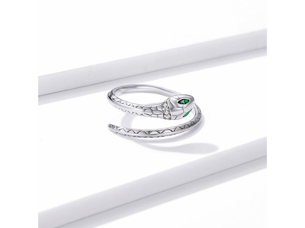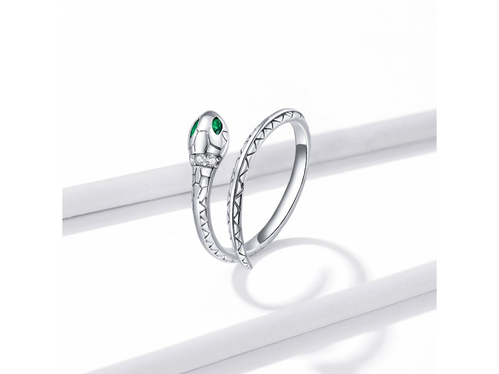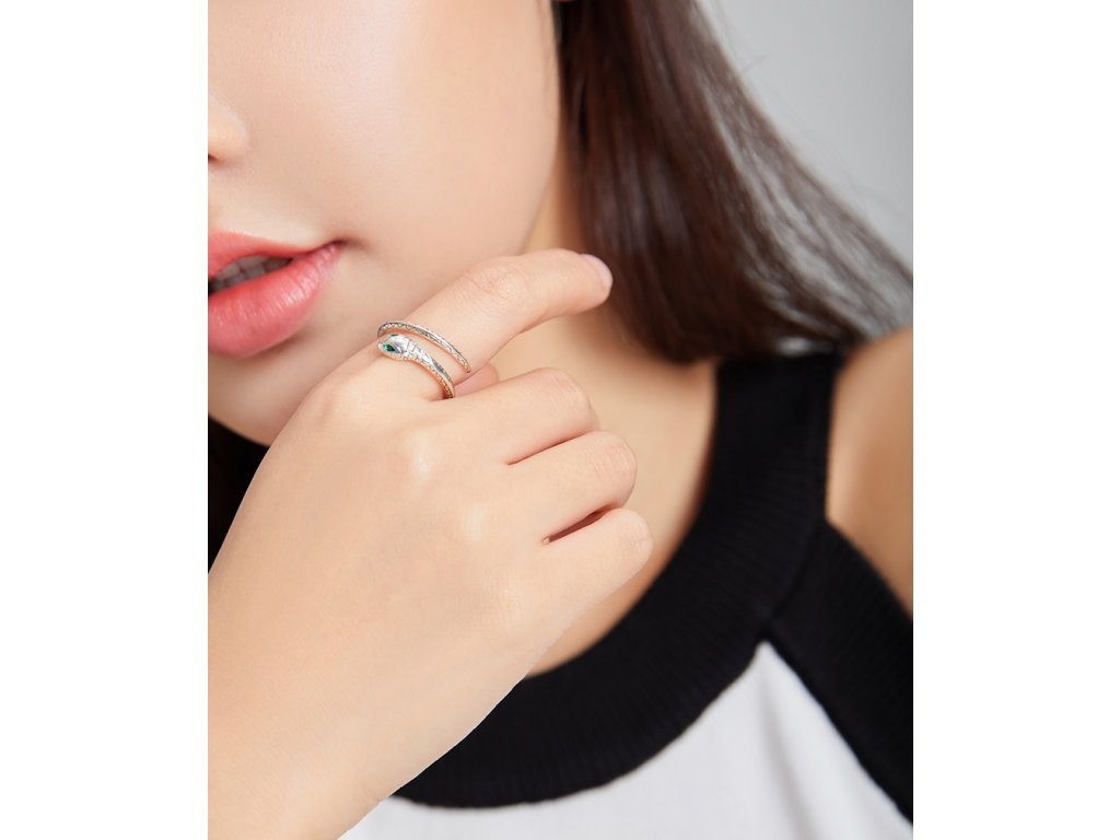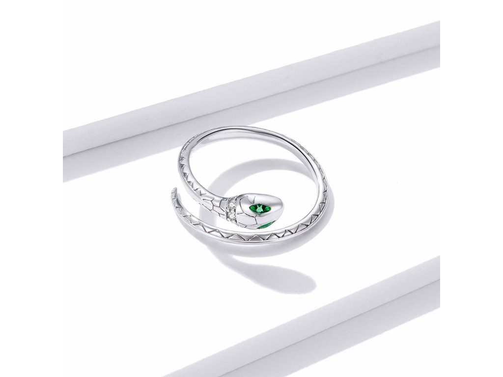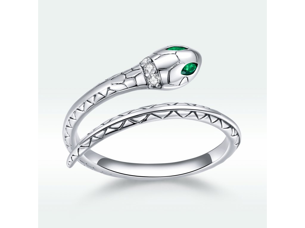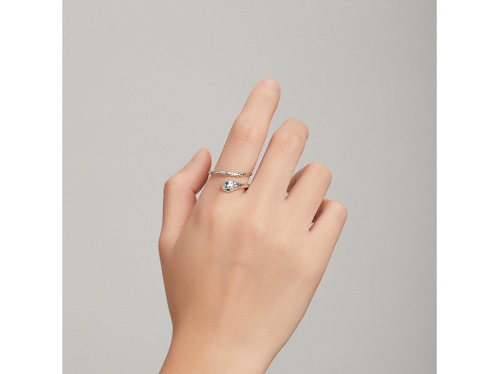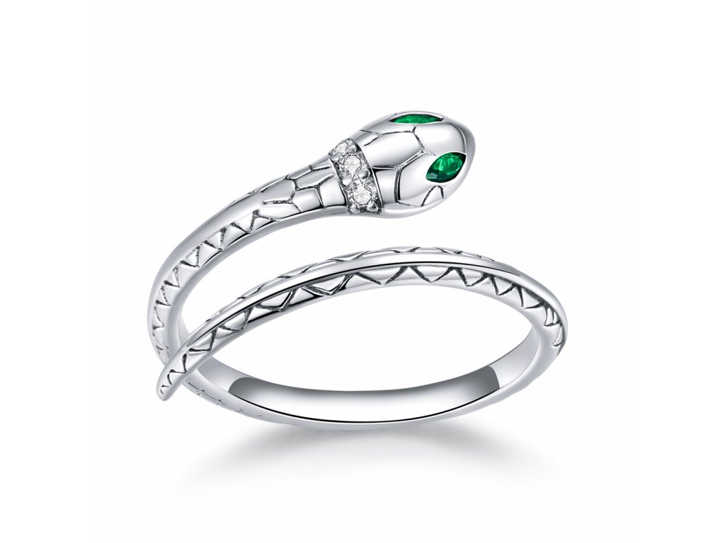 - Strieborný nastaviteľný prsteň v štýlovom dizajne hada zdobeného smaragdovými a čírymi trblietavými a zirkónmi. Originálny dizajn prsteňa, kvalitné spracovanie a materiál, ručne dohotovené.