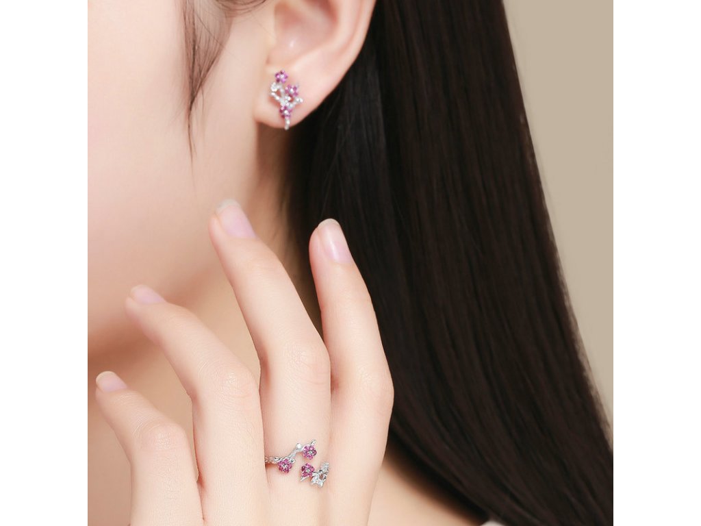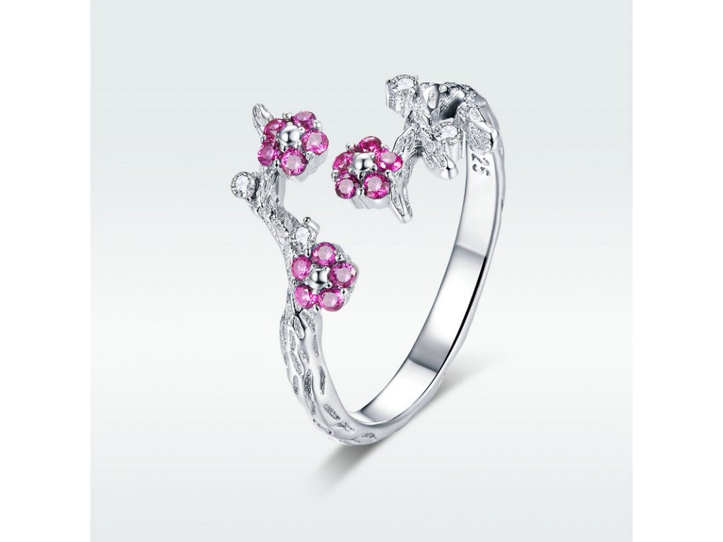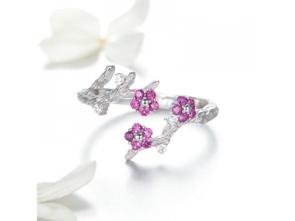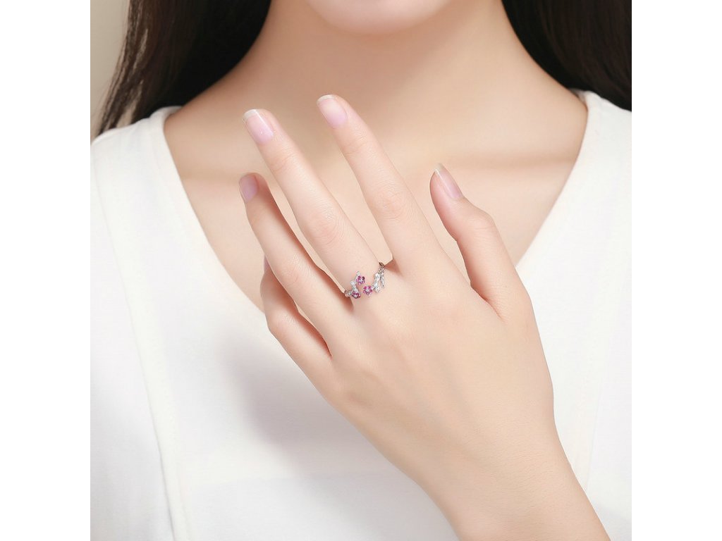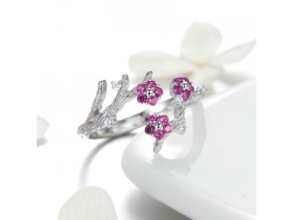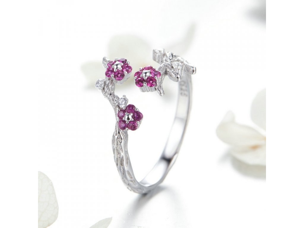 - Luxusný strieborný prsteň v dizajne zimnej kvetiny zdobenej fialovými zirkónmi.