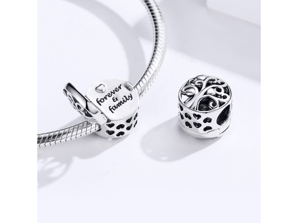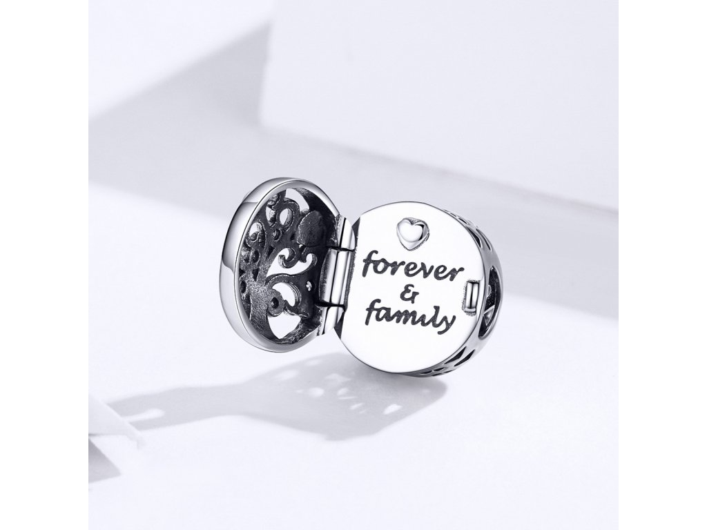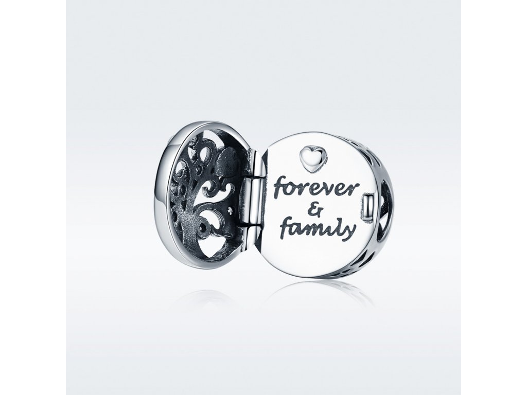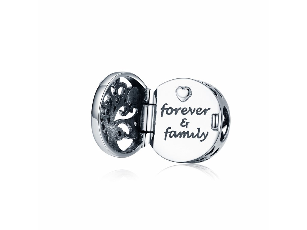- Strieborný otvárací prívesok v dizajne Forever Family v preklade Rodina navždy zdobený čírymi zirkónmi a ručne vyrezávanými srdiečkami po stranách.