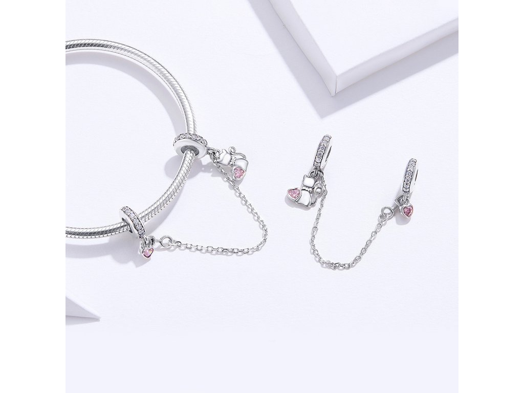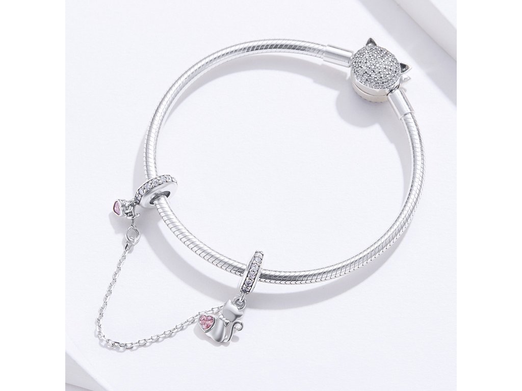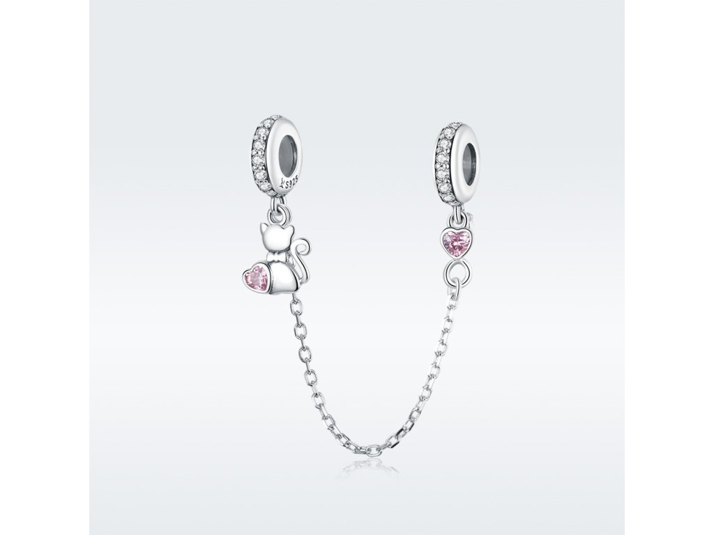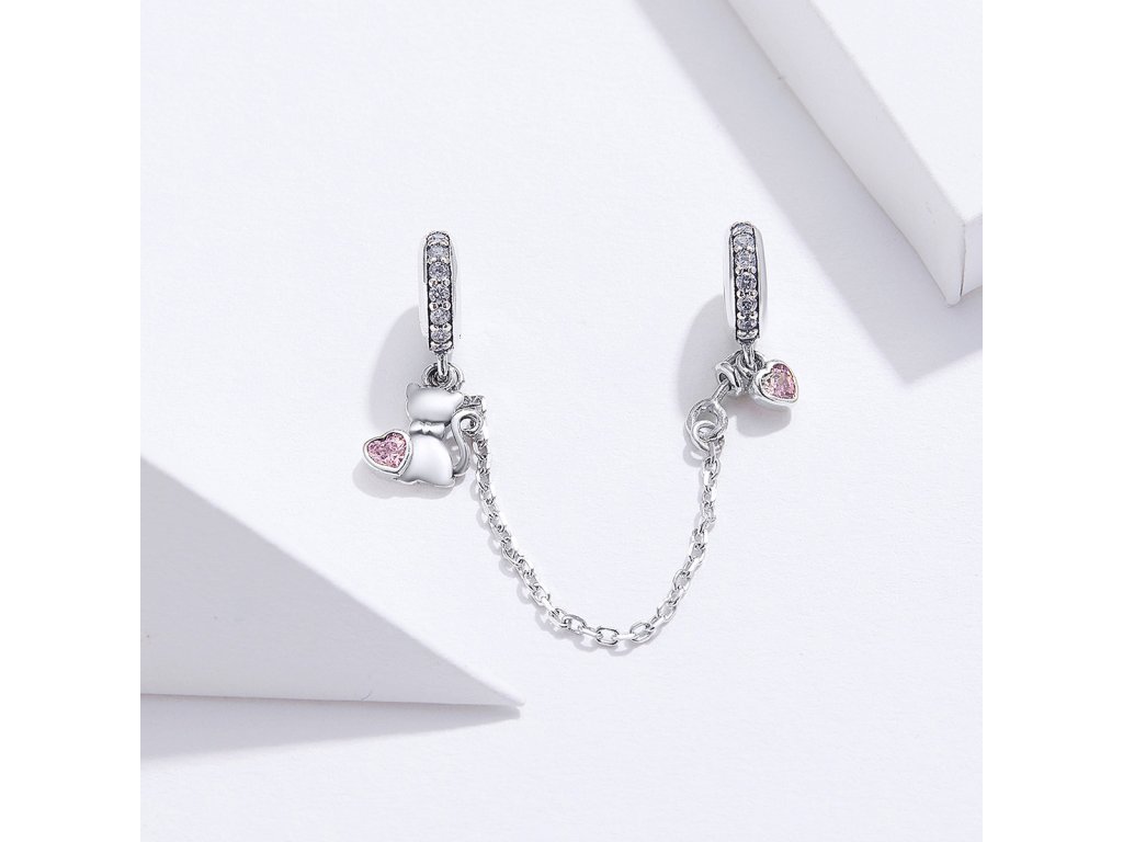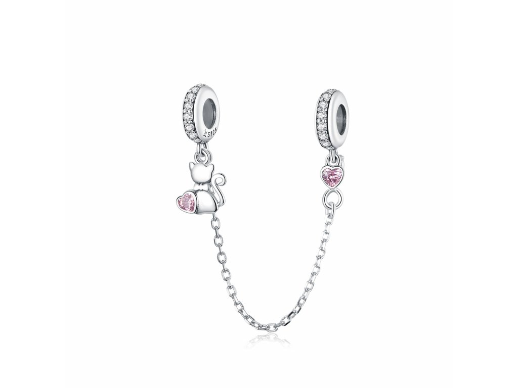 - Strieborný prívesok / bezpečnostná retiazka v dizajne Milované mačky zdobený ružovými a čírymi trblietavými zirkónmi.