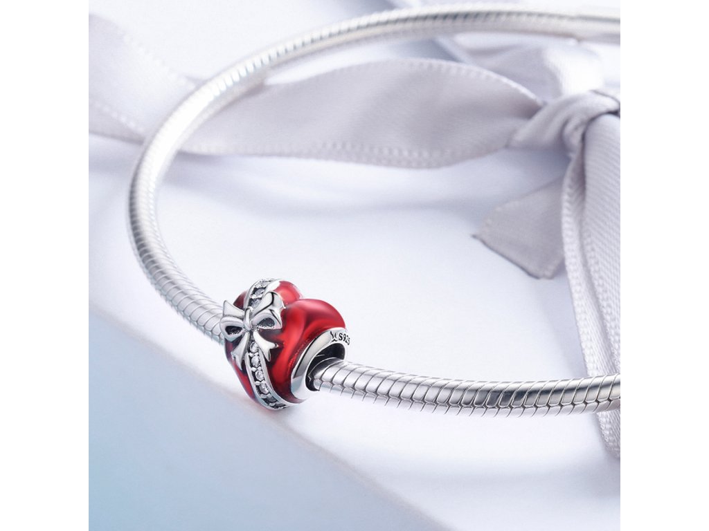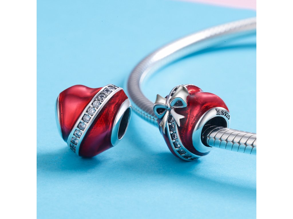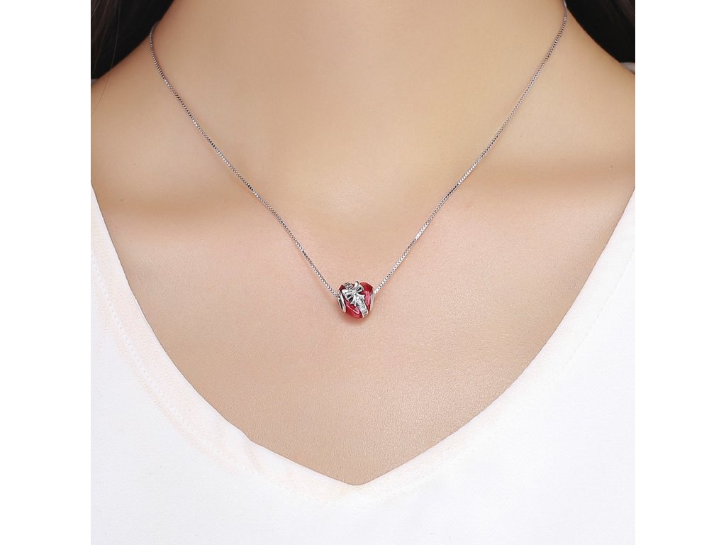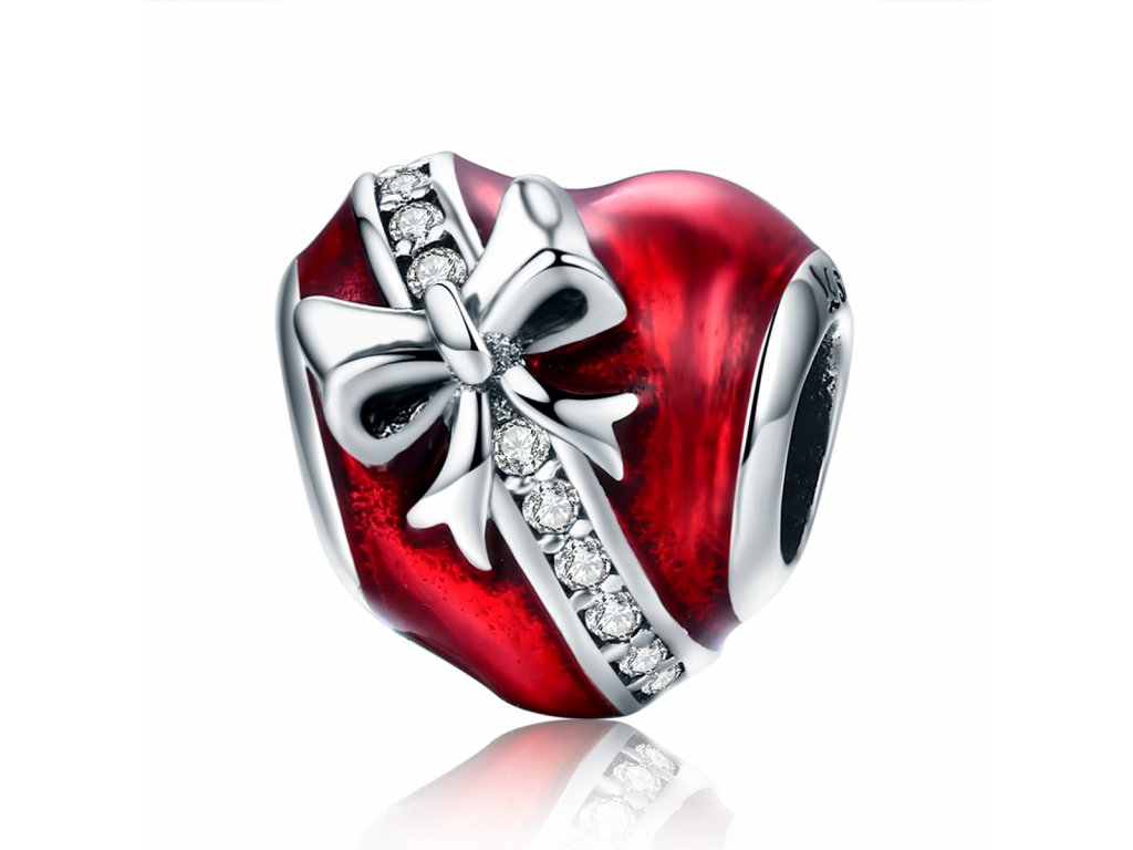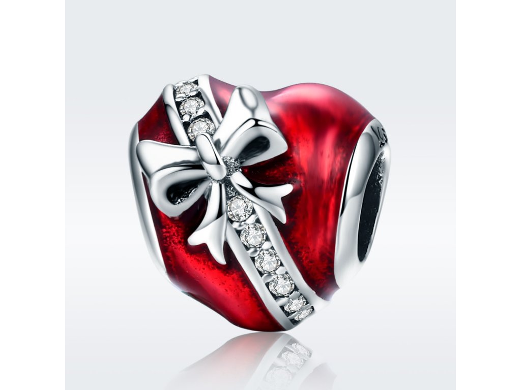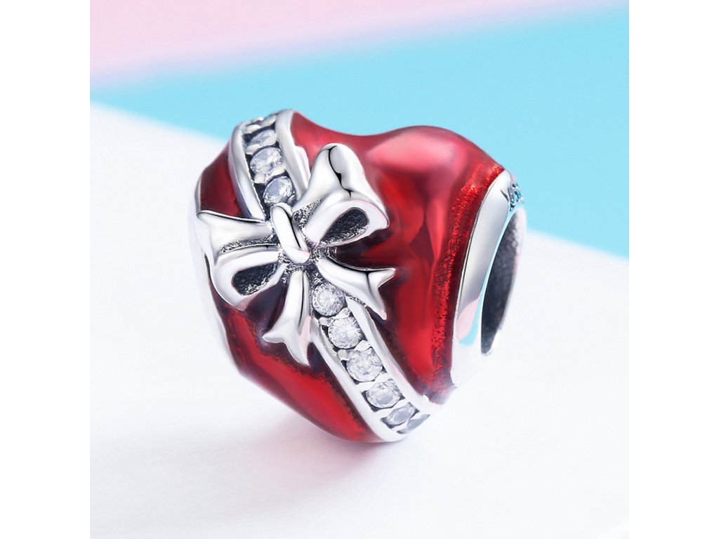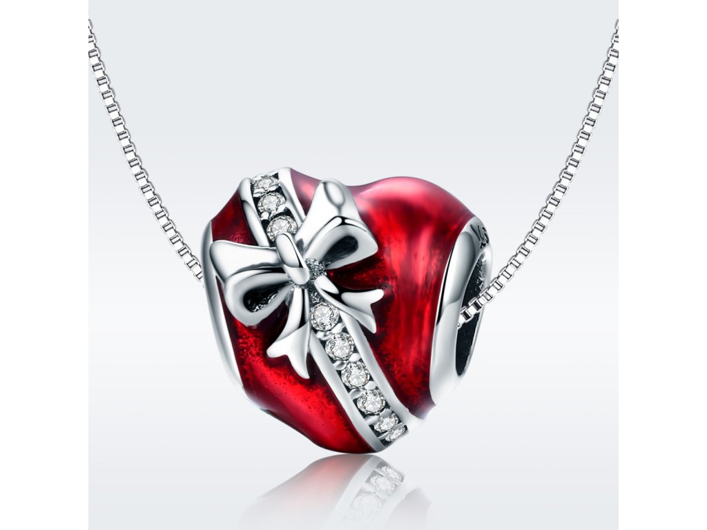 - Prívesok v dizajne srdce s mašľou zdobeného červenou glazúrou a zirkónmi.
