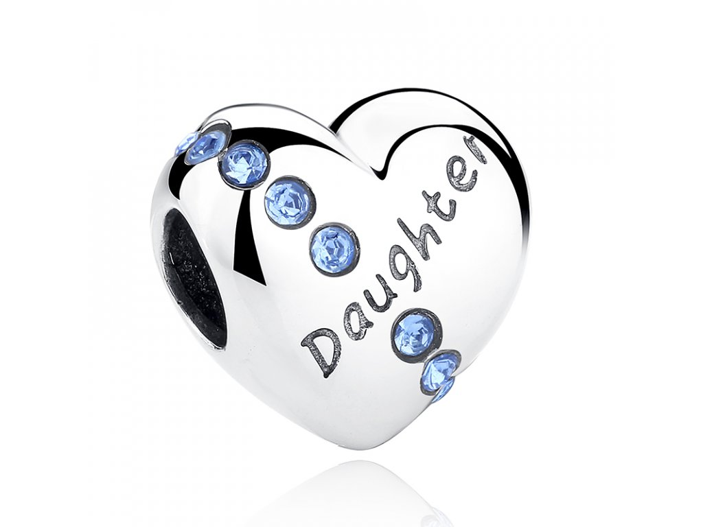 - Luxusný prívesok v tvare srdca obohatený trblietavými modrými kameňmi a anglickým nápisom "Daughter" (v preklade "Dcéra").