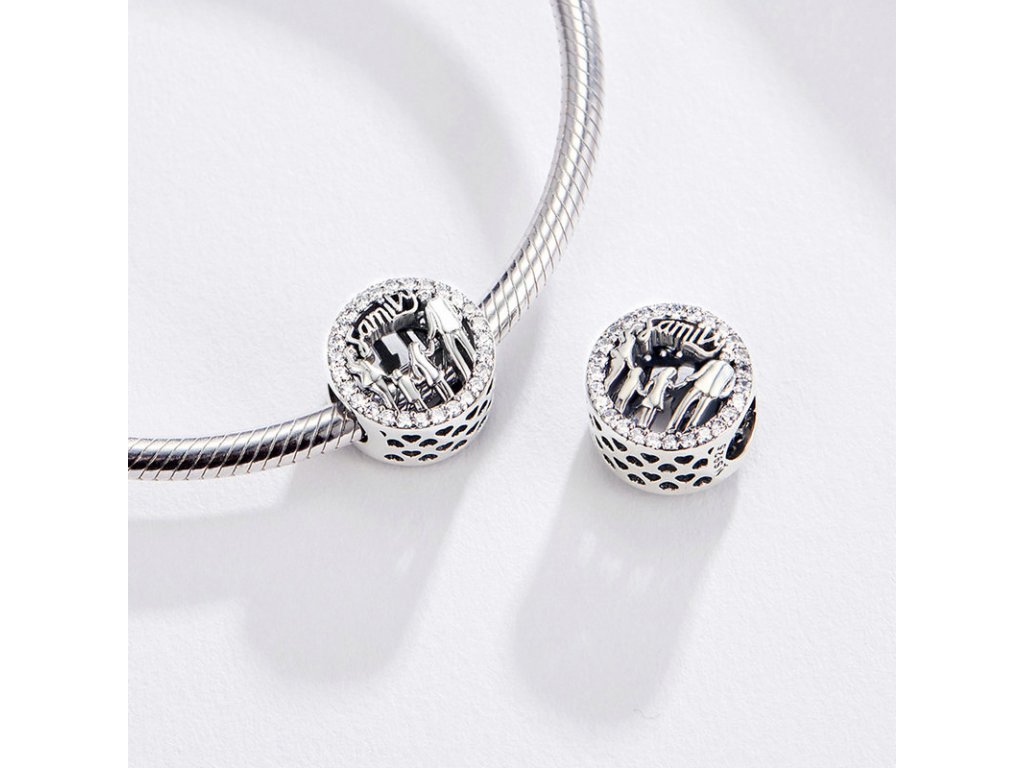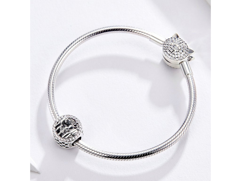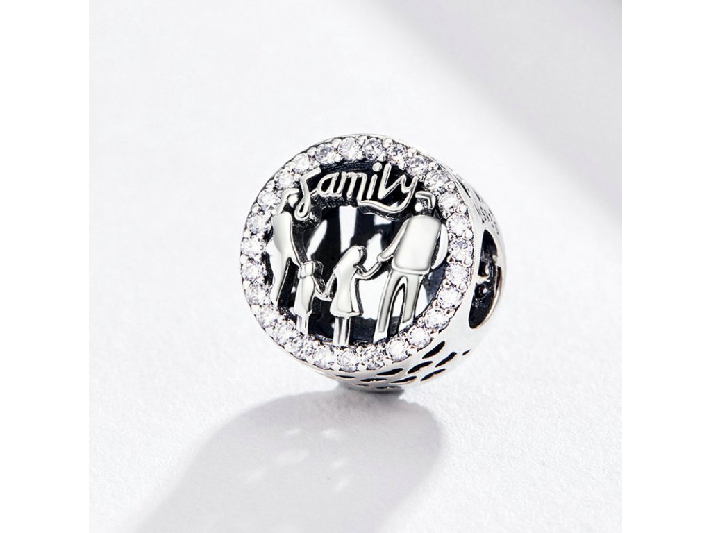 - Strieborný prívesok v dizajne Šťastné rodinky zdobený čírymi zirkónmi a anglickým nápisom "Family" v preklade "Rodina".