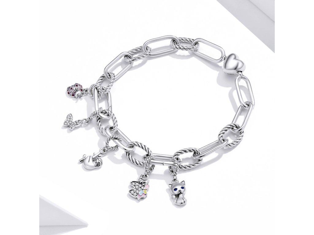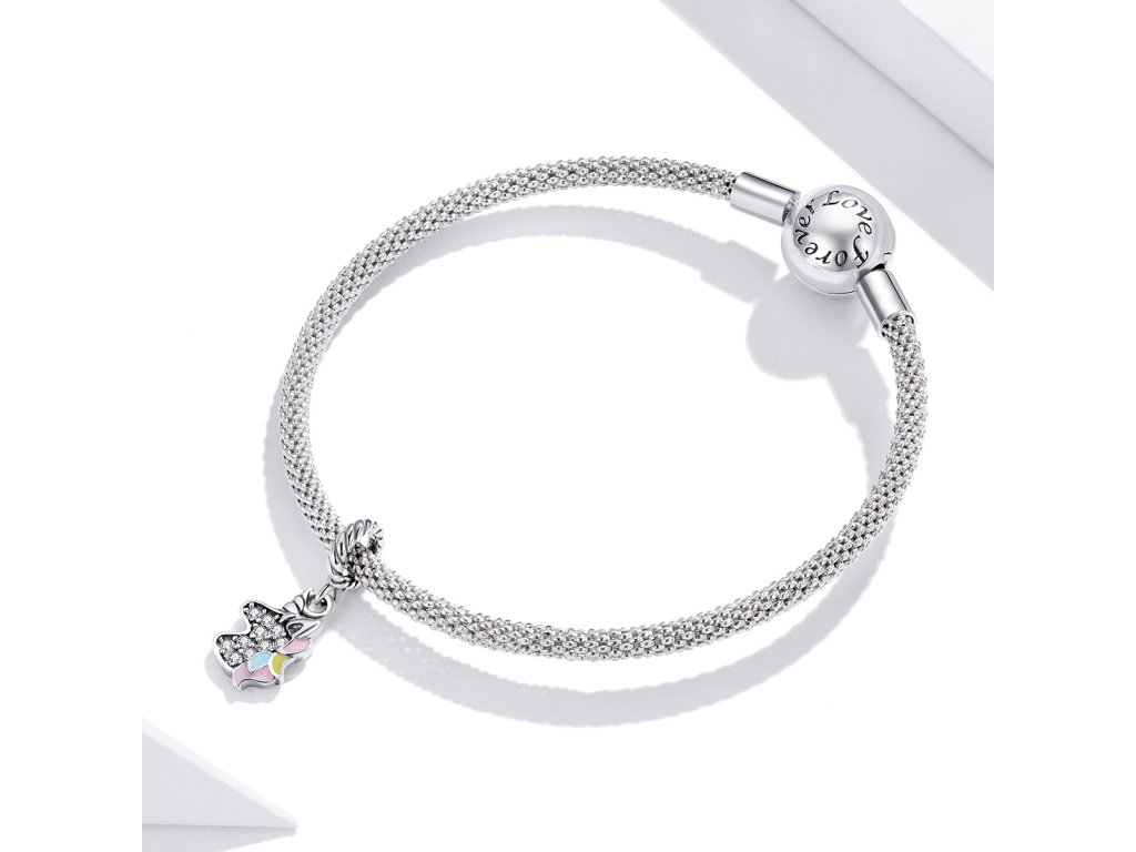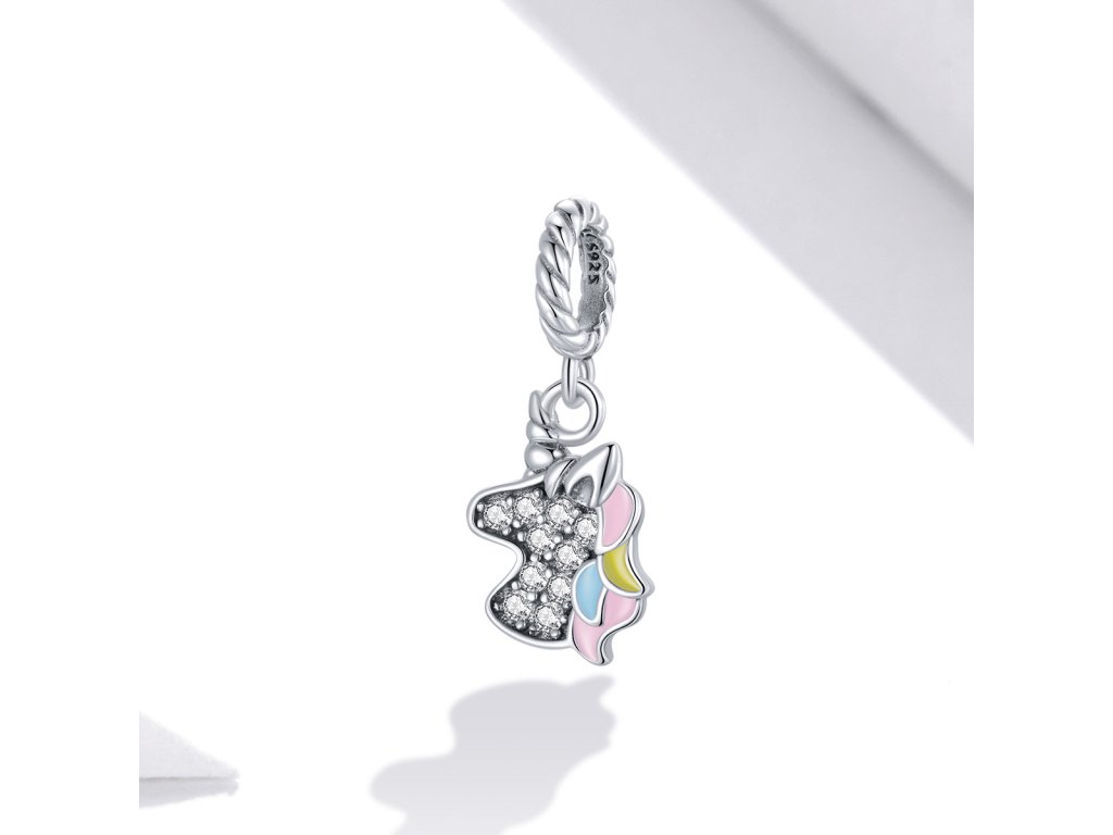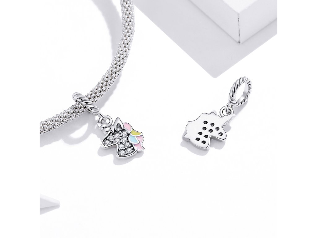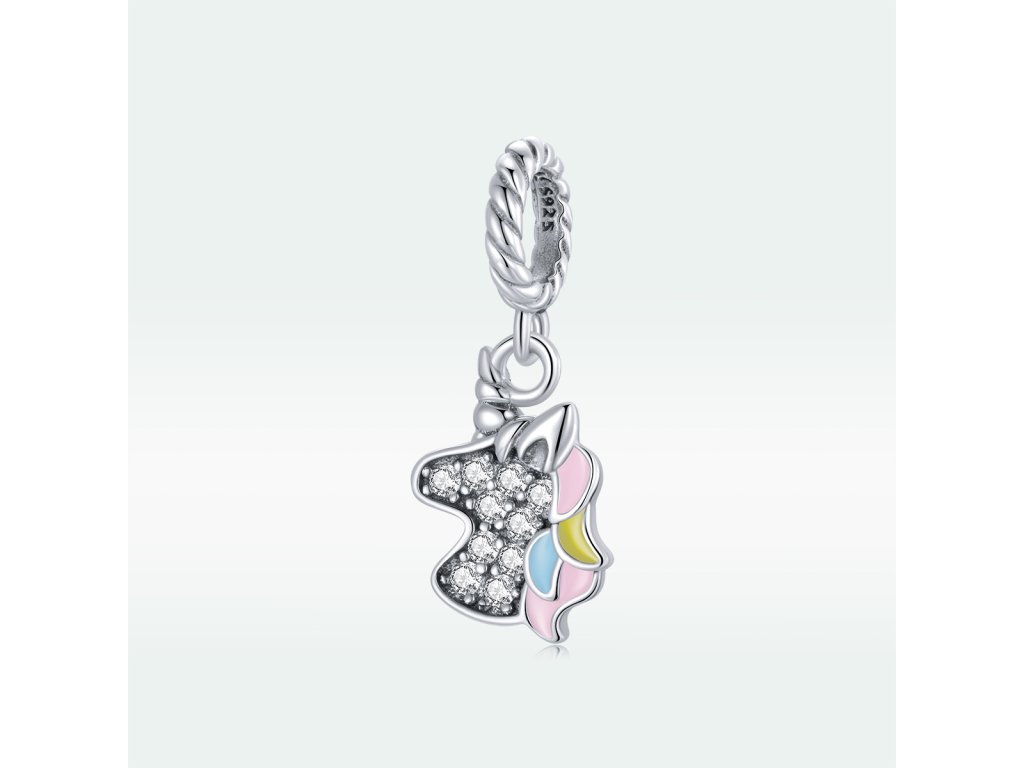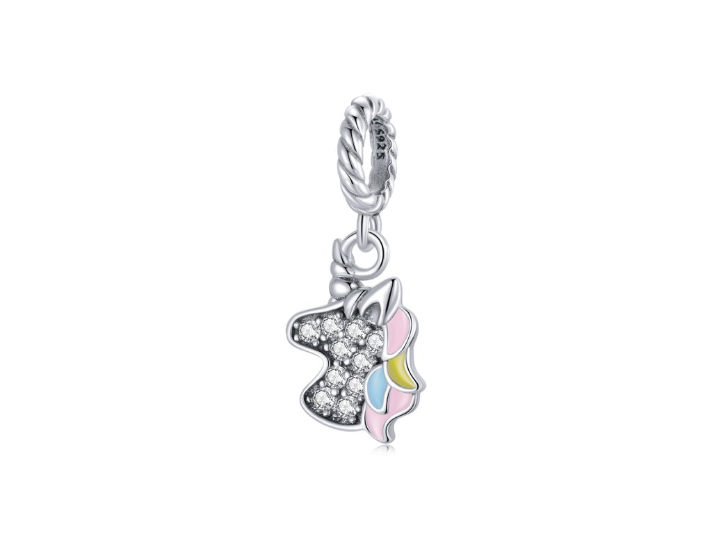 - Strieborný visiaci prívesok v dizajne rozprávkového jednorožca / unicorna zdobeného trblietavými kameňmi a ručne nanášanou farebnou glazúrou. Originálny design prívesku, kvalitné spracovanie a materiál, ručne dohotovené.
