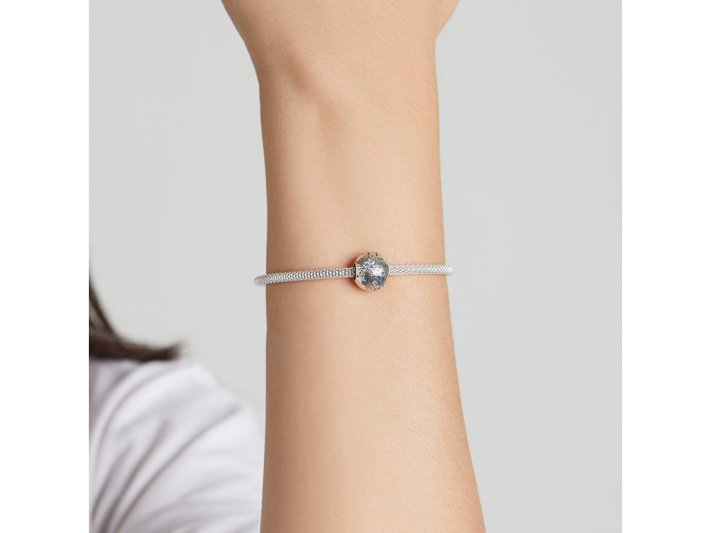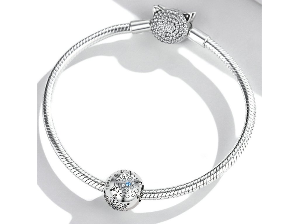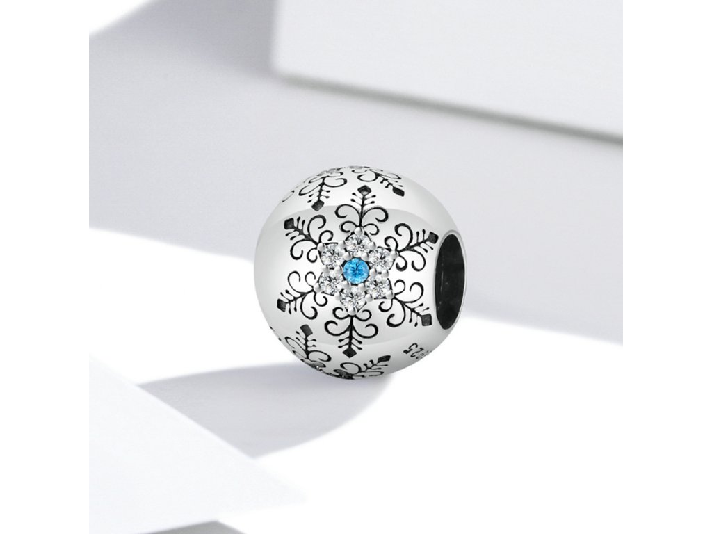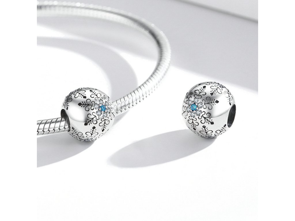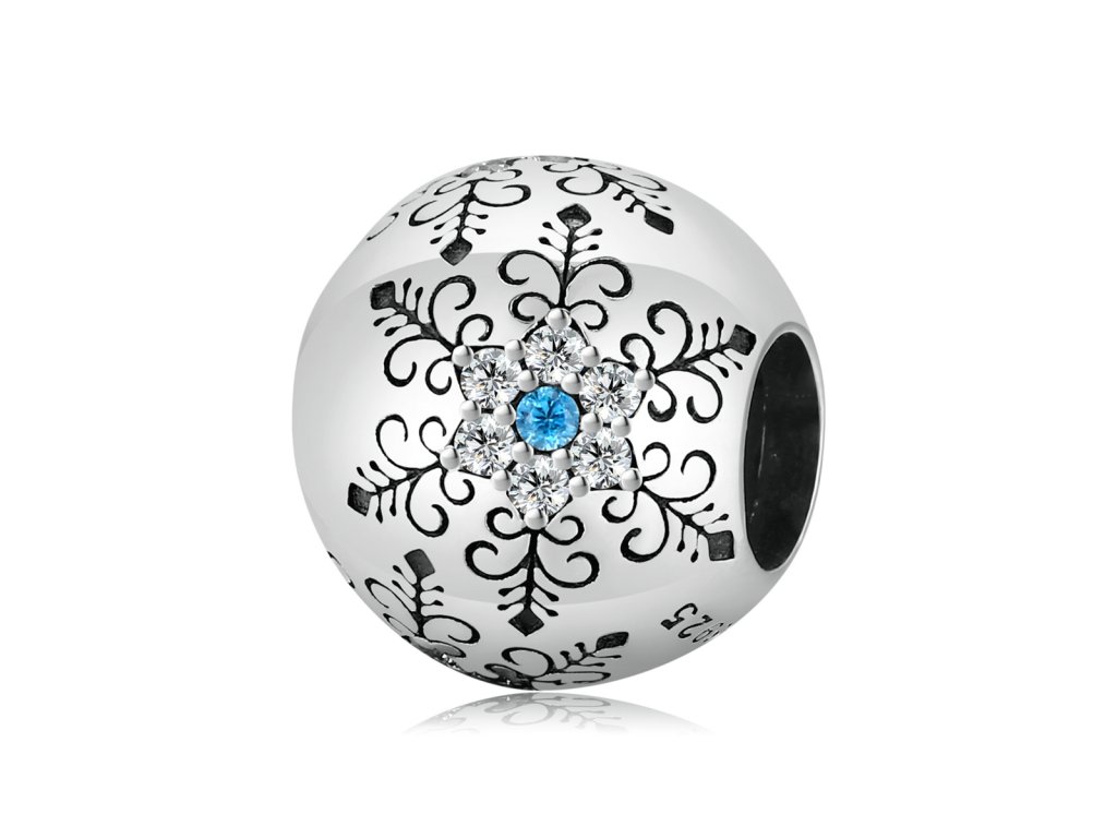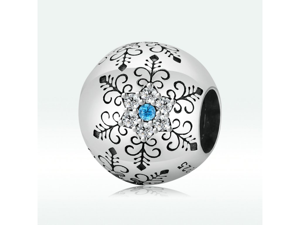 - Strieborný prívesok alebo korálek zdobený snehovými vločkami s ručne posádzanými svetlo modrými a čírymi trblietavými zirkónmi. Originálny design prívesku, kvalitné spracovanie a materiál, ručne dohotovené.