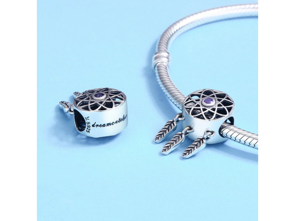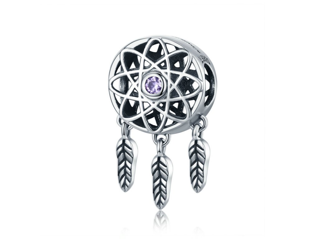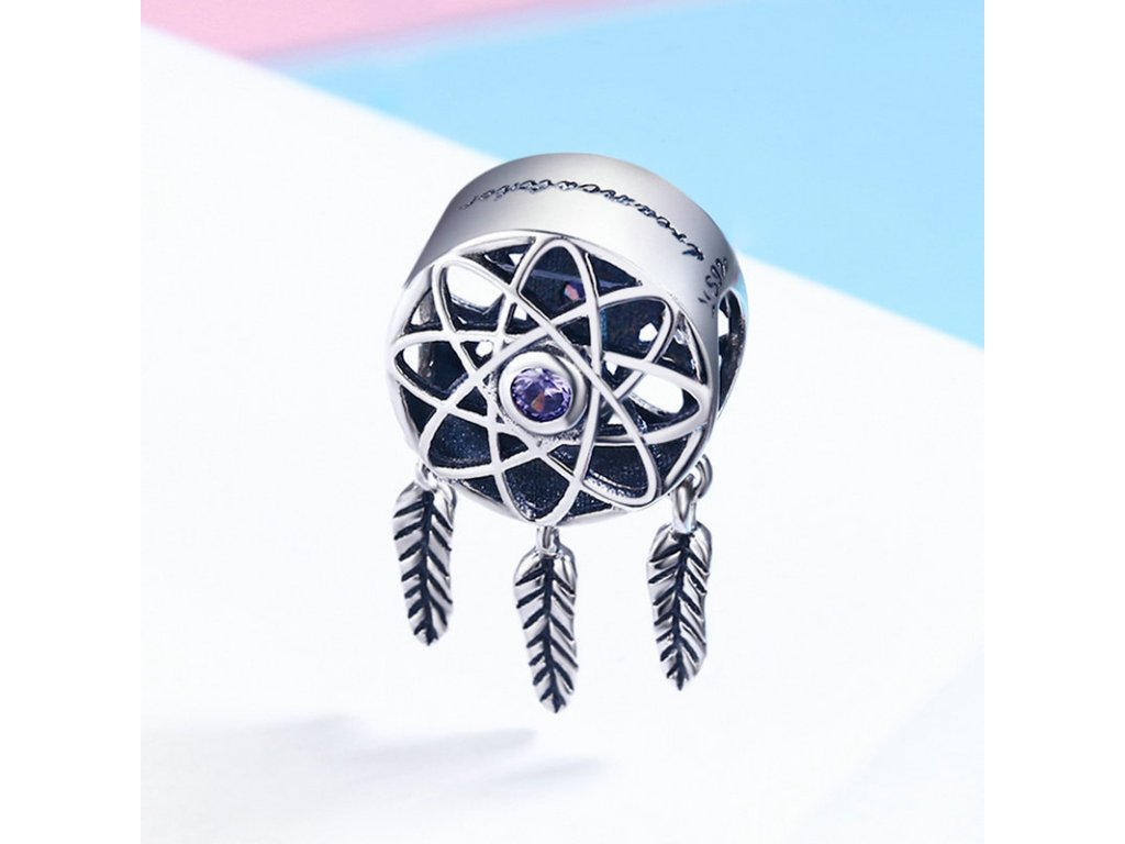 - Luxusný a prepracovaný prívesok v dizajne známeho lapače snov zdobeného trblietavými purpurovými kamene a anglickým nápisom "Dream Catcher" v preklade "Lapač snov".