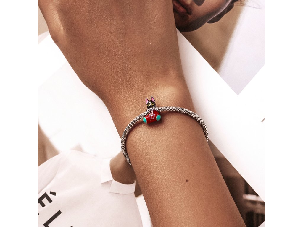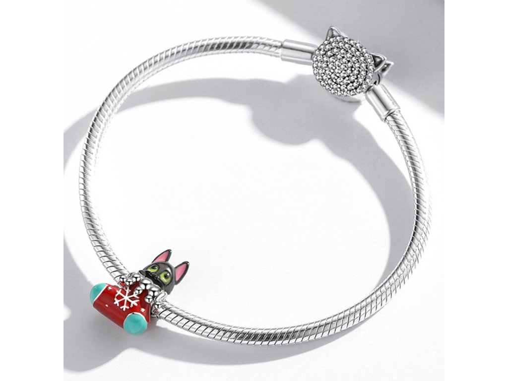 - Strieborný prívesok v dizajne roztomilé mačičky vo vianočnej pančuši zdobenej striebornými snehovými vločkami. Prívesok je zdobený ručne nanášanou farebnou glazúrou. Originálny design prívesku, kvalitné spracovanie a materiál, ručne dohotovené.