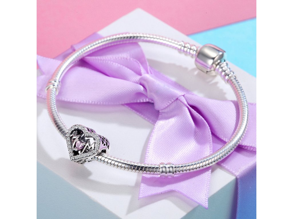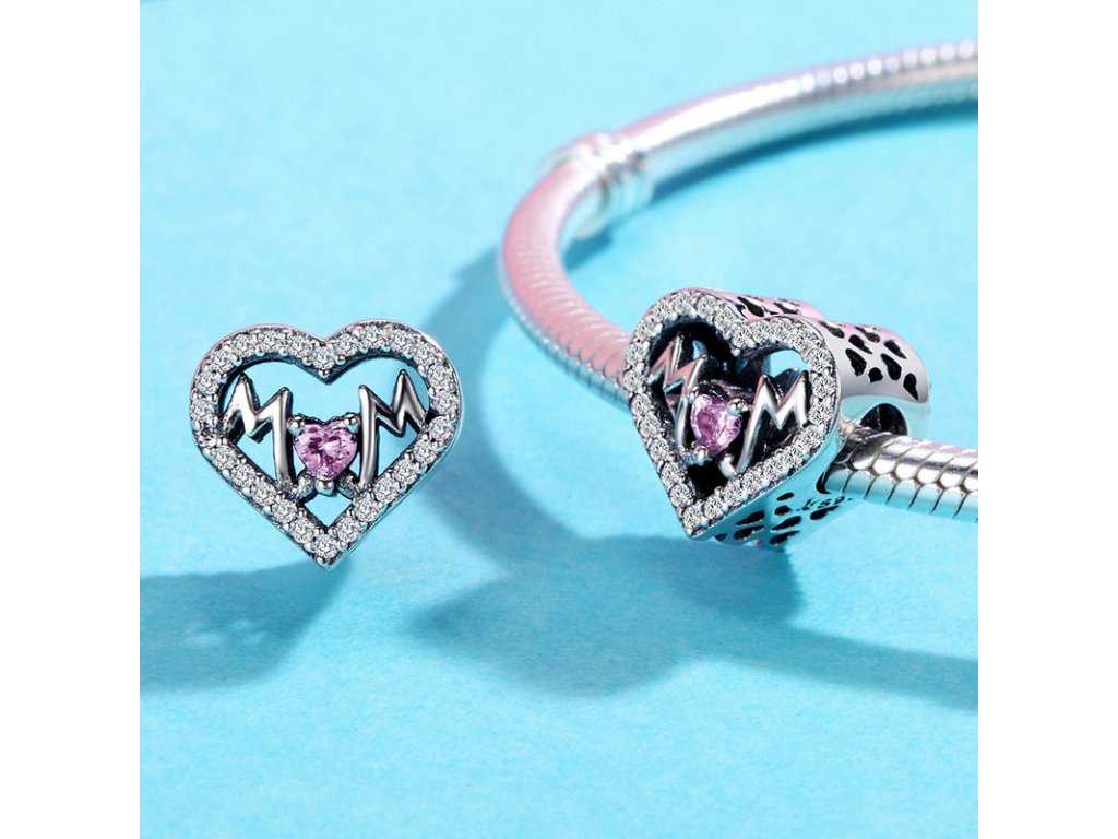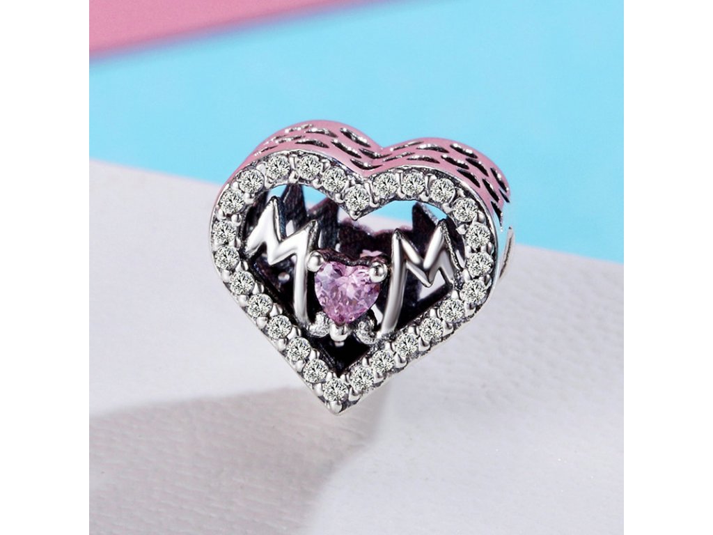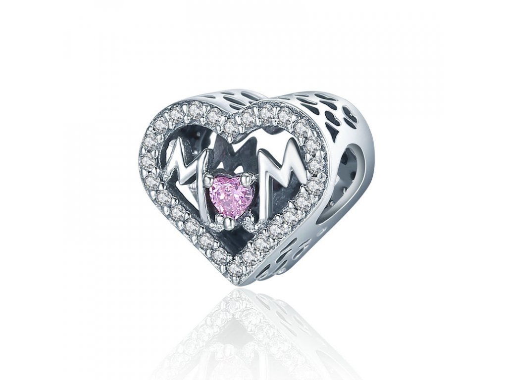 - Luxusný a propracovaný prívesek v designu třpytivého srdca s anglickým nápisom „Mom“ v překladu „Máma“. Přívěsek je po stranách zdobený ručne vyrezávanými milovanými srdiečkami.