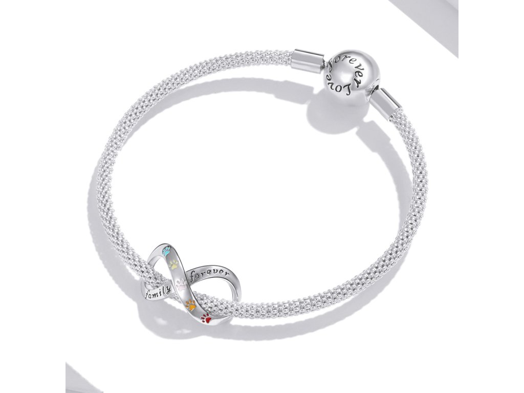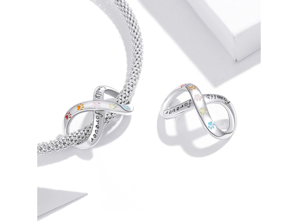 - Strieborný prívesok v dizajne symbolu nekonečna obohateného zvieracími packami zdobenými ručne nanášanou farebnou glazúrou. Prívesok je tiež zdobený anglickým textom „Family forever“ v preklade „Rodina navždy“. Originálny design prívesku, kvalitné spracovanie a materiál, ručne dohotovené.