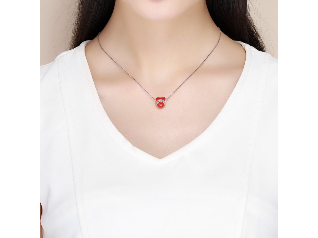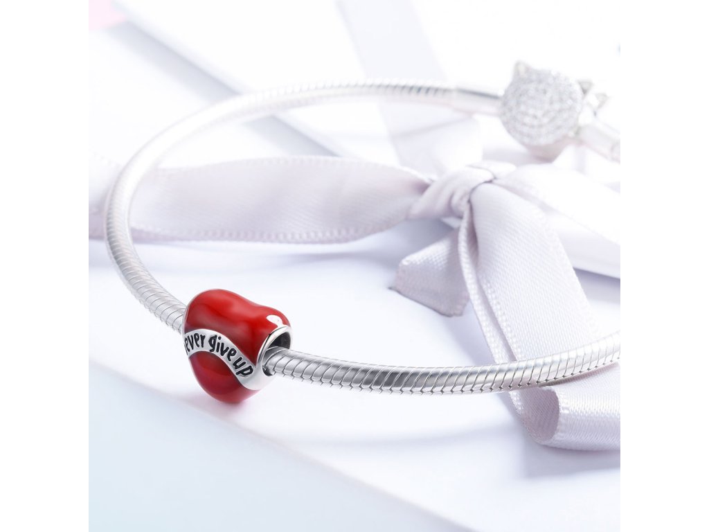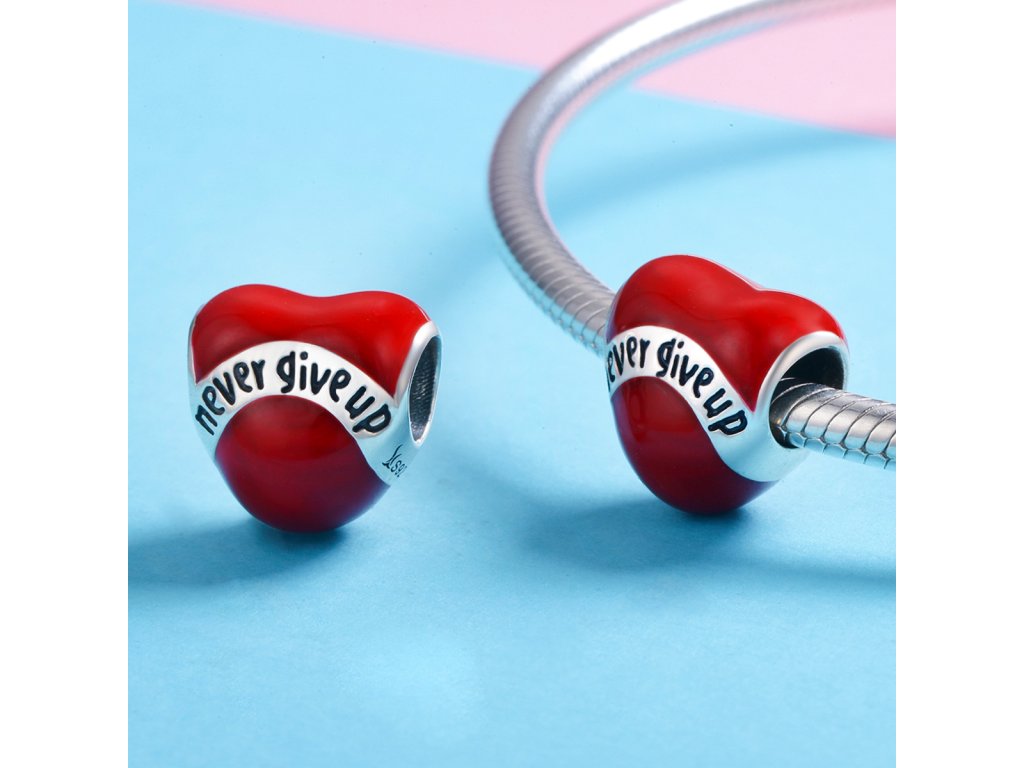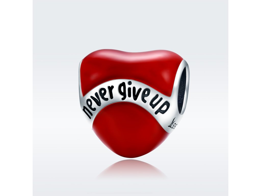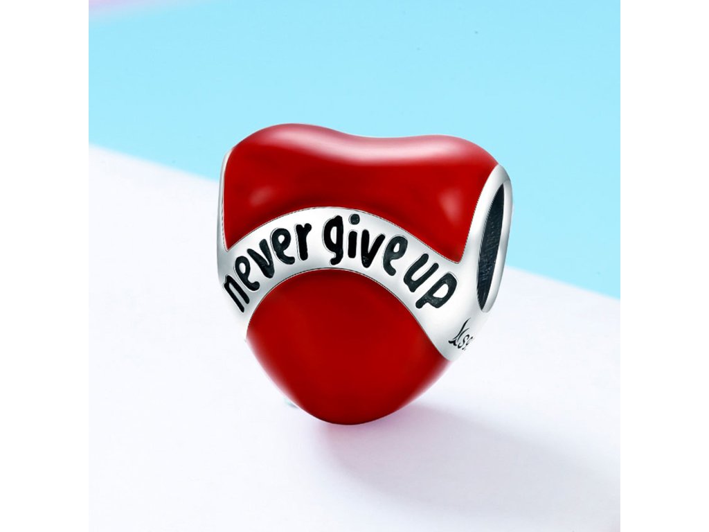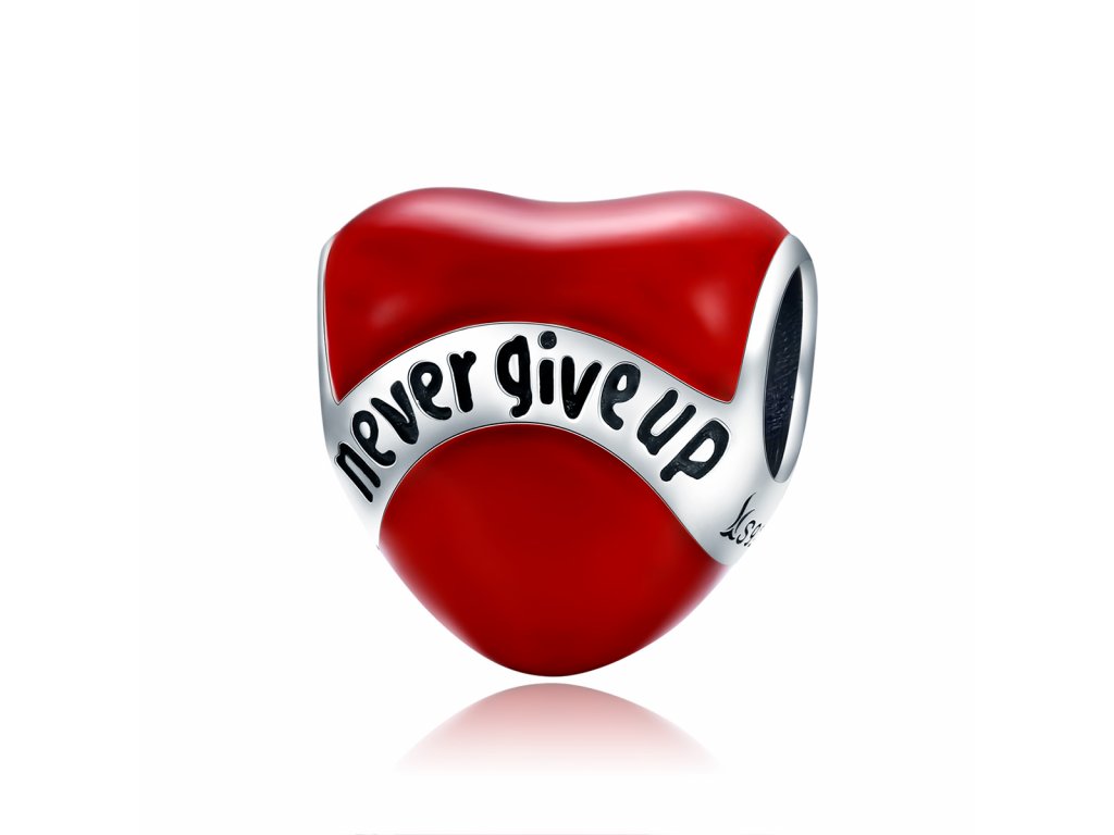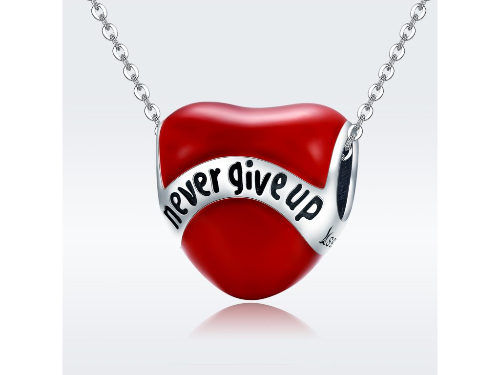 - Luxusný a prepracovaný strieborný prívesok v dizajne srdce s nápisom "Never give up" Nikdy sa nevzdávaj zdobený glazúrou.