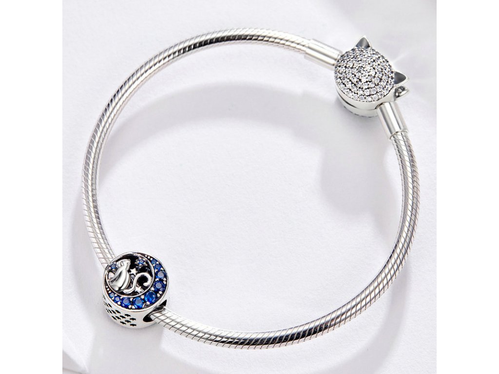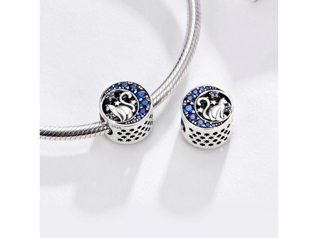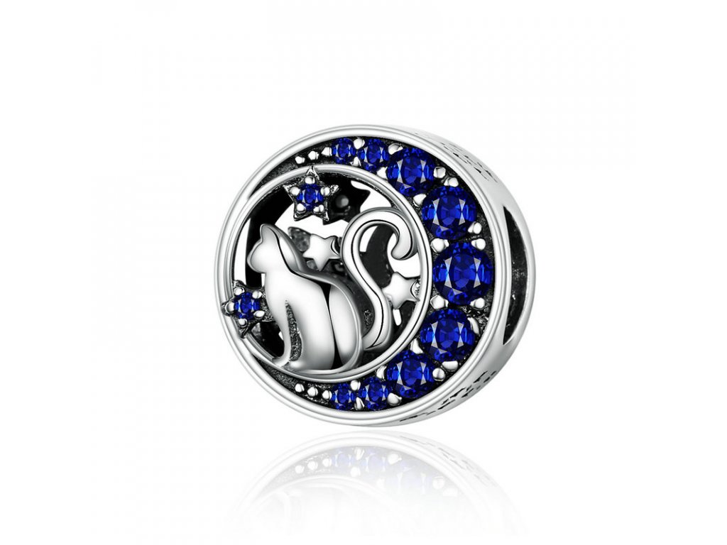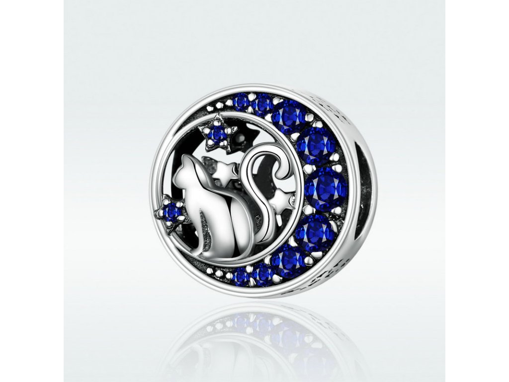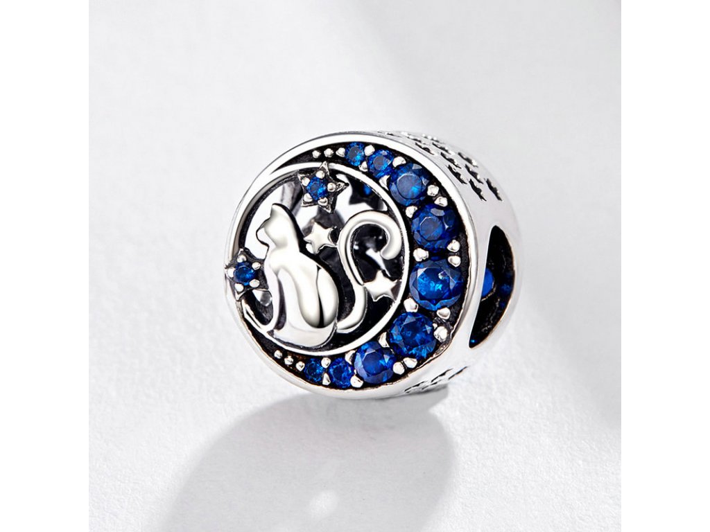 - Strieborný prívesok v dizajne Nočného života mačky s vyobrazeným mesiacom zdobeným tmavo modrými zirkónmi a ručne vyrezávanými hviezdičkami po stranách.