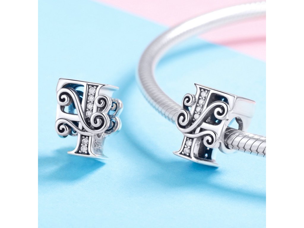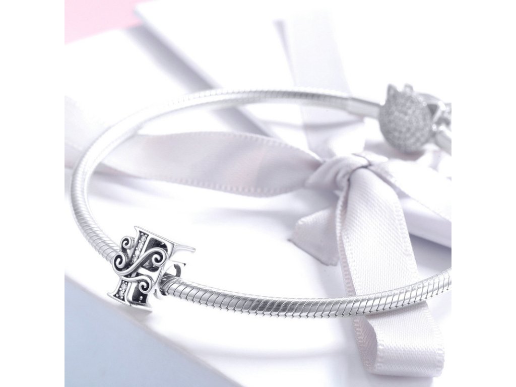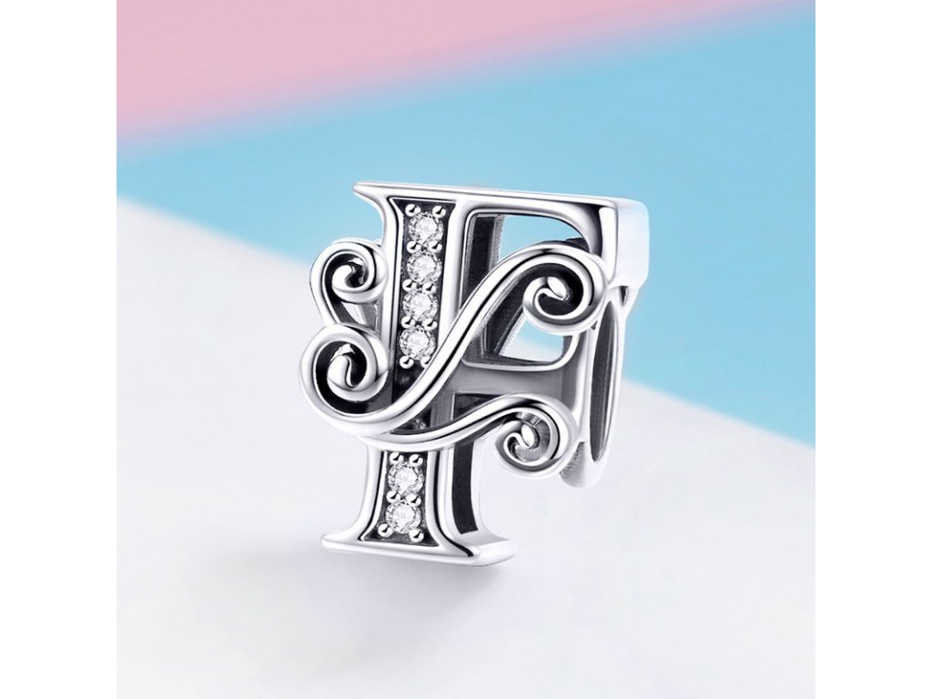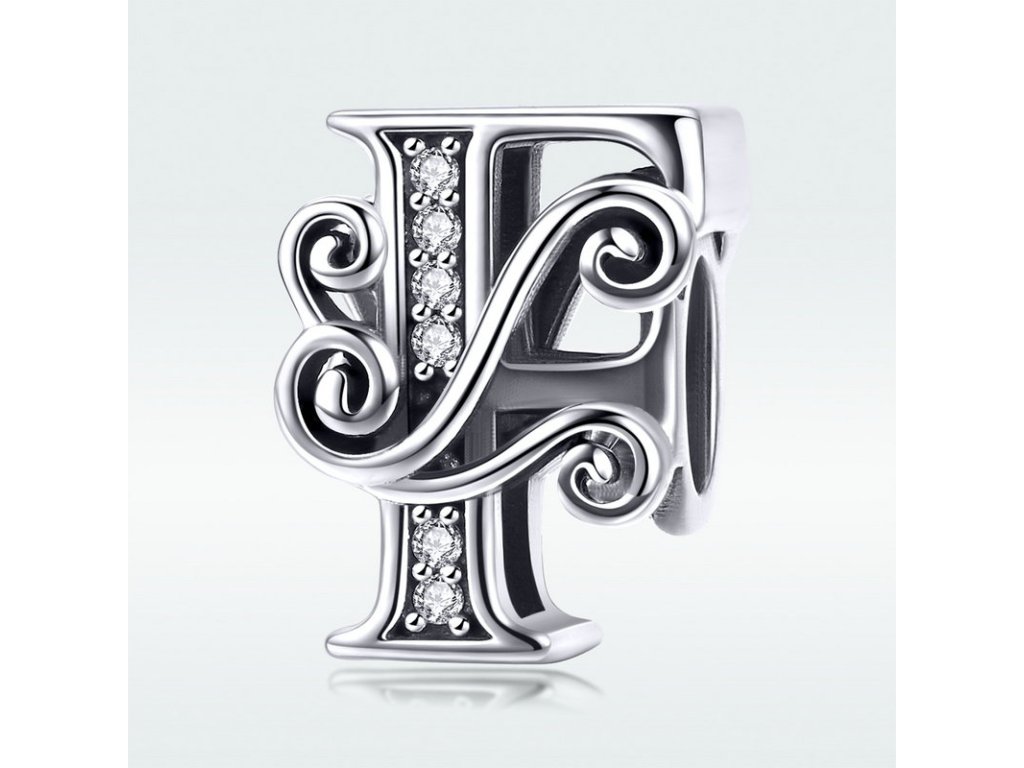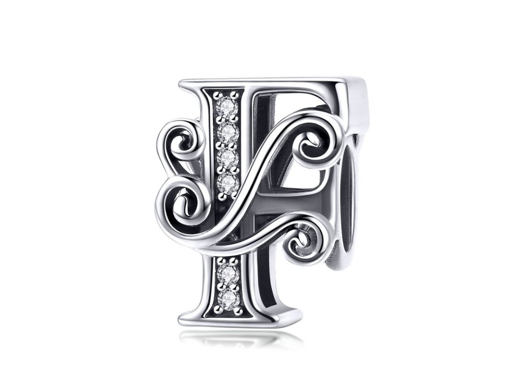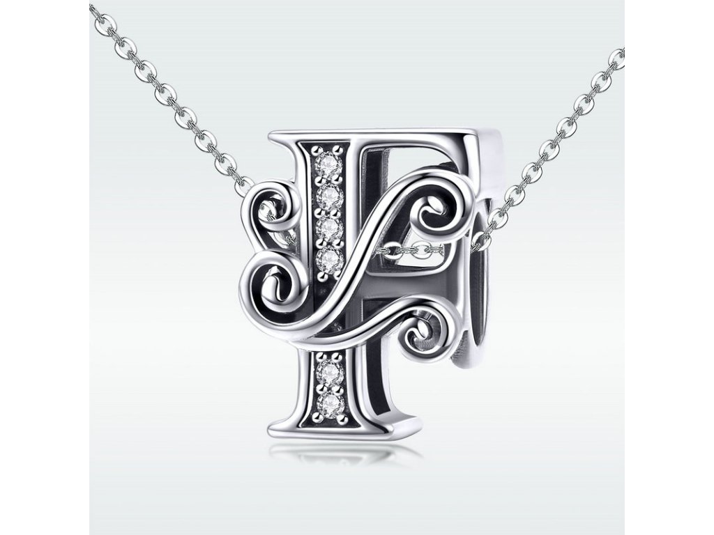 - Luxusný a prepracovaný strieborný prívesok v tvare písmenka "F" zdobený trblietavými zirkónmi.