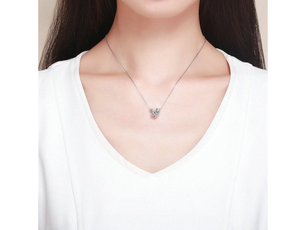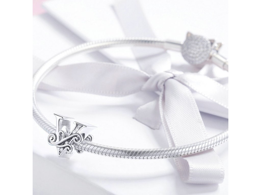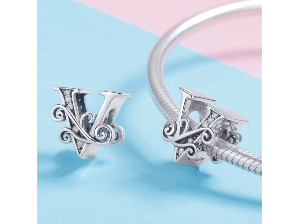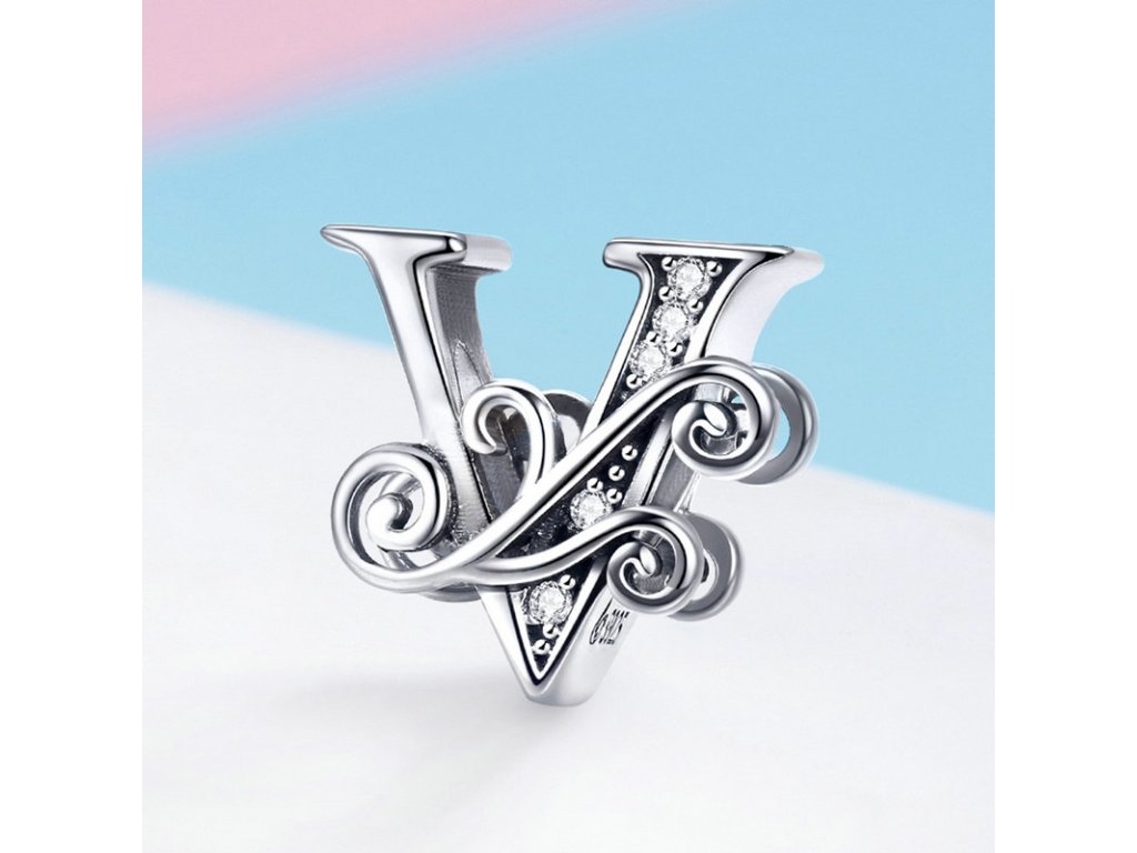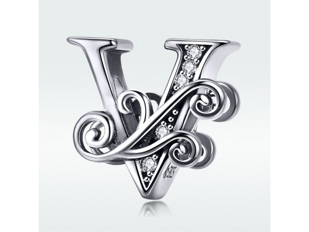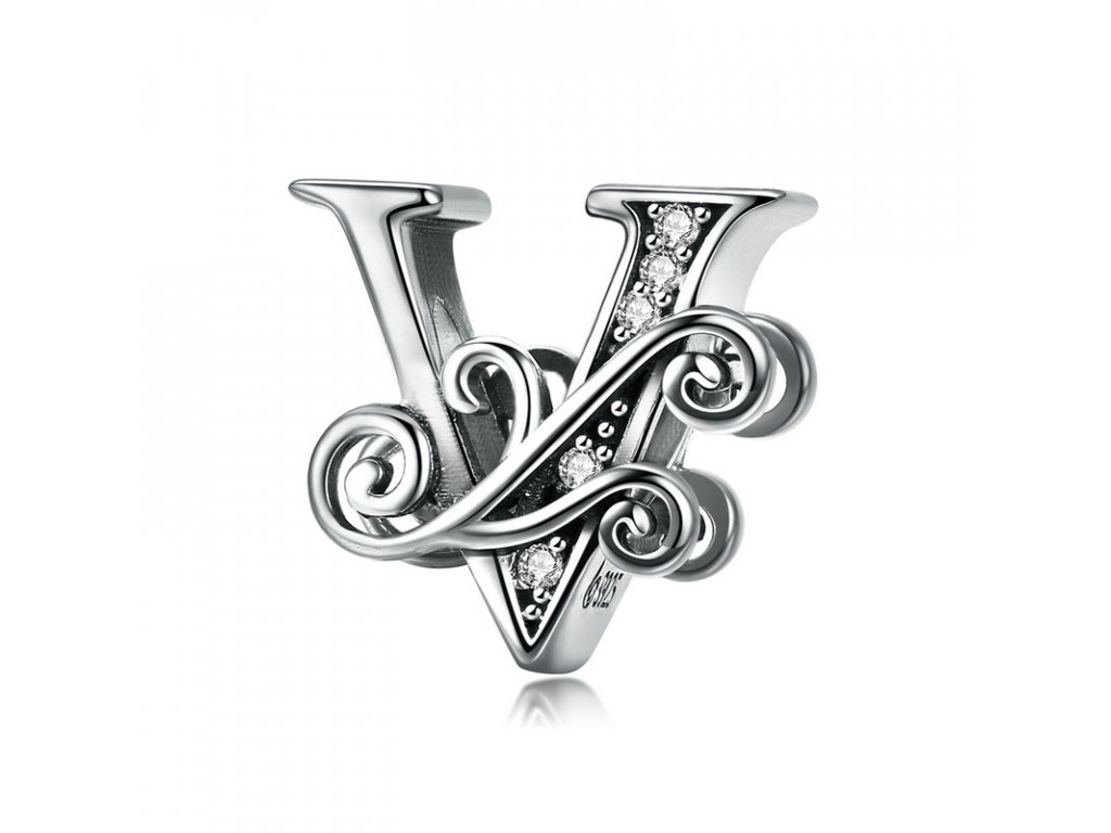 - Luxusný a prepracovaný strieborný prívesok v tvare písmenka "V" zdobený trblietavými zirkónmi.