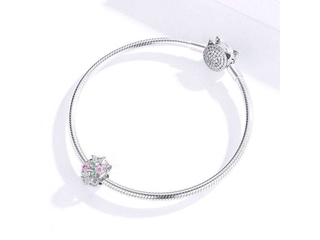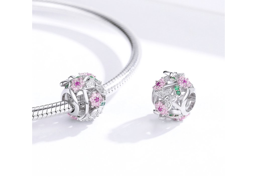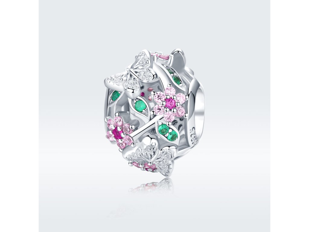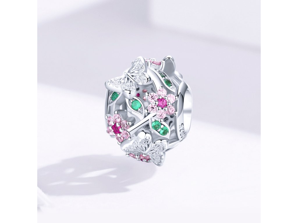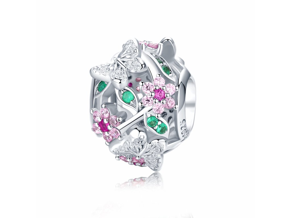 - Strieborný prívesok / korálek v dizajne Rozkvitnuté lúky zdobený motýliky, ružovými kvetmi a lístkami s farebnými zirkónmi.