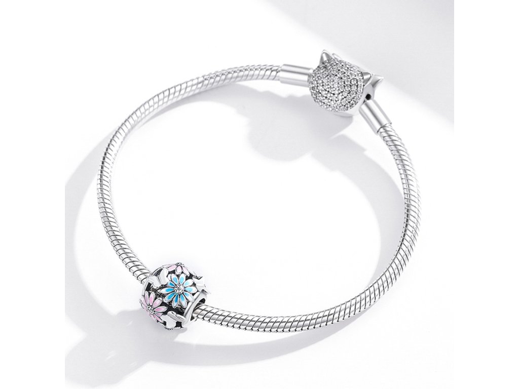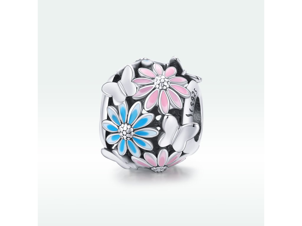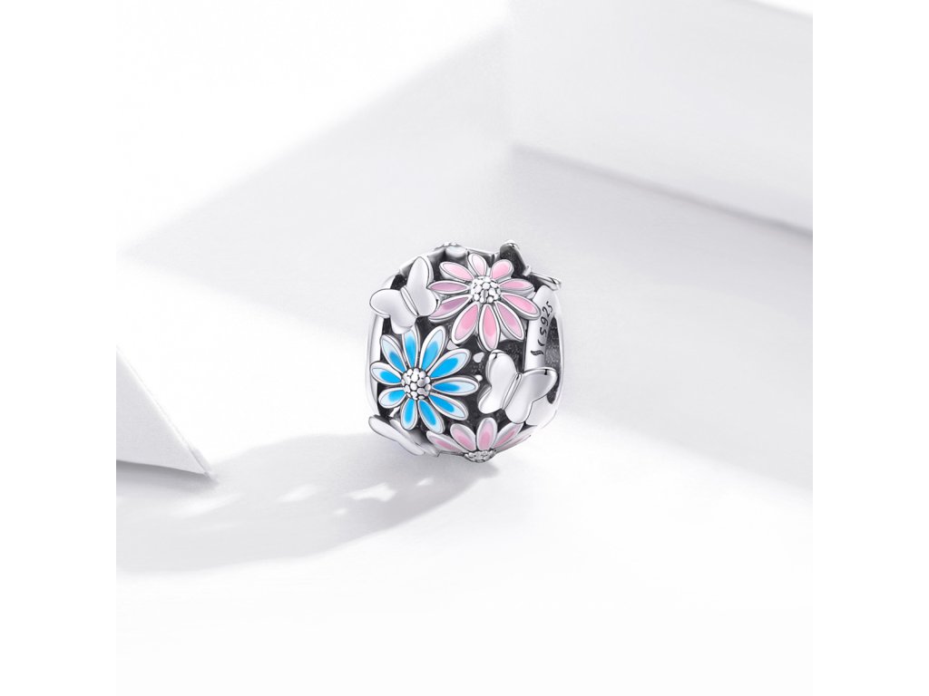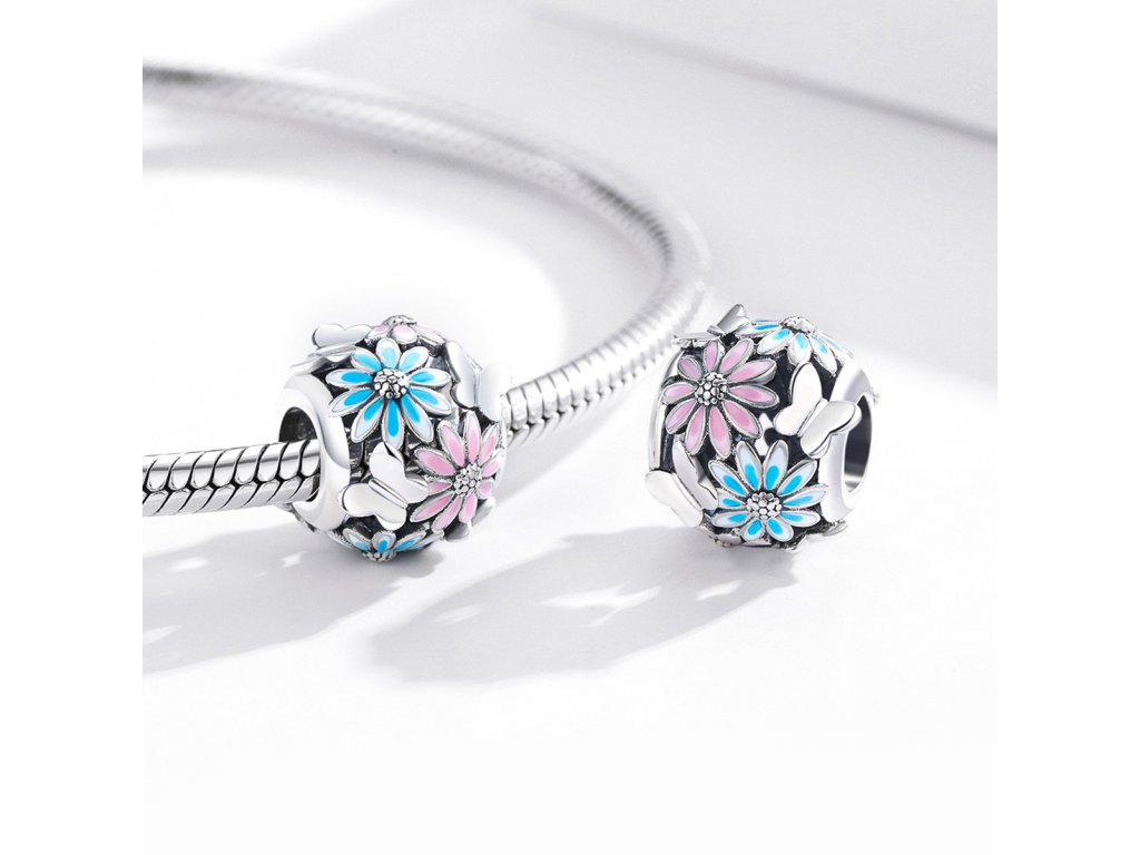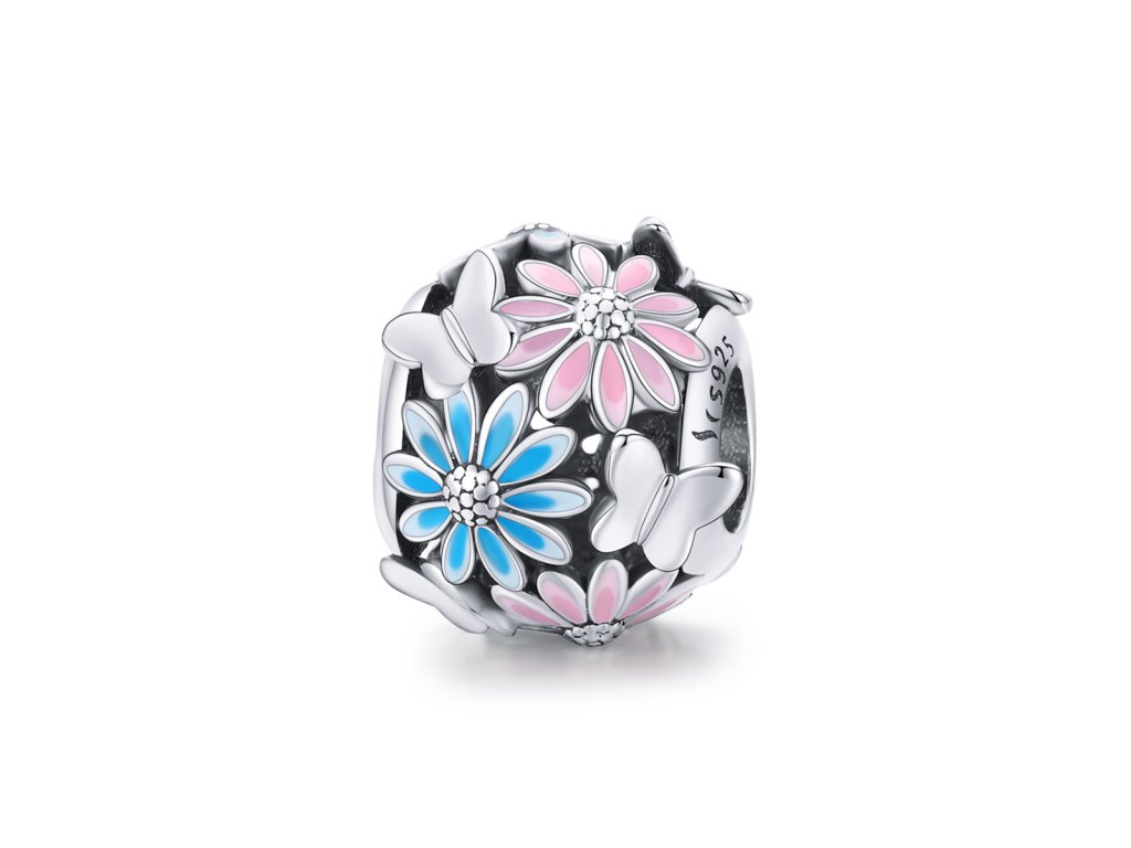 - Strieborný prívesok alebo korálek v dizajne Rozkvitnuté lúky zdobený striebornými motýlikami a kvetmi sedmokrások, ktoré sú ručne maľované ružovou a modrou glazúrou. Prívesok je tiež zdobený oxidáciou, aby strieborný dizajn viac vynikol. Originálny design prívesku, kvalitné spracovanie a materiál, ručne dohotovené.