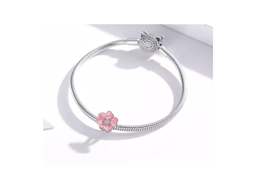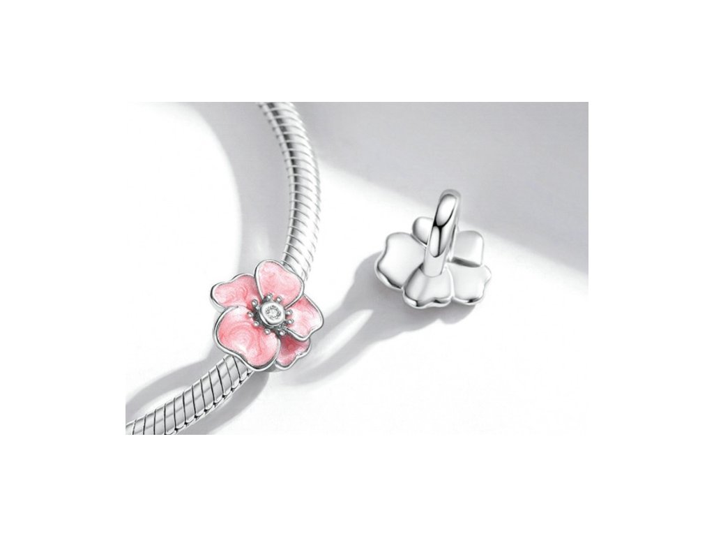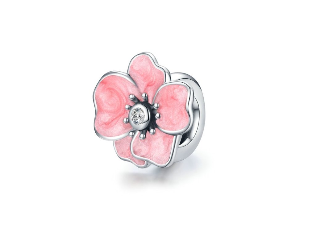 - Strieborný prívesok alebo spacer v dizajne Rozkvitnuté kvety zdobené čírym zirkónom a ručne nanášanou trblietavo ružovo-oranžovou glazúrou. Originálny design prívesku, kvalitné spracovanie a materiál, ručne dohotovené.