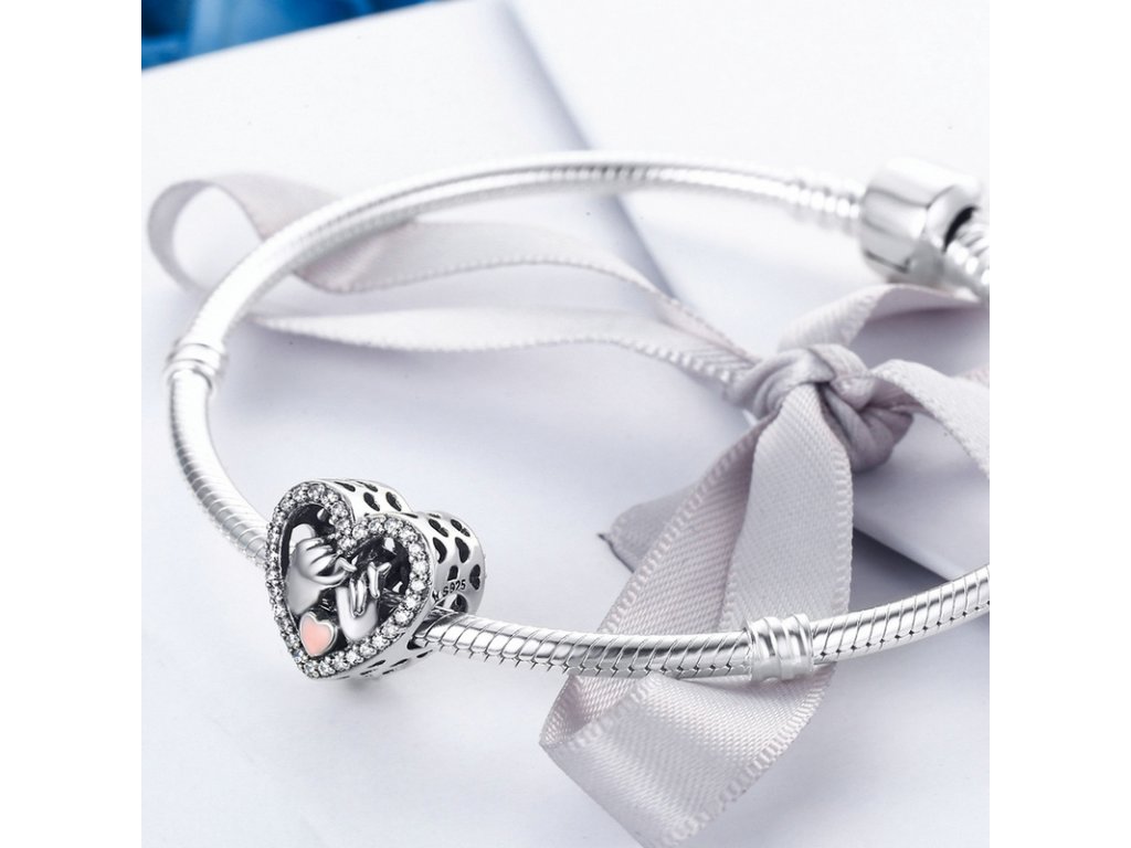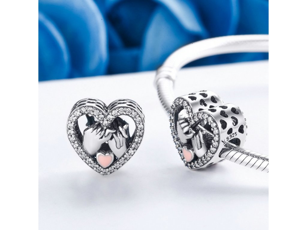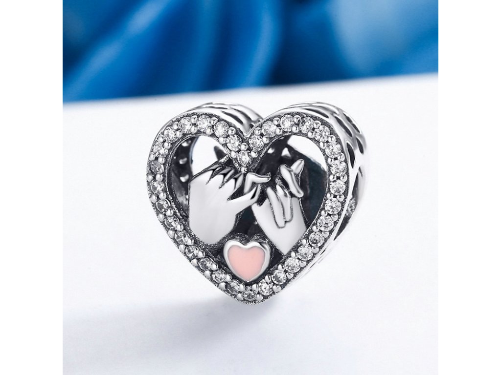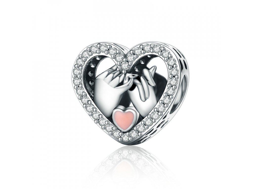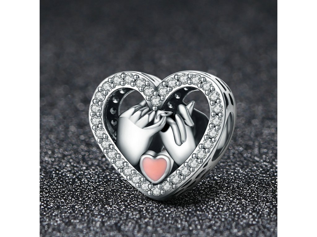 - Luxusný prívesok v tvare srdca obohateného ručne vsadenými zirkónmi. Tiež ho zdobí ruky dvoch ľudí, ktorí si sľúbili svoju lásku a malinké srdiečko s ručne nanášanou ružovou glazúrou. Prívesok je po stranách zdobený ručne vyrezávanými zamilovanými srdiečkami.