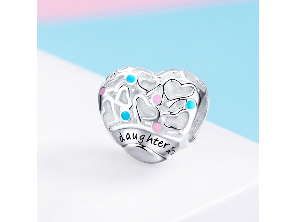- Strieborný prívesok v dizajne Milovaná dcéra v tvare srdca zdobený modrými a ružovými bodkami tvorenými ručne nanášanou farebnou glazúrou. Prívesok je tiež zdobený ručne vyrezávanými mini srdiečkami a anglickým nápisom "daughter" v preklade "dcéra".